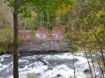 The first stop of the day today was in Franklin, which was close to where I had stopped for the night, and I had read that the town had a nice multi-purpose trail. I didn’t know where it was, but figured I’d run across it by walking around town (note to myself: look BEHIND my parking place, and sometimes what I’m looking for is right there!). Franklin was a thriving paper mill town back in the day, but now there are some empty storefronts in Main Street. I walked out by the train station – long trails sometimes seem to be along railroad tracks or rivers, but I didn’t see anything. So we then walked around the hilly town, and stopped in the little park at the other edge of town, and that’s when I saw the start of a trail under a train trestle. So Tula and I headed over and it was a wonderful wide path, and it took me a little while to realize it was another rail trail. After about the first half mile or so, I was happy to see a sign describing the “upside-down covered bridge” that was visible a little farther ahead. It was a train bridge (no longer used of course) and all the trusses and supports were beneath the tracks, so they enclosed all of that to protect it from the weather, plus capped the ends, and didn’t have to worry about the iron tracks on top. So it’s the only upside-down covered bridge still standing, even though the planks that covered the trusses are no longer there – some of them was destroyed by fire which they suspect was arson. A little farther up the river were some remnants of the footings of the old mills. With a big fast-flowing river, and railroad tracks, and bustling paper mills, it’s no wonder Franklin was a prosperous town in it’s day. Altogether I walked 3 miles on that trail (and another mile in town) and for 2 of them I could see and listen to the Winnipesaukee River with all it’s whitewater – wonderful background music! And that’s why I don’t listen to an iPod while I’m walking – I want to hear my surroundings!