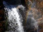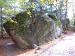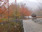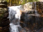 Then, since the sun was sort of out and it wasn’t raining, I decided to head north again into the mountains – I wanted to go to the Flume Gorge State Park. I had heard the trail through the gorge was spectacular, and although it’s only a 2 mile hike altogether, it involved lots of hills and lots of steps – walking down into the gorge and back out. So I got my ticket for the walk, and it was cold in the mountains – I had on my fleece, a windbreaker, a hat and fingertipless gloves so I could still take pictures. As soon as I started the walk (they have a bus that take people partway in if they want – but I just walked the whole way), white pellets started falling – I don’t know what it was – frozen snow maybe?? It wasn’t rain; it wasn’t snow; it wasn’t sleet – it was just white pellets – falling fast! The walk through the gorge truly was spectacular, and the park had built narrow boardwalks and steps along the side of the gorge above the river. Up until about the mid-1800s there also was a huge boulder wedged in at the top of the gorge (they had photos of it) and then it came crashing down during a violent storm. Going through the gorge took about the first half of the hike, and the rest was through other parts of the state park, including a huge “boulder garden” – the size of some of the boulders that the glaciers deposited there are pretty amazing. It was such a pretty hike that I decided to do the whole thing again. I was a little tired after the second go-around! Tula had to stay in the car, which was fine – dogs weren’t allowed on that trail for very good reason! The visitor center also had lots of articles about the face if the “old man of the mountain” falling off in May 2003 – it really made a lot of people around here sad. It was snowing by then (real big, pretty flakes) and once again, I knew there would be no camping tonight. I did get to see some mountaintops on the hike though – some bare granite spots up high, and snow up there too.