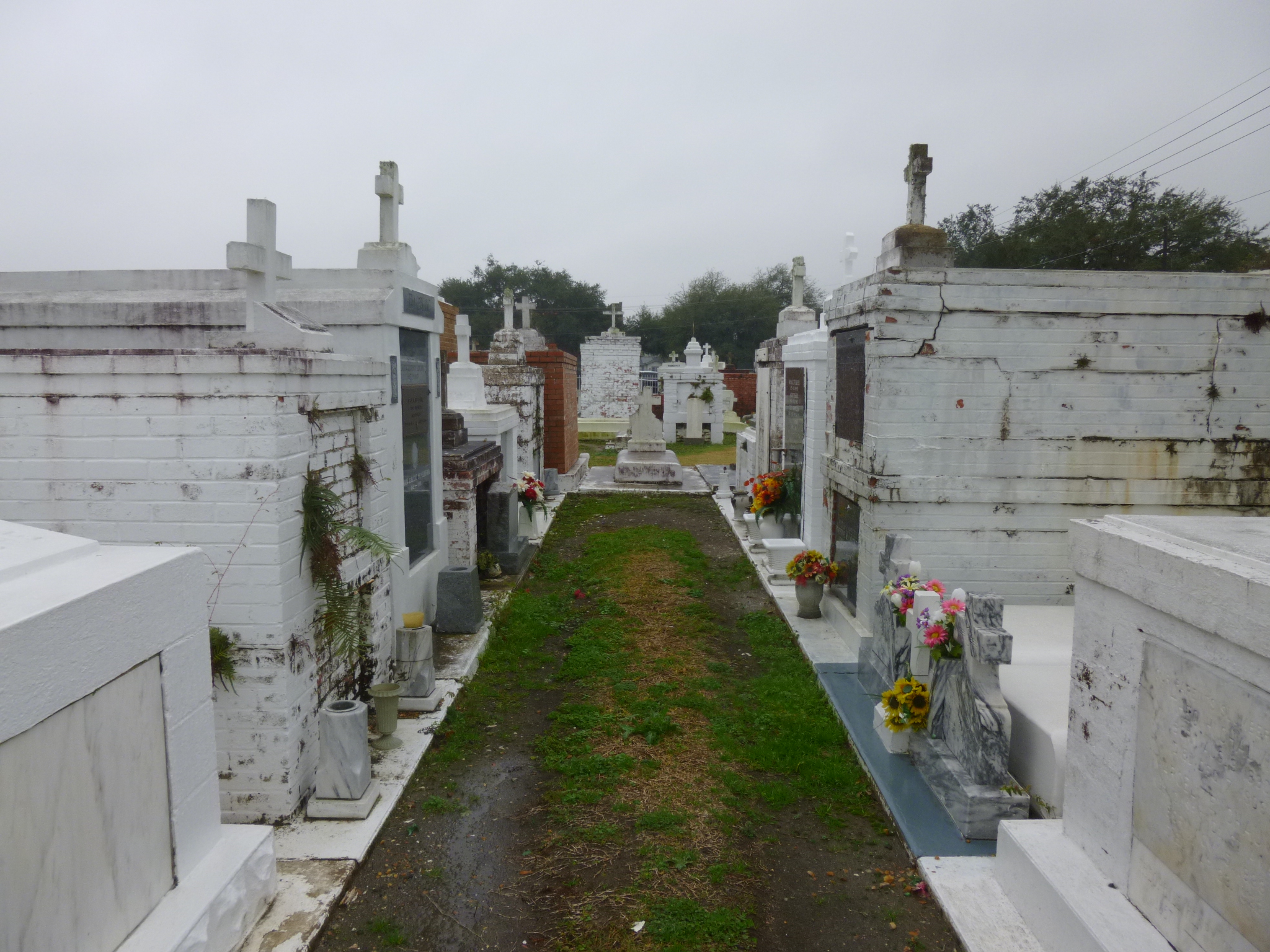 By now it was well after noon, and Tula and I hadn’t done any walking. So I found a different place to park, and we got out and walked thru the historic area of town, and then down one of the long main streets – we got nearly 3 miles in, and made it back to the van right as it started to rain again. From Thibodaux I headed south to Houma, which has a lot of bridges because of all the rivers and bayous. Back at the food pantry, Melodia had told me about several deserving organizations I could donate to in Houma, and if I hadn’t seen Habitat for Humanity, I would have donated to one of them. But all my Louisiana donations are done. It was raining lightly in Houma, so I left Tula in the car and put on my rain jacket and got a couple more miles of walking in. I went past another big cemetery with the above-ground tombs and crypts – so different from back home.