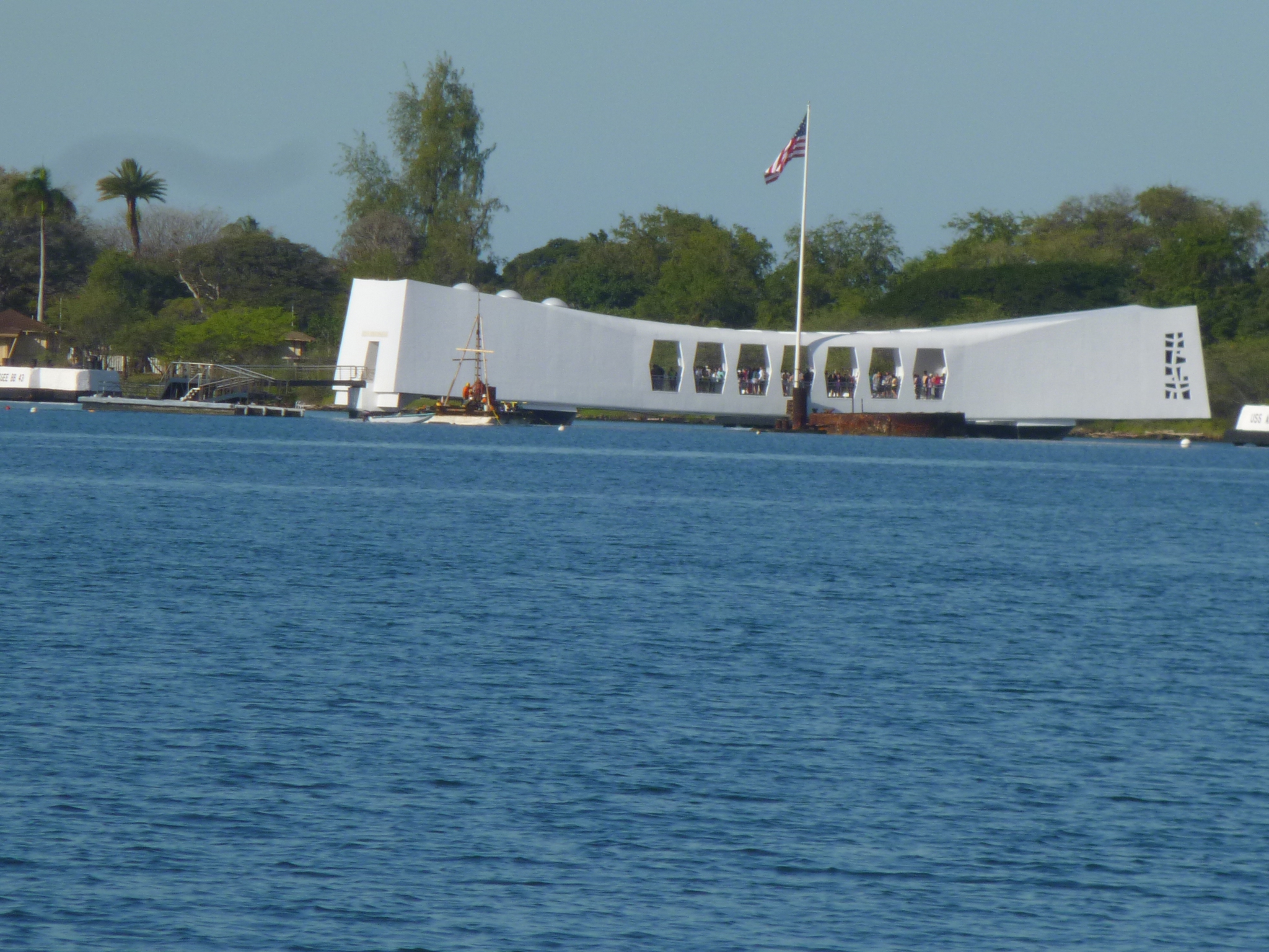I hadn’t decided yet if I wanted to rent a car, but it was still too early anyway. I had read that the USS Arizona Memorial at Pearl Harbor opened at 7:00, and there’s a limited number of passes they give out for the boat over to the memorial, and sometimes they run out by early afternoon due to the crowds. I decided to tackle the bus system to get out to Pearl Harbor first thing, which was quite a ways away. One of the front desk people was kind enough to walk outside and point me in the direction of the bus stop I would need, and said it was a bit of a walk down the street. I told him it didn’t matter how far it was – I’m used to walking! So I was out looking for my bus stop by 6:30 in the morning. But I walked right past it – it was only a half block away which didn’t seem like a bit of a walk to me! Even at that hour with the sun just coming up, there was lots of traffic, people out jogging before the heat of the day, and lots of commotion. The hotel is right next to an enormous shopping mall, and there’s parking structures, and a big bus transfer place and lots of traffic. Honolulu is the giant hub for business, commerce and travel in the whole South Pacific and that became apparent quickly. I decided then and there I was not going to rent a car. In the end I walked nearly a mile and a half to get to the correct bus stop – there’s a lot of different bus numbers and routes, plus you have to know which direction you’re going. But, as I discovered, the public bus system is efficient and prompt and very reasonable. A lot of people use them. Because of all the stops, it took about 40 minutes to get out to Pearl Harbor – nearly twice as long as driving it would take. There were lots of people already there, but lines weren’t bad, and I got my pass for the memorial, and had time to look in the museums before the video part of the excursion. The video was really good – it is truly astonishing how the Japanese were able to pull this off. Some soldiers watching the radar had actually noticed a huge spike in air traffic shortly before the attack, and reported it to their supervisors, who said “It’s probably nothing” since some US bombers were due in that day and he figured that’s what it was. I doubt there would have been time to do much had an alarm went out, but maybe some of the fighter planes could have gotten off the ground instead of being picked off like dominoes on the field. The video footage is awful, and I just can’t imagine the horror of those 2 hours. Then we took a navy launch out to the actual memorial, which was built cross-wise over the sunken Arizona. (All but 3 of the stricken battleships eventually went back into service, but the Arizona had been hit where all her ammunition was and she went down quickly with most of her crew.) The Arizona sank in shallow water, and is visible just under the surface – rusty, and turning into a coral reef. It is a tomb – the 950 or so men who went down with her are still inside. She carried a crew of over 1100, so not many survived. So far, 36 of those survivors made the request that upon their death, they wished to be returned to the USS Arizona to be entombed with their crew. The Navy honors those requests. After nearly 70 years, the Arizona is still leaking oil, drop by drop. I asked one of the rangers if they had any idea how much fuel was still left, and they guesstimate there’s still a half million gallons, and nothing can be done about it since it’s a tomb. It’s a very touching memorial to visit and just makes you stop and think what this country went through in WWII. There were many walkways and other explanatory exhibits, and I wandered around all of it. Then I sat in the Contemplation Circle and wrote out a donation check and a little note saying the donation was in honor of my dad’s 2 brothers who survived the attack on Pearl Harbor. Then I went out and caught the bus back – this time we went through the huge Chinatown, which seemed like a foreign country!