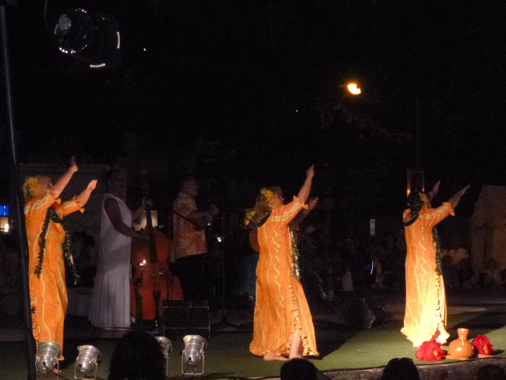 Because of my early start, it was only about noon, and I quickly tried to put together a rough plan for my remaining time in Oahu. My sister had told me about a nearby snorkeling place, and there was actually a coupon for it from a book I got in the lobby, so I called them up to see about snorkeling. The bay is near Honolulu, and the lady told me it’s always closed on Tuesdays, but had been closed a couple days before that due to bad weather, so Wednesday was very crowded, but she had room on her 7:15 pickup route, and the early time would also mean avoiding long lines. So I had her put me on the list for the morning. And that left my afternoon free to walk out to Diamond Head State Park and climb the volcano. I got various opinions as to how far away it was, so I just decided to head out and see what happened. My hotel was in the business district, surrounded by skyscrapers blocking the ocean view. After a mile or so of walking, I got near the Waikiki Beach district – which was packed with towering hotels, resorts, expensive shopping areas, and lots of restaurants and cafes. It was crowded and noisy and I couldn’t even see the beach at first because of all the highrise hotels. But it was kind of a fun street to walk down because the sidewalks were like boulevards and there was lots to see (except the ocean!). There were people carrying surfboards in swimwear, and people dressed to the nines shopping in the boutiques. As I continued to walk, I passed the main hotel area, and then I was by the beach. It was a pretty day, and lots of people were out enjoying the sun and water. Diamond Head didn’t look too far away from the end of the beach area, since it was kind of towering right there, but…looks are deceiving, and it was still a bit of a walk, which didn’t matter. It was a pretty afternoon. After the Waikiki Beach area, the road led through more of a “real” Hawaii area, since it was away from the tourist zone. I walked past neighborhoods, and schools, and the everyday shops that the residents would use. Diamond Head is big, and the state park encompasses a lot of land. Naturally the entrance to the state park was on the far side of where I was coming from! But I got there, and they only charge walkers $1 to get in. Then the climb began – gentle at first, then getting steeper, then zigzagging up the side, then lots of stairs, then a 99-step flight of stairs, then a tunnel, then 2 narrow spiral staircase, and voila! you’re at the top! I had to stop and rest several times along the way. The view looking down at the ocean, and looking over at distant Honolulu and Waikiki Beach was beautiful. It was obvious that we had climbed up the crater of a volcano, and it was rimmed with some jagged edges, but it wasn’t black and full of hardened lava rock like I had imagined. It blew its top ages ago, and grass and weeds have taken over, plus the army has some sort of military installation in the crater. The floor of the crater is about 175 acres, so it’s big. Definitely an impressive view! On my walk to the state park, a mother and her daughter (Tracy and Joelle) had passed me, also walking to the state park. And then we kept running into each other on the route to the top, and in the end, we walked back to the Waikiki Beach area together. The sun was just about to set as we got to the beach, so we watched that although clouds prevented it from being a perfect sunset. They invited me to join them for dinner, which was very kind, but by this time it was nearly 11:00 my time, and I still had a couple miles to walk, so I thought it best to just keep going. I figured I’d grab a quick bite from some stand to eat as I walked. I walked on a bit and found a crepe stand, and got a mango crepe, which they put into a paper cone for easy eating. As I was walking away with that, I heard some Hawaiian music, and saw people going into a park across the street, and it looked like there was a Hawaiian dance performance starting up, and I couldn’t resist going over to watch, even though I was tired.