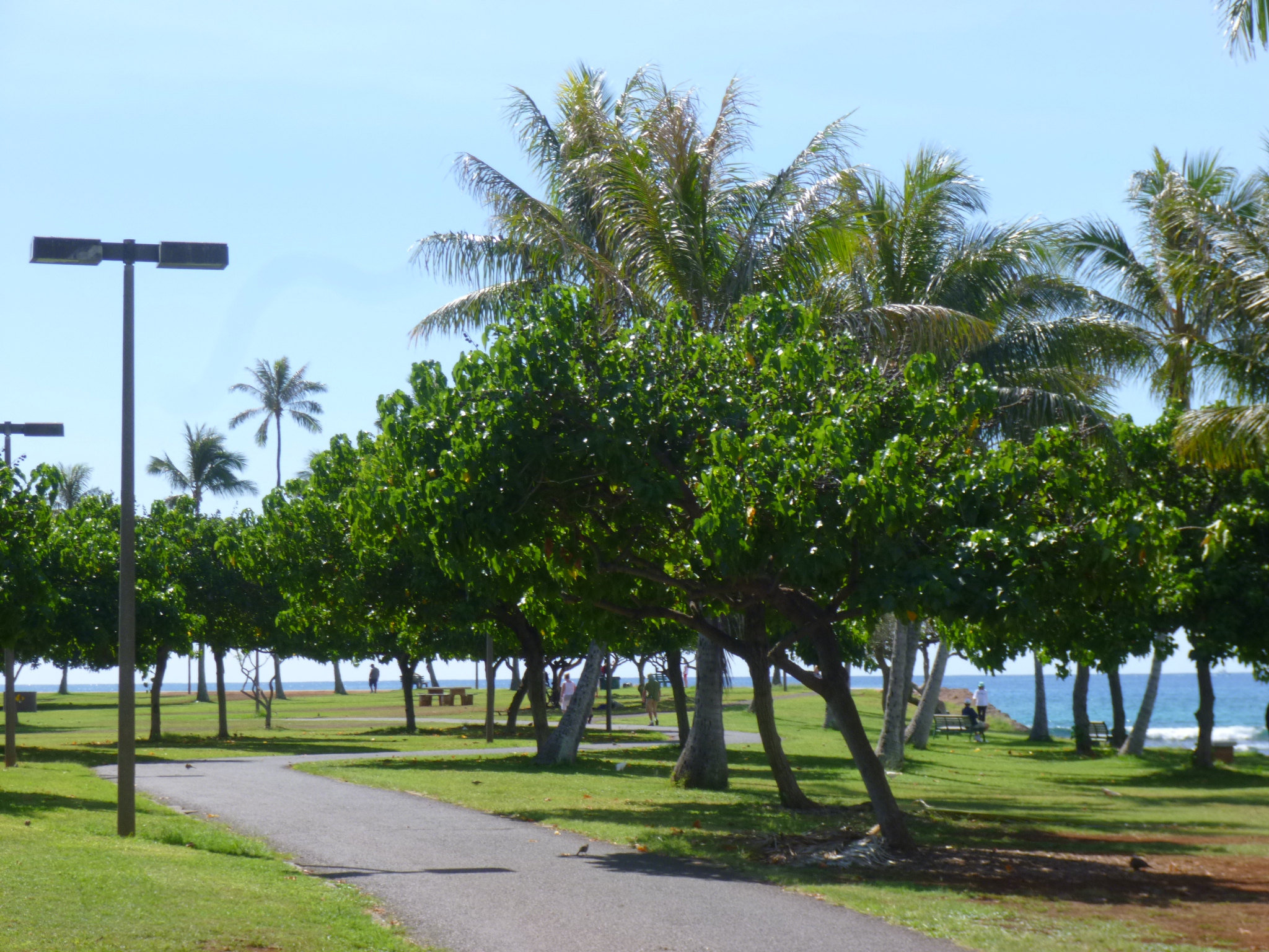 I headed back to the hotel out along the ocean instead of the back way, and came upon a huge park, where I was able to walk for miles on walkways by the sea, and beaches. There were lots of trees, and it was just do beautiful – just the sort of place I’d been imagining in Hawaii! I think this beach area is bigger and prettier than Waikiki, especially without all the commercial stuff and all the hotels. It wasn’t crowded at all – just acres and acres of green grass and trees, and paths and sandy beaches and blue sea and skies! I walked nearly 4 more miles all around the area before heading back to the hotel to get the taxi to the airport.