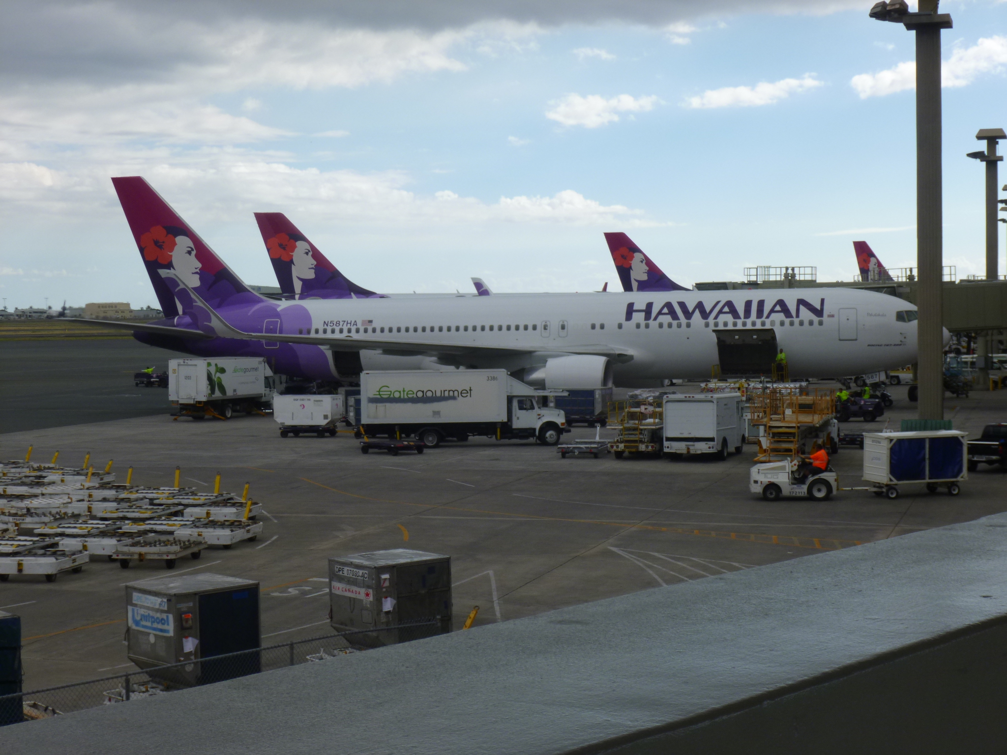 I had a voucher from American Air for my taxi back to the airport, and I was going to get there very early to not miss the Samoa plane! My driver was Vietnamese, and we started out fine. Then we ran into some major construction and he got a little dramatic about that, and the possible delay. That made me a little nervous. We waited in traffic for a while, then he veered off in a different way, and we ran into a bit more traffic, and about the time I became more concerned, I could see the airport. Whew! I got checked in and all went well. I had to wait a bit – some of the waiting gates for Hawaiian Air are sort of open-air – like buildings with ceiling and halls, but they’re big enough that they don’t always need walls, so you can feel the nice breezes. It’s just kind of different from the airports back on the mainland!