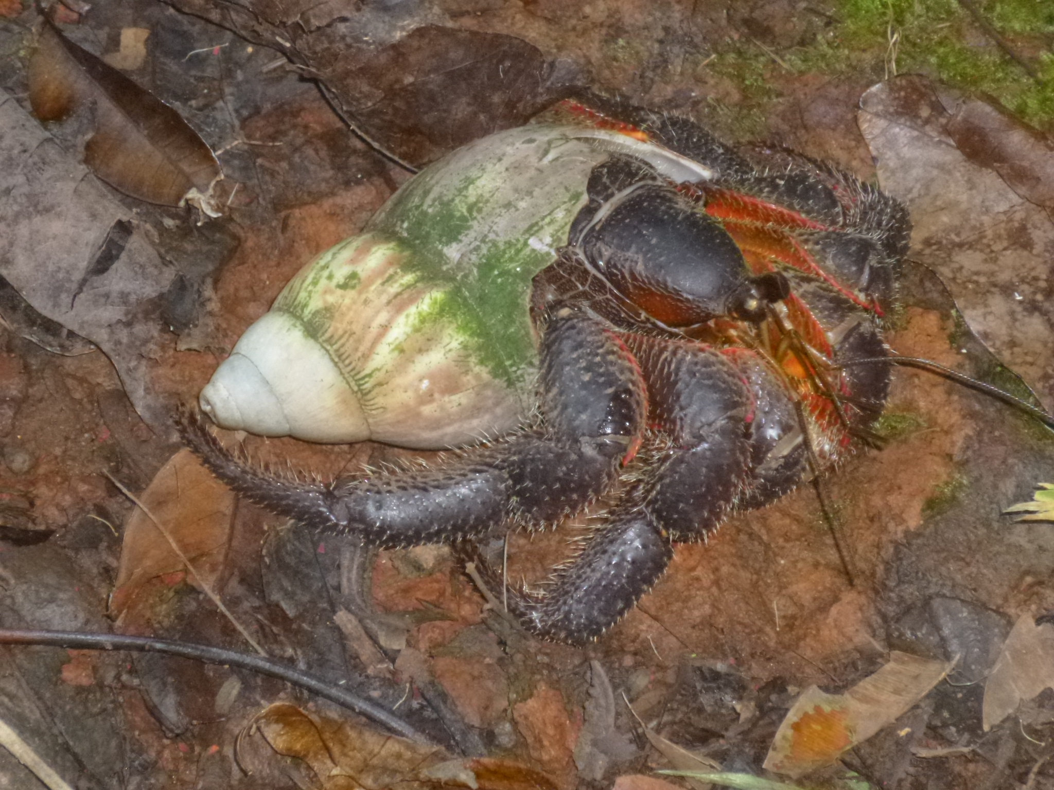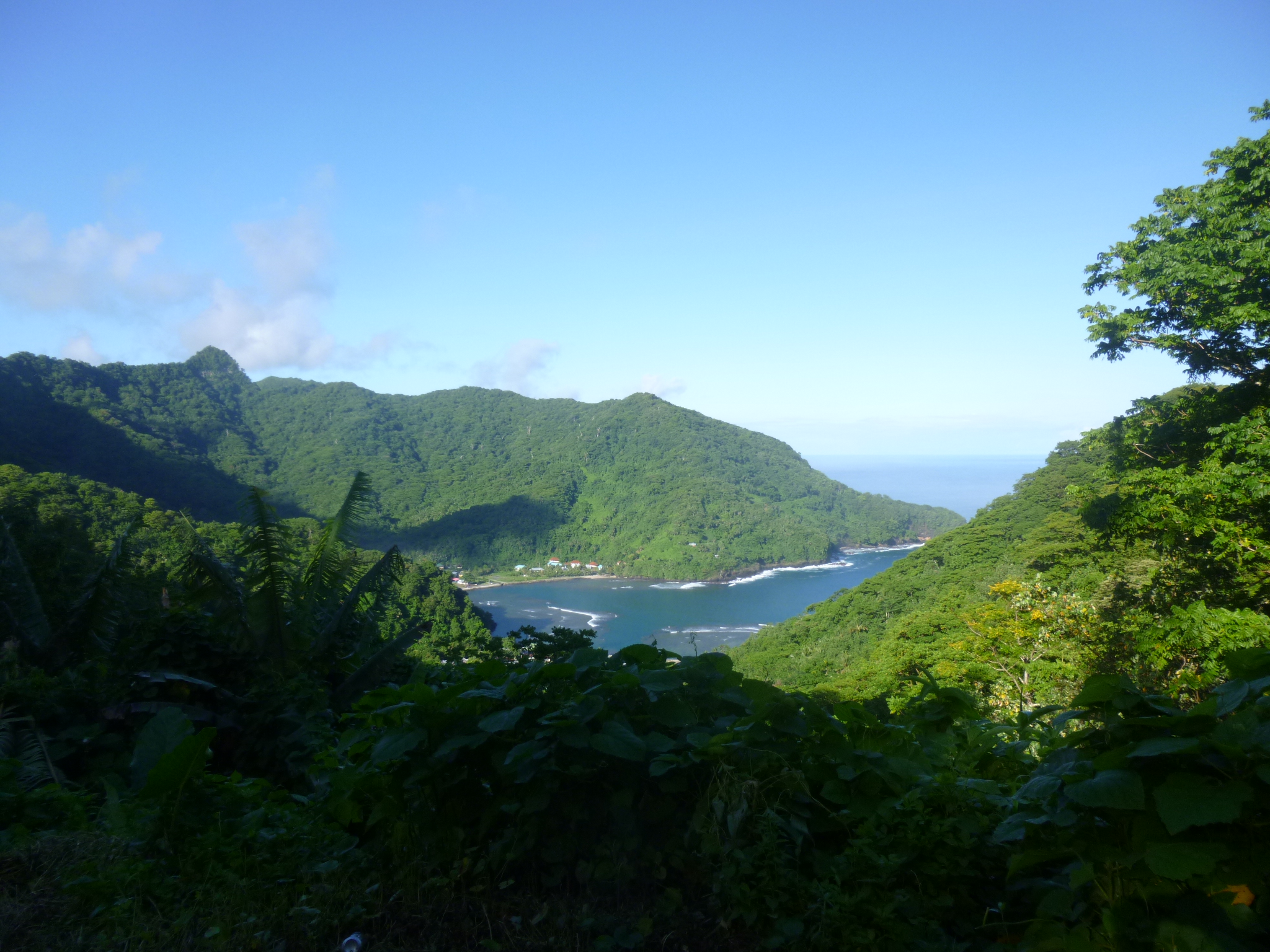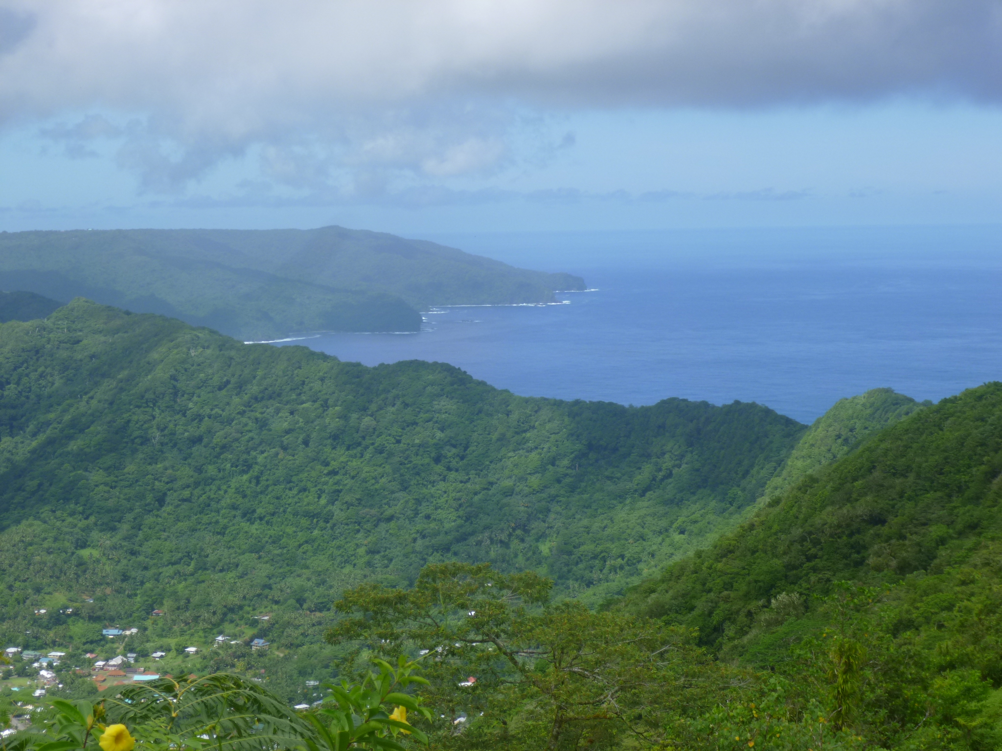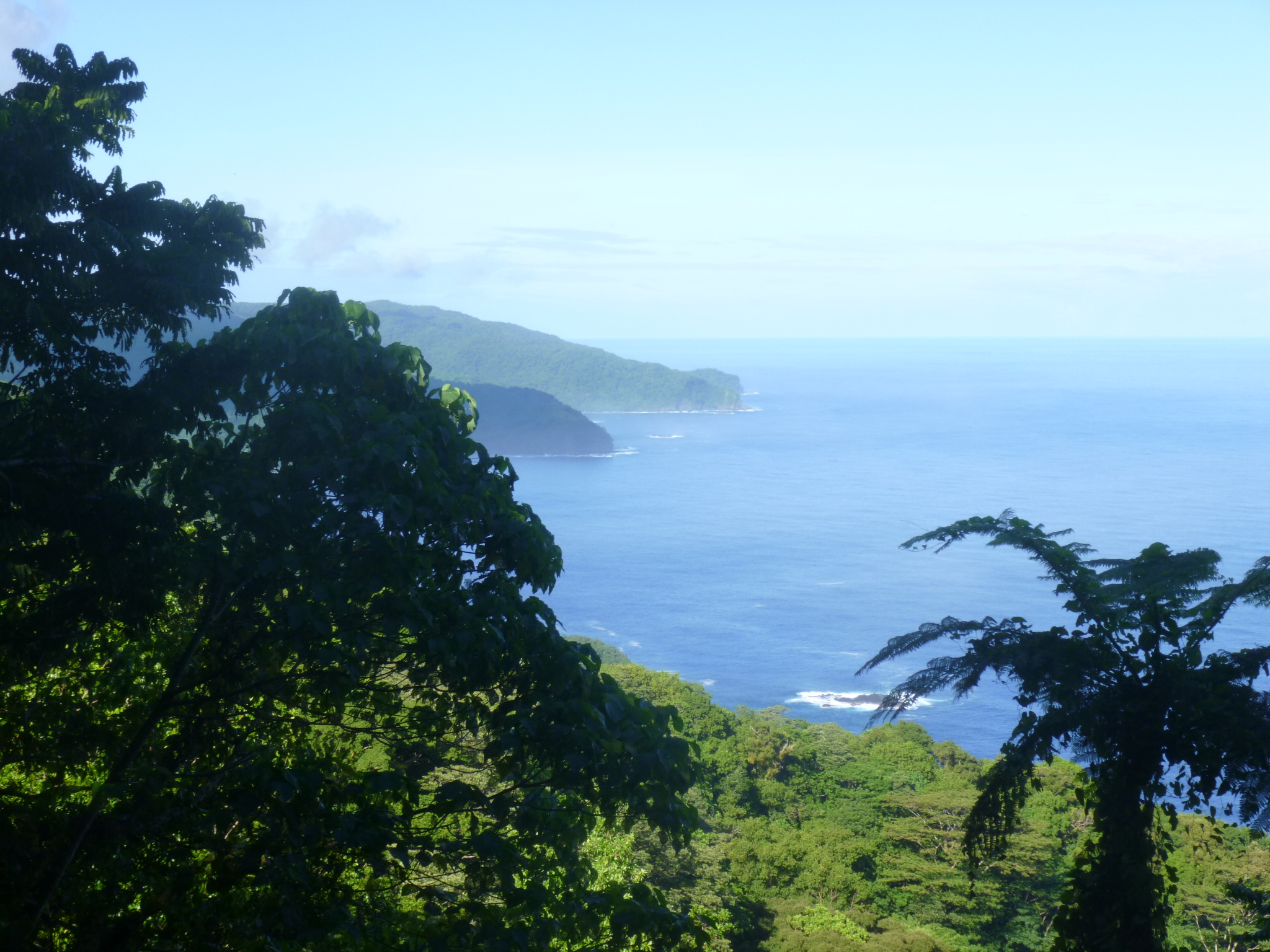 I was out the door by 7am to head for my 7 mile hike in the rain forest. First I walked up to the marketplace, and had to ask around to figure out which bus was going over the pass where the trailhead is. I did not pronounce the name of the village correctly, and quickly learned that many times where there’s a “g” in a word, it often has a “ng” sound. Plus different syllables are accented than what I would think – and there’s lots of vowels and they all need to be pronounced! So I went to the wrong bus stop first; talked with someone else and they sent me back across the street (which seemed logical to me); and then someone told me I’d be looking for the only white bus on the island. I had to wait quite a while, but a white bus pulled in and was going where I needed to go. The bus fare is inexpensive – adults pay $1 when they get off, and students seem to pay 50 cents and young kids pay 25 cents and the little ones don’t pay anything. The buses are small – maybe 8 or 10 rows of wooden seats (some have thin cushions)and they have a little storage space up in the front if people are bringing groceries or packages home. They also seem to be used as a delivery service – we made an extra stop where a lady was waiting for a box. We got up to the pass and there was already a beautiful view of the bay down below. It was about 8am when I started my hike – armed with lots of water, a sandwich for the top and some trail mix. It was already hot out, but since I was going to be walking up the ridge in a rainforest, I was in shade most of the time, which was a relief. I don’t think I would have done this hike if it was in full sunlight the whole way. There were lots and lots of birds, but because the foliage was so dense, I couldn’t see any of them! I could hear whirring of wings, and lots of different bird calls, but didn’t see one bird! Of course, lots of the time I was keeping an eye on my footing – it was muddy in places and a bit rocky in places, plus I had my hat on which restricts my view just a bit. The trail was wide enough for a vehicle to fit through, although no vehicle could have gone up that trail today. It was grassy in places and I would get tantalizing views of the ocean and little islands. The trail had some steep parts too where I would have to stop and catch my breath – up and up and up! I almost stepped on a pretty shell and discovered there was a big snail in it! And a little farther in I saw a good-sized crab in a shell scuttling along! That surprised me because I thought crabs needed to be near water (later I learned about coconut crabs – they live on coconuts and do not need to be near the water – the adult crabs can open coconuts with their claws, and no human can open a coconut with their bare hands, so those claws are very very strong.) I kept going, passing old banana and coconut plantations, and enjoying the views. I was heading to the second tallest peak and there are radio towers up there. It took me nearly 2 1/2 hours to climb the 3 1/2 miles, but the radio towers came into view, and there was a long metal stairway up to the last national park plaque, describing my view, and it was magnificent. I could see the ocean on both sides. One of the brochures had said there would be a traditional Samoan resting hut at the top, and I was looking forward to sitting a spell and eating my sandwich and banana, but there was no hut. Only the metal staircase, and next to that some sort of pulley system to maybe haul supplies up the last steep part. I took a good 20 minute break up there, feeling like I was on top of the world! There was no shade at the very top (which is why I could see so far) and I felt like I was beginning to bake, so it was time to head down. It took me almost as long to get down as it did to climb up. I think I actually prefer climbing up steep spots rather than going back down them. I took my time to not slip in the muddy parts – its easy to get going a little too fast. I didn’t have to wait long for the bus to come by again and even though it’s not a usual stop he picked me up. He continued into the little village of Fagasa on the other side if the pass. There were the usual homes and a church, but I also saw several big, sturdy-looking tents, and wondered if they were just some extra living spaces. I found out later that those were FEMA tents – provided after the tsunami of 2009. Which reminds me, there are dozens and dozens of tsunami signs – warning when you’re in a potential tsunami-prone area at lower elevations, and then signs at the appropriate elevations when you’re out of the tsunami threat area, and even some signs for tsunami gathering places. I can’t imagine the chaos of only having a few roads that go up and over the mountains (which is where everyone would flee)and having the vast majority of islanders living down by the water.