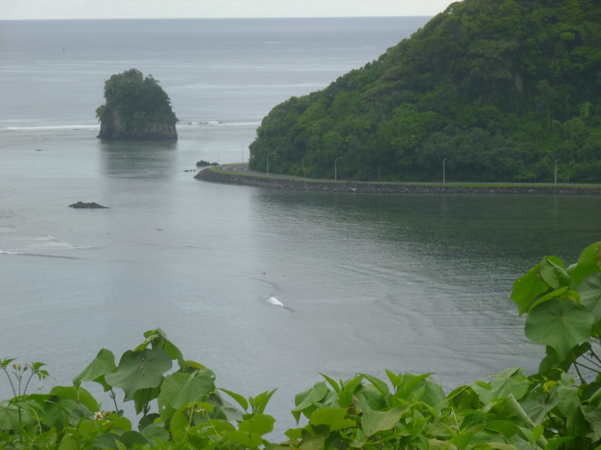 It was about 1:30 when I got back to the motel – and I was hot and tired. There’s a pool area out in the back, near the little private beach, and it sounded like some sort of high school party was going on. Kids were playing games, and swimming (mostly in their clothes), and I asked one of the handymen what was going on. It was a Tatou, which is like a party where people can get “live” tattoos (which I guess means have them done in front of the gathering)- lots of Samoans have traditional Samoan tattoos, get some food and listen to music. This had started a while ago, and I didn’t see anyone getting a tattoo (not sure that’s something I’d want to watch anyway!), but I was able to get a good BBQ meal right before they closed up – I think this was a lunchtime event, and I got in on the tail end. It was kind of like an early dinner for me! But I had some good grilled fish (mahi mahi I think), and chicken and sausage, and lettuce and tomatoes, and a couple things I couldn’t quite identify. One might have been raw tuna in a coconut milk sauce. It was okay, but the texture was strange – I just don’t think I’m a raw fish sort of person! So that revived me, and then I read a bit until the sun wasn’t quite so hot, then I got a second wind, and headed about a mile down the road to walk on a short national park trail by the sea, to see where an old cannon from WWII days was. I thought the trail would be flat since it was by the ocean – silly me! Of course they would want the cannon up high to help protect the harbor. Pago Pago harbor is one of the deepest natural harbors in the South Pacific, and although American Samoa didn’t turn into a WWII battleground, there was still a big American military presence as they guarded the bay, and it was a good re-fueling location for other maneuvers in the south seas. That wasn’t a long trail, but I ended up with another 10 miles of walking for the day. I went back to the motel and took another quick dip in the ocean to cool off, then tried to do some stuff on the computer, but I’m finding I need to be in the office for the wi-fi to work, and this is when I began to have problems with the laptop – Firefox crashed, and Internet Explorer was being temperamental. So I decided that was enough for one day, and hoped the computer would work in the morning!