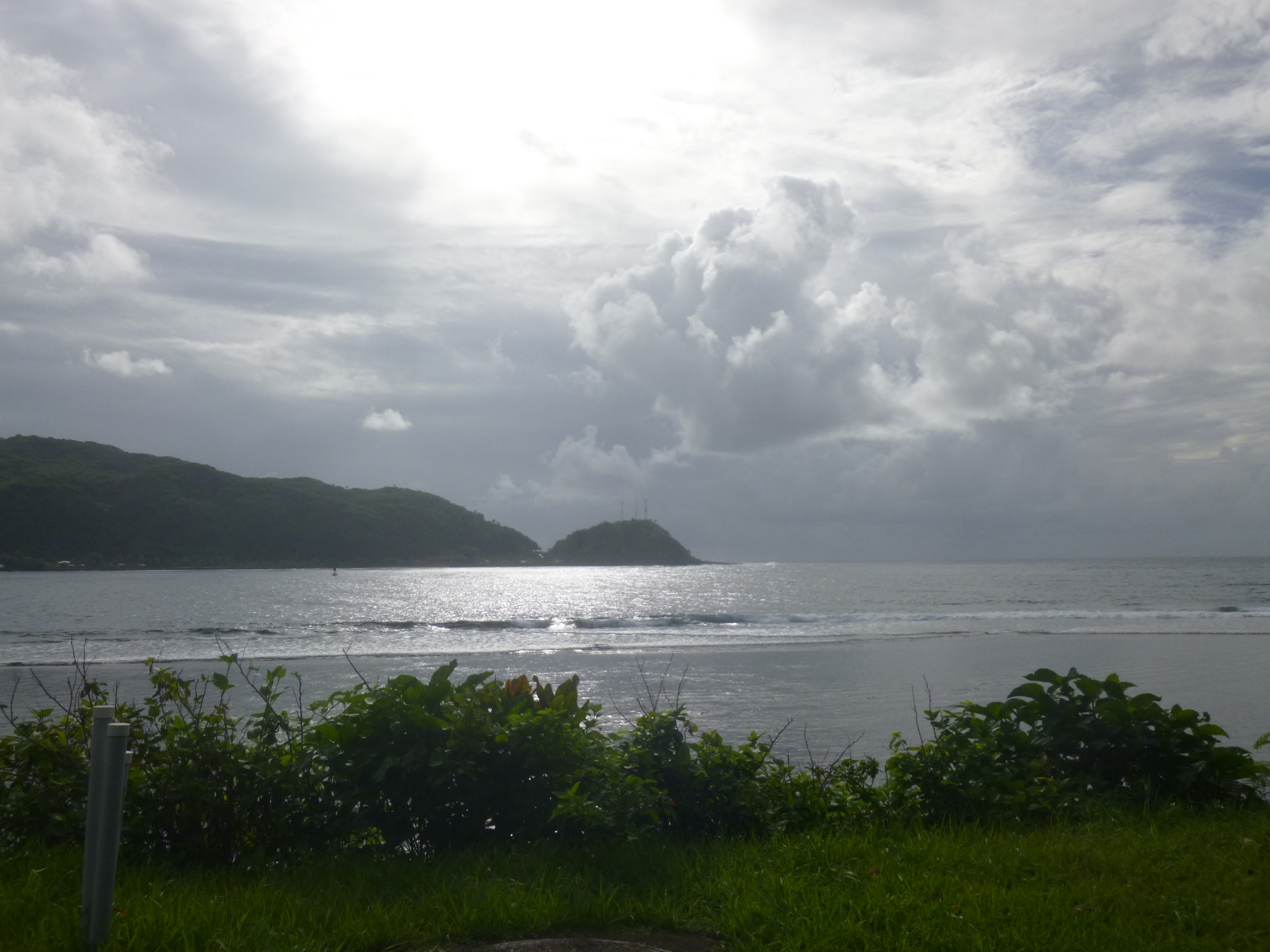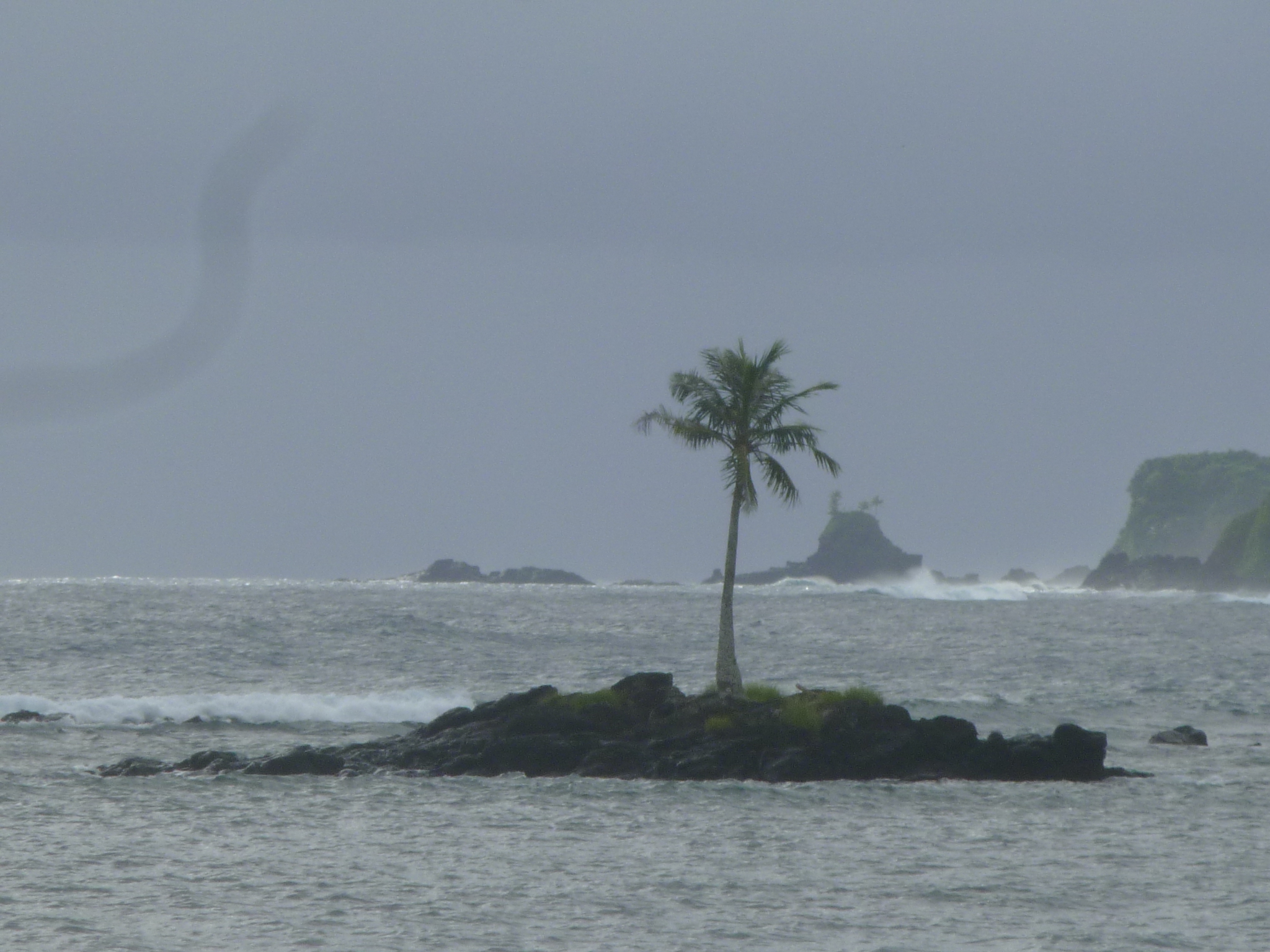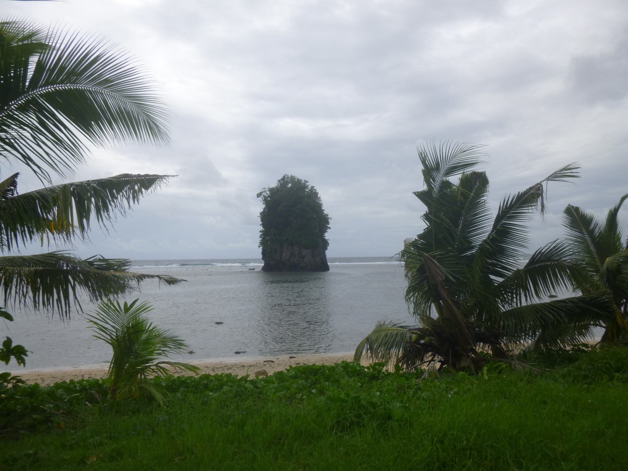 Then it was time to head to the village of Leone on the far west side – I wanted to see the Tsunami Memorial. It was a crowded drive there, and some construction work was going on, but the memorial was very pretty. There were pictures of the victims, and instead of calling the day they were born their birth date, they called it their sunrise date. Then I wanted to follow the road to its end, through the steepest of the mountains, winding around the northwest corner of the island. I don’t think I ever got above 10mph. The road was not much of a road in places – there was grass growing out of cracks, and I thought about how isolated those few villages were. I pulled off to one village which looked nearly abandoned – lots of destruction still apparent from the 2009 tsunami. Although there were some FEMA tents still standing, and laundry hanging out, so I think someone was still holding on to the place. At long last, I made it all the way to the very last village where the road just deadended. There were a bunch of people in one of the community gathering places, and I didn’t want to interrupt anything, so I just turned around and made my way back. It was evening time now, and work for the day was over, so in nearly every village I drove through, there were big volleyball games going on, or games of cricket being played in the street, and kids swimming in shallow protected areas of the ocean, and other groups of kids just sitting together and talking. It seemed like everyone was outside even after the sun set – no TVs and computer games! Even though the clouds were out, the sunset was still pretty, backlighting tiny little islands that only had a couple trees growing on them.