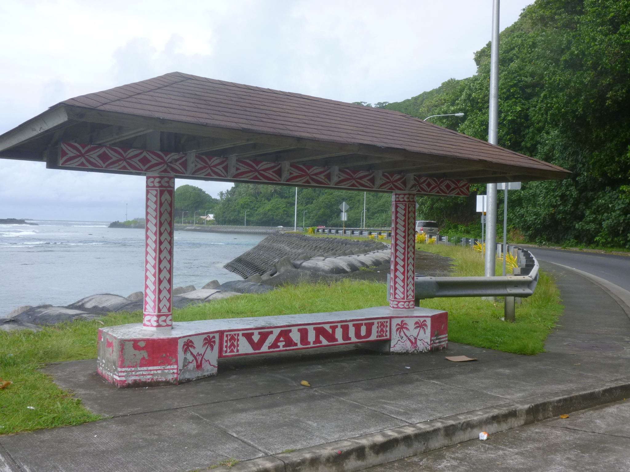 To get to that end of the island, I had to drive the curvy road between the steep mountains and the sea. There’s a sidewalk that runs for miles and miles along the road, and it’s a beautiful place to walk. Sometimes when you look ahead to the next base of a mountain, it looks like the mountain just drops right into the sea, and that there couldn’t possibly be room for a road. There were small villages here and there along the way, and there were lots of kids out doing yardwork. They may have had the day off school, but they were outside working. There was lots of trimming and raking and sweeping going on – I imagine the rain forest would quickly claim back untended land, so there seems to be a lot of work in keeping a neat yard. I even passed a few places where adults were doing trimming (with machete like knives) and burning along the steep hillsides. And, in a few of these villages, I would see little houses perched up high on the side of a mountain – I don’t know how people get up there! And there were clothes hanging out to dry everywhere. There was still talk of a big storm that could hit later this evening, but if it did, it was going to hit the other end of the island, and there was some talk of the storm beginning to veer away. It was quite windy out, and the waves were still spectacular. I would drive a bit, then pull off at a small park area, and walk a couple miles, then move on and do the same. So I did quite a bit of walking before I got to the town of Tafuna.