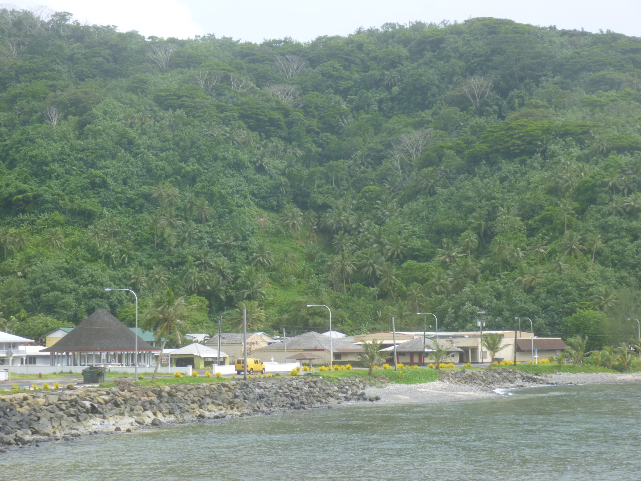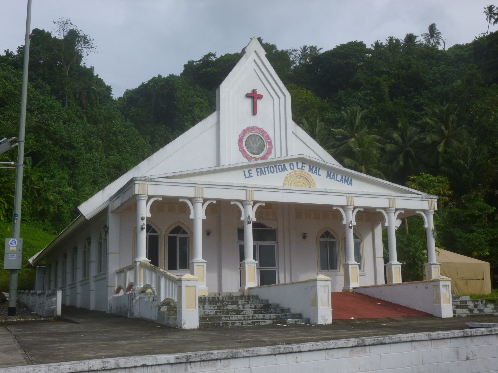 My directions to the Hope House used landmarks, not street names, but I only got turned around once, and while driving around, I saw a Red Cross office, and a Veteran’s Affairs office, which I just tucked into the back of my mind for future donations. And that reminds me – when I was driving through the pretty villages on the east side of the island yesterday, someone had put up a nice sign asking for peace for their American Samoan soldiers. I think on the mainland, we tend to forget that there are soldiers from these far-flung island territories also serving America. Anyway, I eventually found the complex that has the Hope House and a Montessori school for young kids, and there was an enormous cathedral there, and on the other side were some of the buildings for the social services programs. But it was all strangely quiet. I went into the cathedral which was beautiful but silent. There were lots of buildings and I wasn’t 100% sure where to go. I tried a couple of offices, but they had signs on them saying it was lunch break and they’d be back by 1. It had finished drizzling so I just walked through an adjoining area of little townhouses. At 1:00 I went back and still didn’t see anyone. I asked a lady out working in a garden if I was at least in the right place, and she pointed to a different building. I finally saw some people, and there were volunteers helping the older people with lunches. I could see into a few of the rooms, and they looked like small dorm rooms. I at least had the name if a person to ask for, and the volunteers just said none of the staff was around since it was a holiday, so I’d have to come back tomorrow. But at least I’ll know where to go, except I won’t have a car anymore, so I’ll be back on the buses!