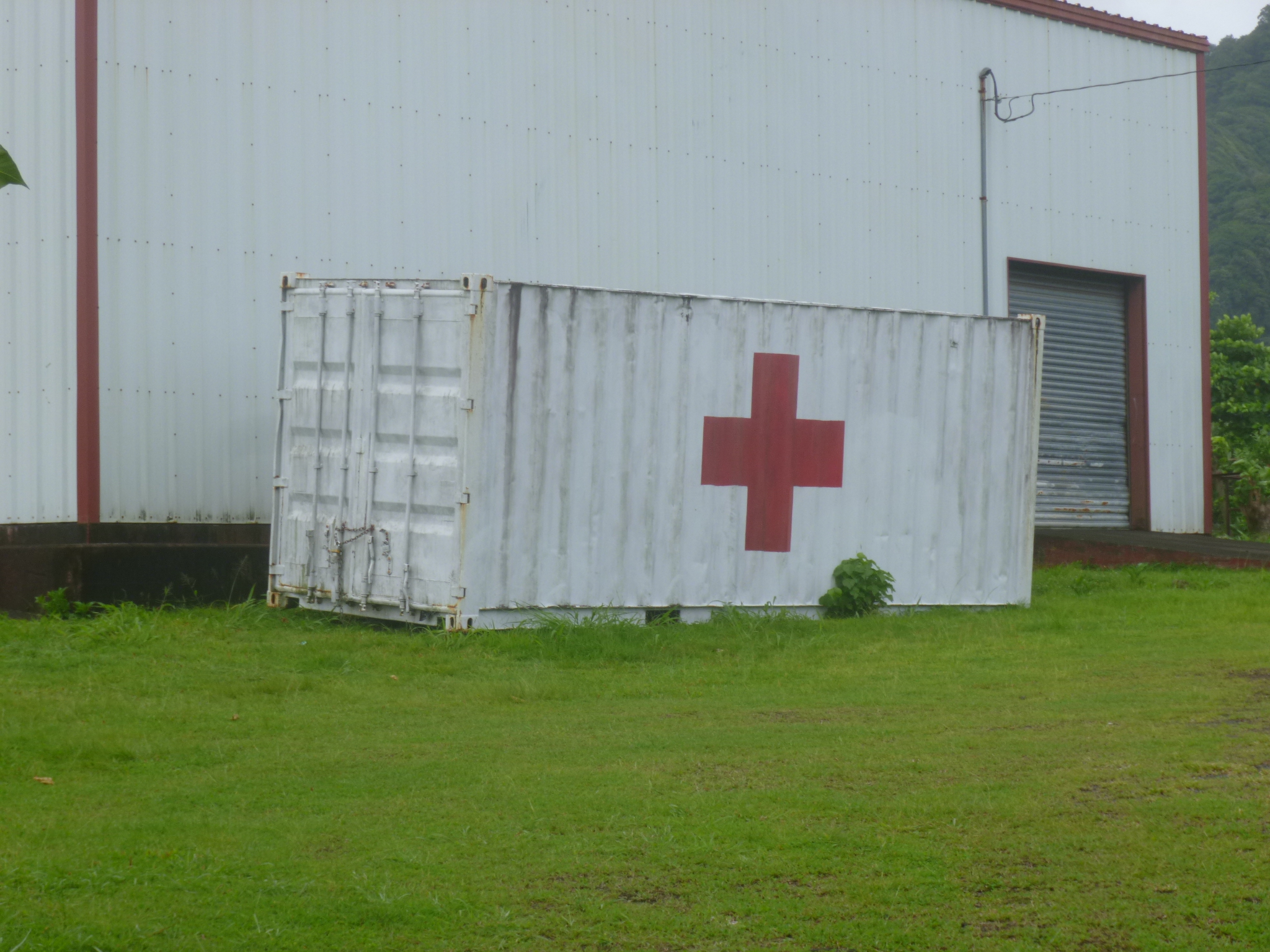 As I headed back into the village of Tafuna, I passed the Tradewinds Hotel, which is the biggest of the 3 hotels on the island, and it’s right by the airport. And there’s even a golf club there. I went by the little Red Cross area, and decided to stop to see if anyone was around. I was taking a couple pictures first, and then someone came out of the office. So I met Val, and he ended up telling me a little bit about how things work in the event of a disaster. At the moment, they were doing some preliminary work, like stockpiling water and some clothes, just in case this storm did hit hard. If that were to happen, the Red Cross people have to take cover like everyone else. Then, when it’s safe to be outside again, they can assess the situation and call for assistance if necessary. When help is on the way, they let the incoming people do their work, while providing the logistics as far as getting around the island and all. It was interesting to hear about it. That morning they had already helped a man who’d had a tree limb fall on his roof because of the wind. Val was interested in what I was doing, and said he would like to mention my story to a newspaper friend of his, which I said would be fine. I made my donation and went on my way – happy to be able to help a tiny bit, especially since there was questionable weather around!