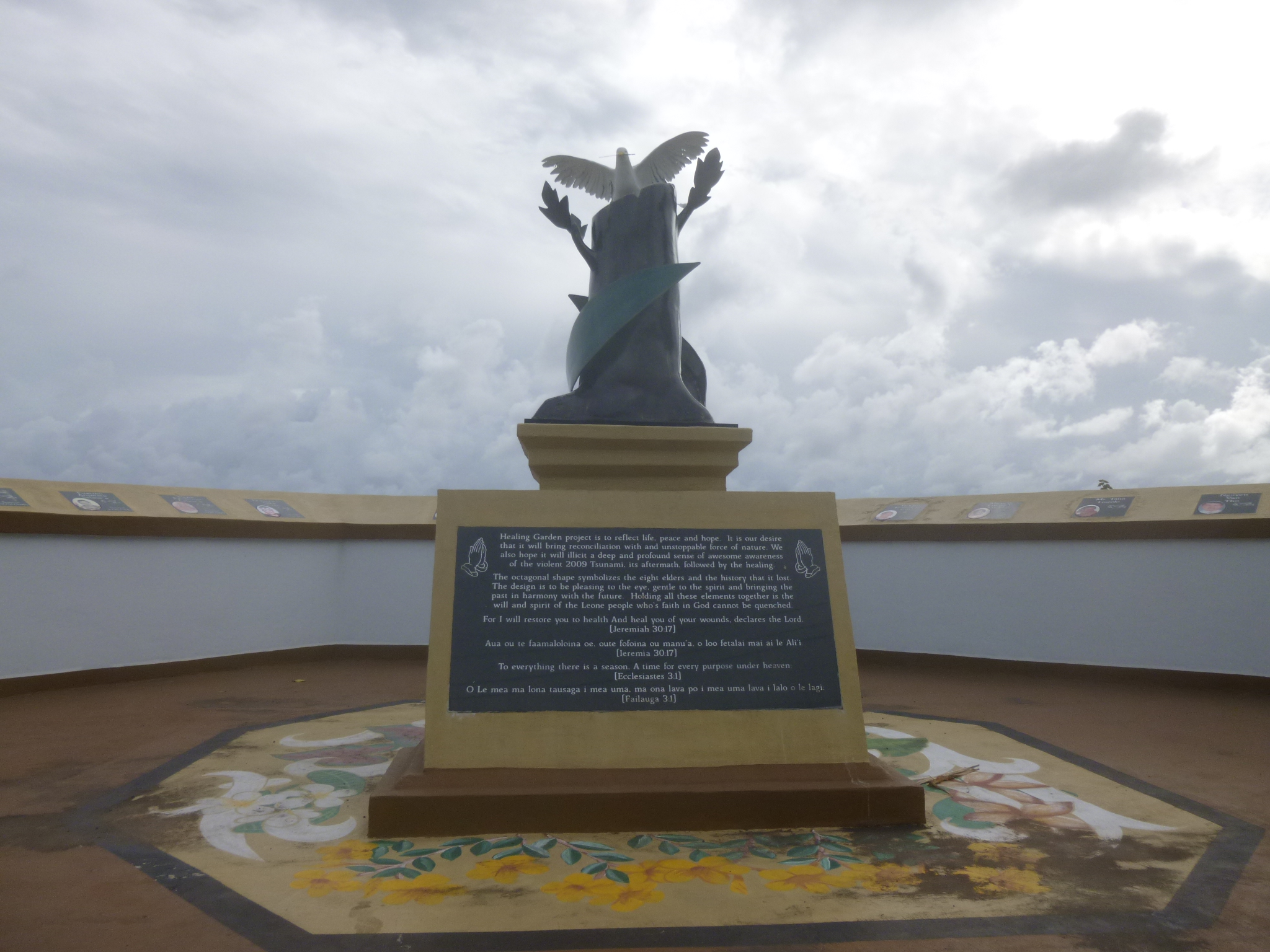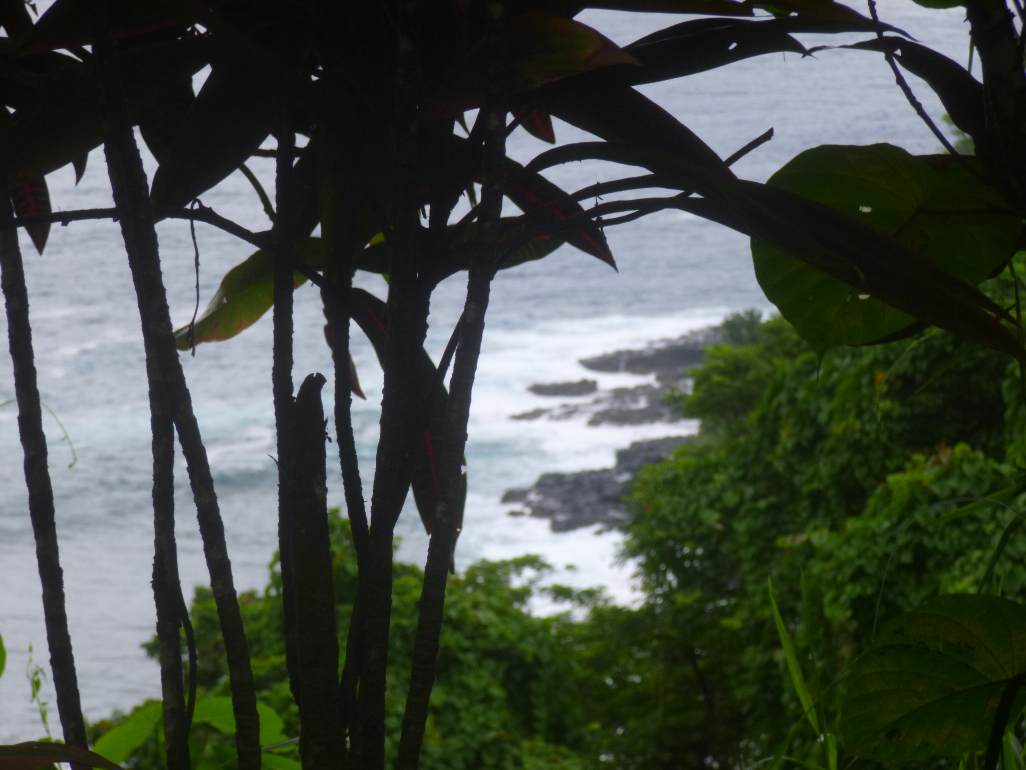 From there I backtracked a bit to a place where I’d seen a road leading to the sea where there was a legend of a turtle and a shark. I didn’t know what this legend was, but if it was on the map, I wanted to go find out. it was kind of a bumpy drive down, but I got to the ocean, and saw a memorial sort of thing, which I thought might tell me something about the legend. But it was a memorial to some people who had drowned, and there was a very nice marker about a Ring of Hope, symbolized by a lifesaving ring to throw out to someone in trouble. I didn’t know where the shark and turtle thing was, and I saw more kids out working in the yard, but one was taking a break under a tree, so I asked her if I was in the right place. The girl said I should go talk to her grandma, and she took me over to her – she was doing something with some tree branches. I told the grandma I was curious about this turtle and shark legend, and not only did she tell me the legend, but she walked me out to the cliffs overlooking the ocean, and proceeded to sing a chant in Samoan for a good 10 minutes, hoping to call in the shark – who apparently frequently shows up! But the waves were very rough, and pounding against the cliffs – we got sprayed hard by one. It certainly wasn’t calm enough to see any turtles, and the shark didn’t appear, but I had absolutely no doubt it was nearby! The lady’s name was Sena and she loves her place in Samoa by the sea – it was incredibly special to meet her. She said when the sea is calm, you can dive from the rocks (although she still swims, she doesnt dive anymore!) She pointed out the tombs of her in-laws, which are in the front yard, and they’re decorated with Christmas lights this time of year. Many Samoan homes have tombs right near the front door our out in their yards – keeping their loved ones nearby. The legend as she told it,in a nutshell, was that long ago, during a time a great famine up in the mountains, there was absolutely no food to eat, so an old blind lady asked one of her family members to lead her down by the sea where they could surely find some food. The old lady couldn’t go by herself because she was old, and needed to have someone help guide her. They made their way down a mountain, and could smell someone cooking something wrapped in leaves. The old lady was ready to eat. Then her companion saw that they had been tricked, and that the food someone had cooked was a rat, and the companion told the blind lady she couldn’t eat the rat. People are supposed to respect their elders, and the old lady was very discouraged to be deceived by this trick. The old lady felt if she was going to be deceived and tricked, then her time on this earth was over, and she asked her companion to leap off the cliff with her. So they jumped into the sea. The old lady turned into a turtle, and the younger one turned into Fonowea the shark. The chant is about calling Fonowea back and asking to see the turtle (who doesn’t seem to have the name), saying how much their family here on earth misses them, and how beautiful they are, and so on and so on. Sena told me she forgot to bring leaves to throw into the sea, which the shark and turtle can use for clothes. It was a wonderful place to stop, and if kids had been in school, I probably wouldn’t have met the grandma! I imagine there are slightly different versions if the legend – one has it that after the grandma and granddaughter flung themselves into the sea, they were indeed transformed into a shark and turtle, and swam around to many places looking to find a new home. They finally found a place they liked, and these villagers were compassionate, and through magic they were turned back into their human forms. But they couldn’t resist the call of the sea, so they thanked the people of their new village for their kindness, and transformed back into a turtle and a shark. But they told their new people that in exchange for their kindness, they could sing the chant, and the turtle and shark would always appear when they heard it. And this is the chant that’s been sung for generations.