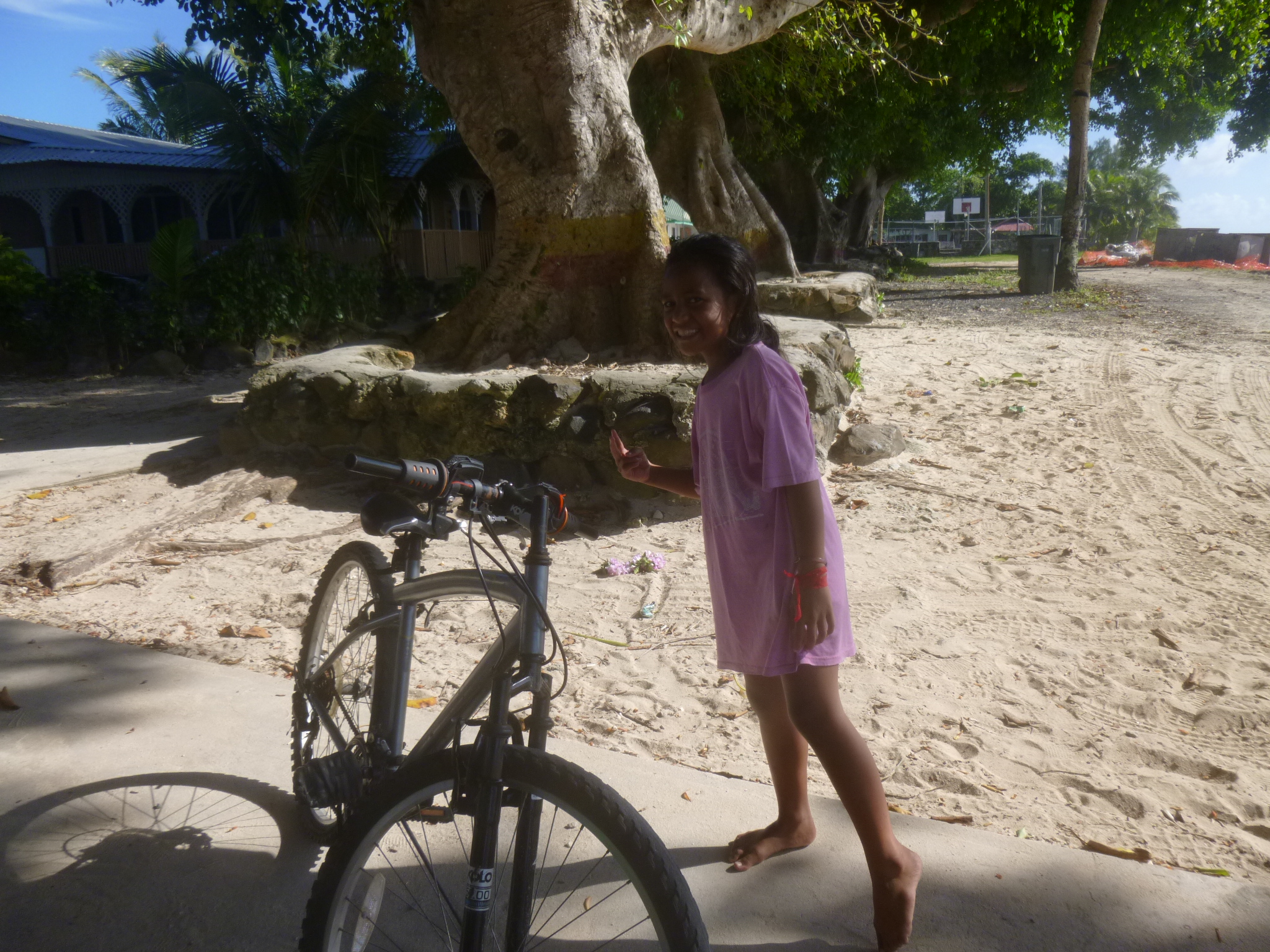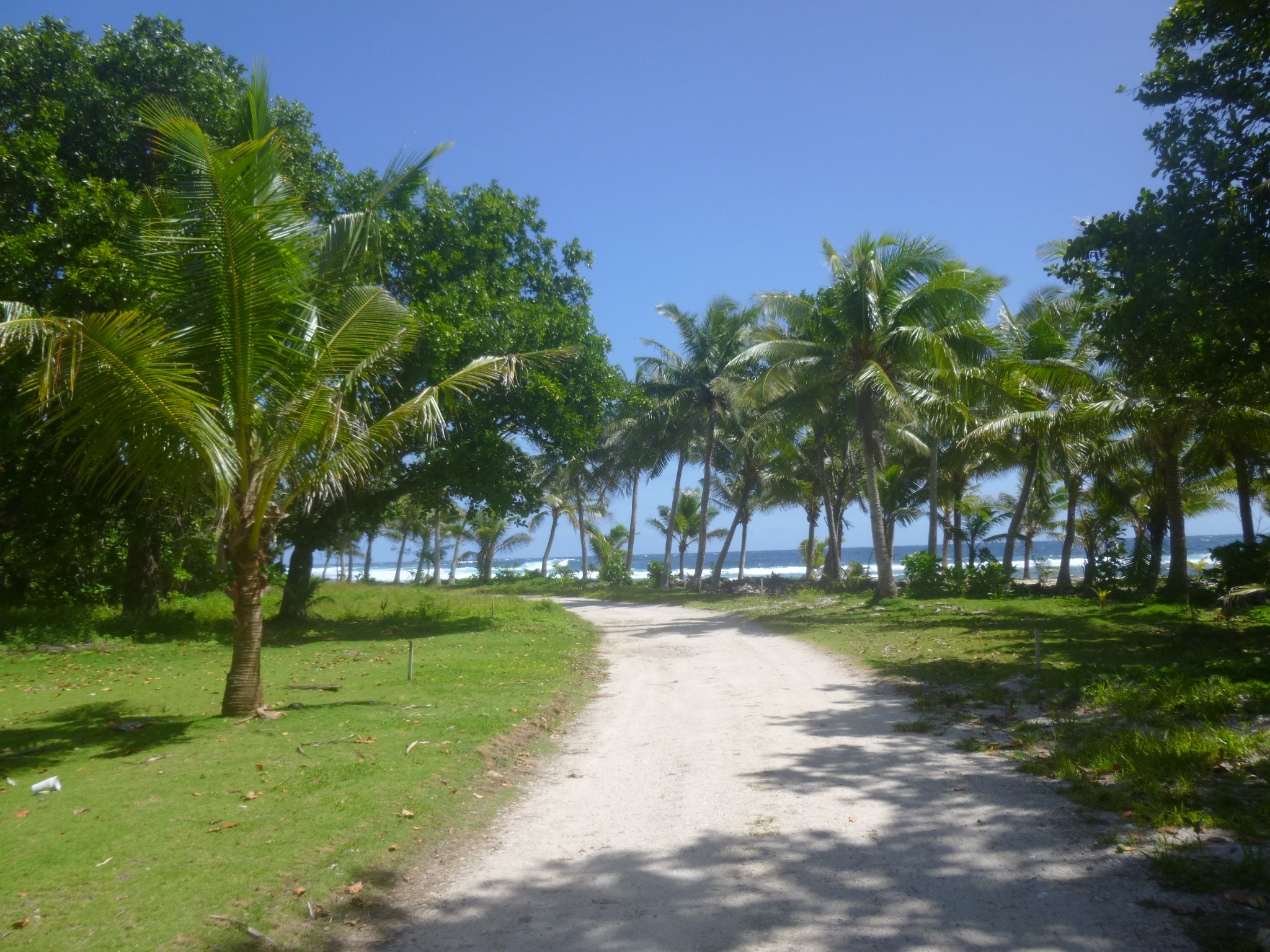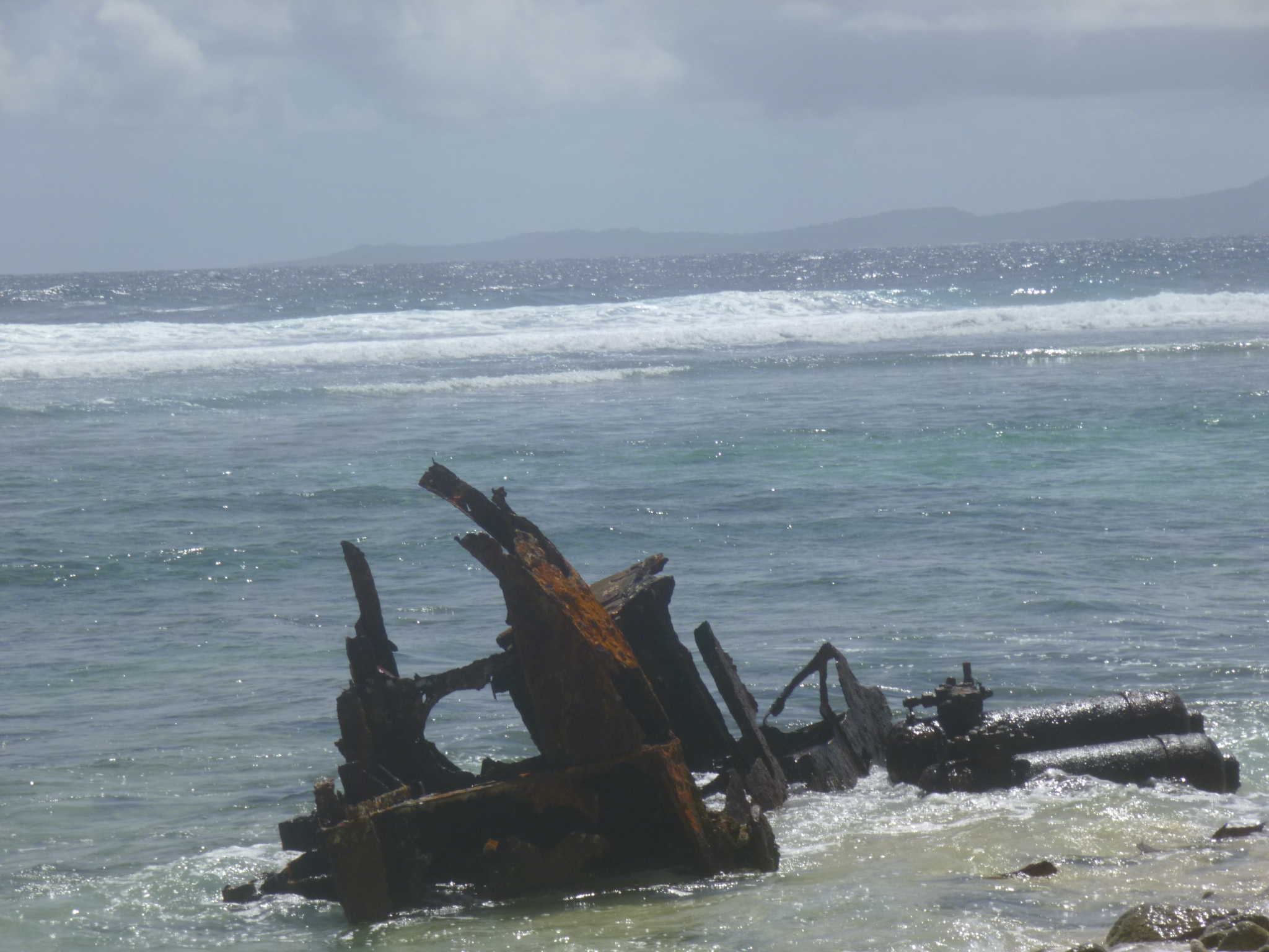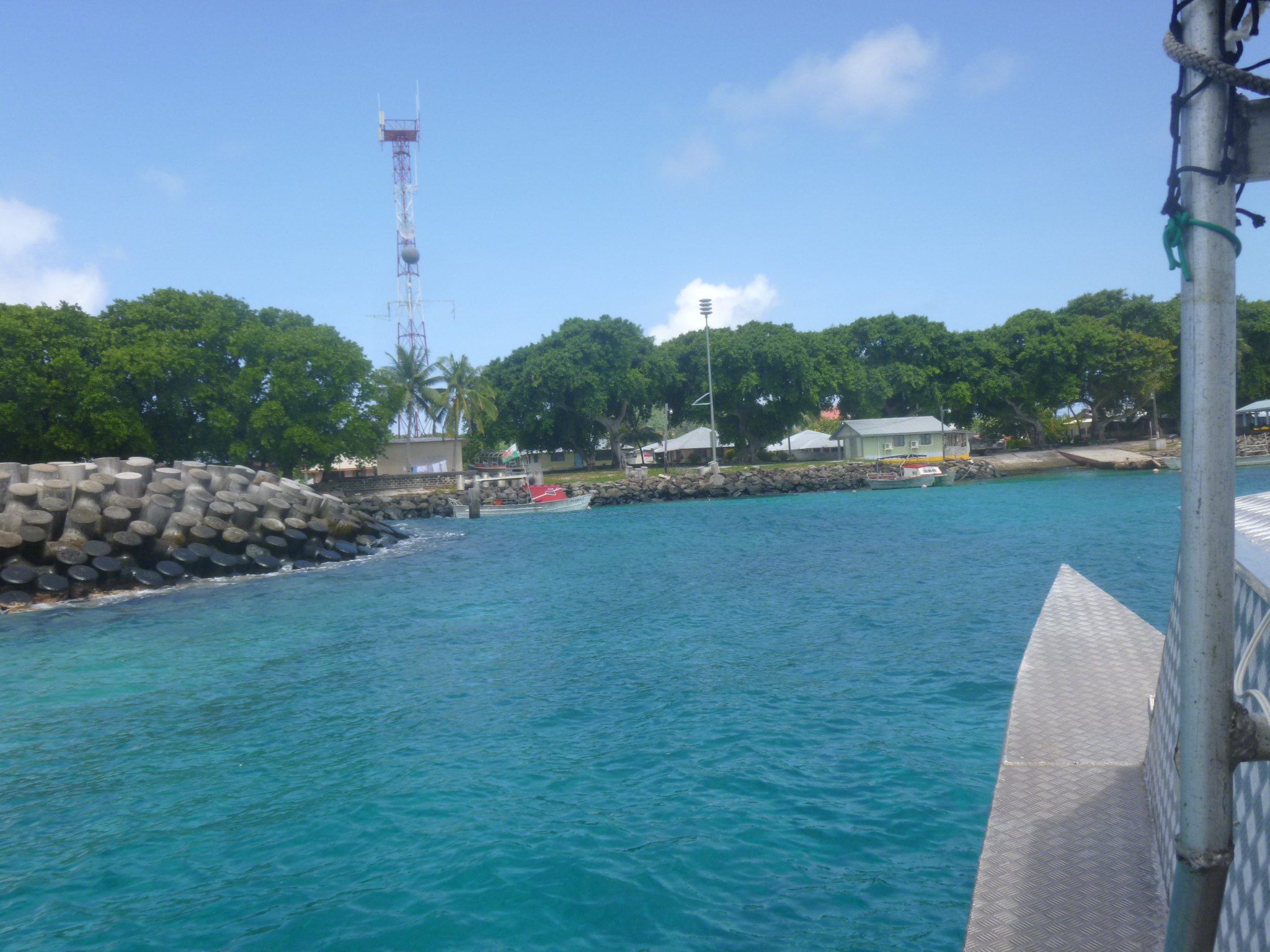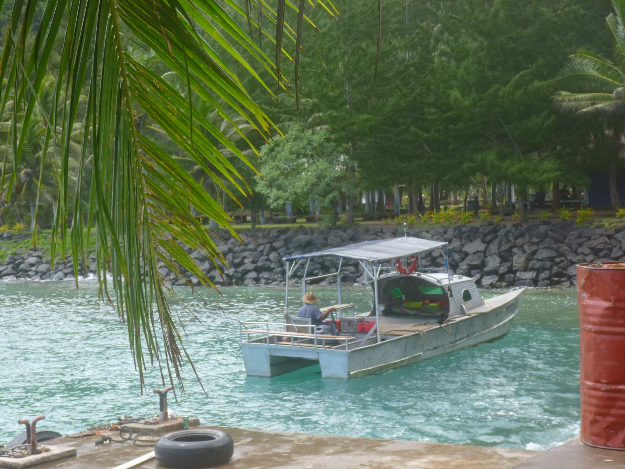 I mentioned to the bus driver that I’d like to get off at the boat harbor, but he forgot, and I totally missed it because the boats were out making their runs! They told me I could ride to the end of the route, and get off at the harbor on the way back into town, but I told them I didn’t mind a short walk, and got off at the next stop. It wasn’t far at all, and would have taken so much more time to just stay on the bus. Another family arrived to make the crossing – and there was a grandma and a young boy in the group. And that was kind if reassuring because when I saw the boat far off between the big ocean swells, it didn’t look like it was big enough to be out there! The boat sort of looked like a large wooden rowboat on top of catamaran hulls, with a tarp across the back half for some shade. There was a bench along the side, or people stand and hold on somewhere or sit under the tarp. In the end, the boat seemed well suited for its job, despite its size. It rode the waves well and was a pleasant 15-20 minute ride. The fare used to be $1, but it just recently went up to $2. The other family had done a bit of shopping, and the boat is the only way for them to transport everything. When we got off on Aunu’u Island, the first thing I noticed was a church. Then there were a couple clusters of small houses, and just a few vehicles. I’m not sure how the vehicles get over there! I headed off along a path on one side of the island, and I eventually came to the elementary school. It was bigger than I would have thought, considering the size of the island. There was a wide, well-trimmed path up the side of the mountain, past a couple banana and coconut plantations. I got to the top, and then the path down the other side wasn’t as well marked, and heeding some warnings about previous careless tourists, I went back down the safe way I went up! I walked past the school again and spoke briefly to one of the teachers. She said the kids go to elementary school on the island, but have to go over the big island for high school. And speaking of education, American Samoa has a community college, and there is an education program, and I believe graduates can teach on the island after completing their associate’s degree. I had taken a little longer than I thought in walking about, and then had to wait quite a while for the next boat to come, and then was a little concerned about time, since buses stop running back to town around 5. A couple kids came up to talk while I was waiting for the boat, and the 8 yr old girl seemed quite concerned that I was traveling by myself, without a husband and all my kids along! It was quite sweet! She also went into bloody detail about the accident on the rocks that “the other white people” had – I had even heard somewhere else that one of them may have fallen to his death – alcohol was involved. This 8 yr old girl has never once been off her little island – and it didnt seem to bother her in the least! Anyway, the boat finally came back and I was the only passenger. It was fun talking to the driver – his name sounded like Ellic. He wondered what I was doing in Samoa, and we talked about his boat and how high the seas get before the boats stop running – 6 foot waves seem to be the limit for those boats. He makes many trips back and forth a day.