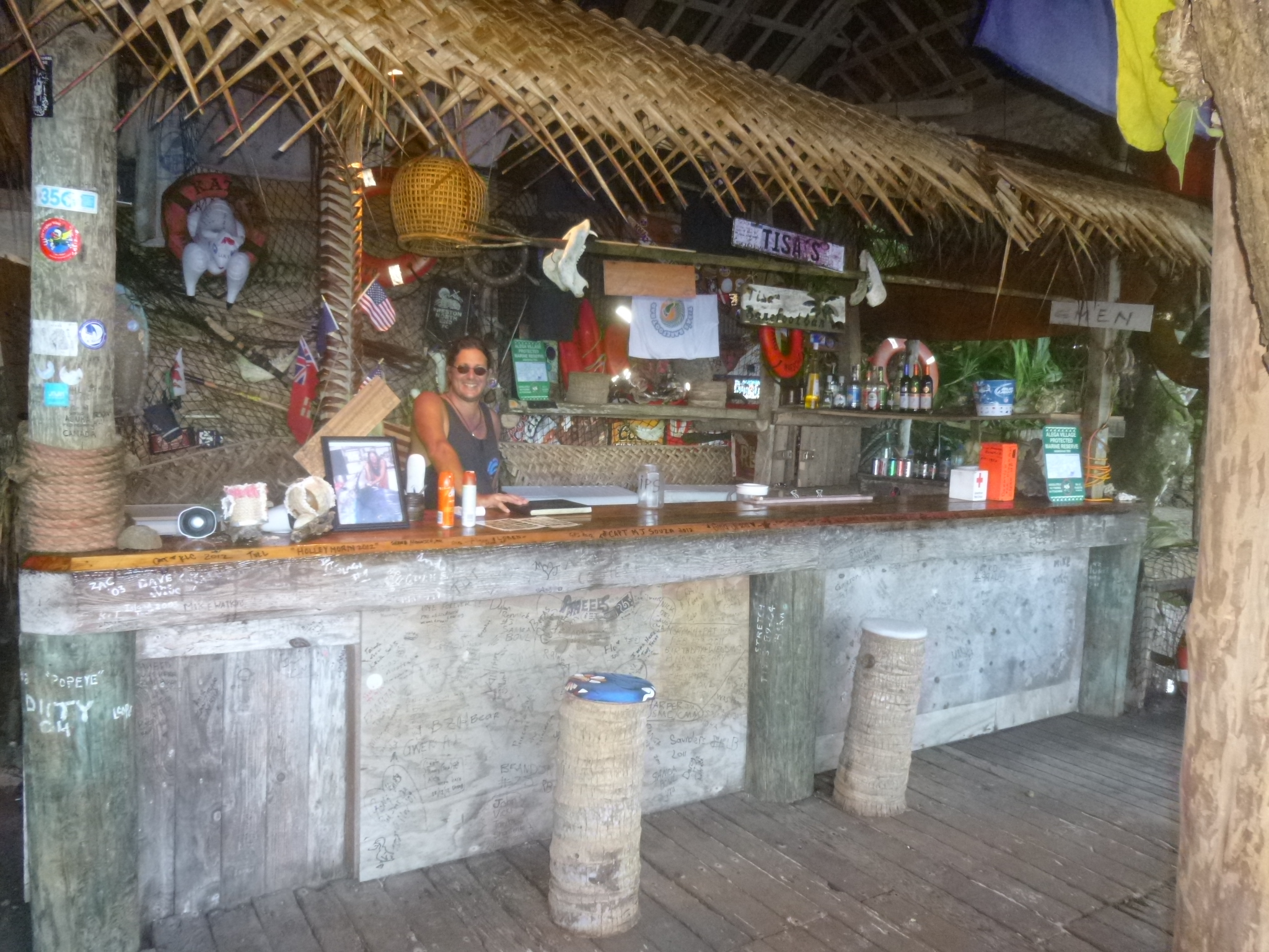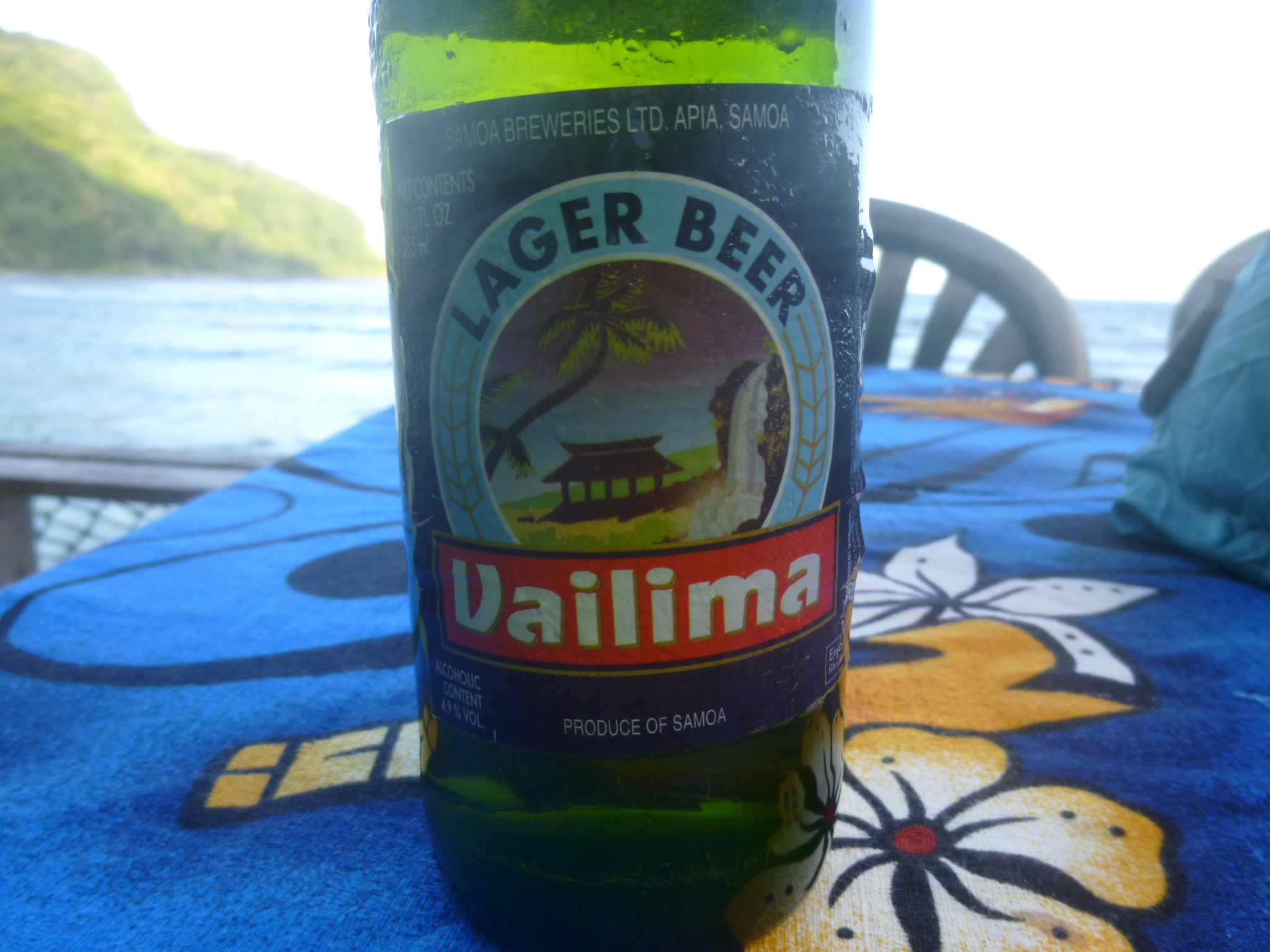 Even though there was a bus stop by the boat harbor, it was nearly 5:00 once I got back on the big island, so instead of waiting, I figured I better start walking. One lady thought the last bus had gone by, but other people were quite certain there would be one more. I walked 2-3 miles and still no bus. It was still light out and a pretty evening so I didn’t really mind, although it was still quite warm. I walked a little more, and figured I was going to miss my nice dinner at Tisa’s. I was already later than I had expected to be. I walked a little more, and then a black SUV pulled up and a very kind-looking lady asked if I needed a ride. Her college age niece was with her and they were so concerned about my walking, and possibly missing the last bus, that I had no qualms about getting in the car with them. And it was so much fun talking with them that I wished the ride could have been longer. She wondered how long I was on the island for, and would have like me to visit them and see their plantation – I would have liked that too! But time runs out. They dropped me at Tisa’s and even waited to make sure I could still get dinner. So thank you, thank you kind people – your names are in my phone, which I no longer have (that story will come later). I’m not sure I would have noticed the place on my own – there was just a little wooden sign by the road, and I walked through a little path, and down some steps, then this wonderful open-air wooden bar appeared, along with deck space over the water with room for about 4-6 tables. It looked like it belonged in a tropical paradise picture book! Despite my being later than I thought, I was still the first person there, and they brought me an icy cold local Samoan beer – it hit the spot! The bar/restaurant has been there for 24 years, and has been through 2 hurricanes. The design improves after each hurricane. They brought me their guest book, and it was signed by people from literally all over the world, and by people who were doing solo flights around the world, dropping down here and there to re-fuel, and groups like Greenpeace – it was really interesting. Tisa brought my dinner out – she didn’t want me waiting any longer for the others – it’s a very casual place. The dinner was all local food straight from the earth and sea – there is no menu; she serves whatever is in season. Tonight’s treat was swordfish that someone had caught and given them, marinated overnight and BBQ’d – delicious! It came with the Samoan version of sweet potatoes – not orange like ours, but thick slices of big whitish potatoes with a yummy coconut cream sauce. The vegetable was kind of a Samoan version of cabbage, and it looked sort of like spinach, but didn’t have a bitter aftertaste. I can’t remember what it was called. There was a little carrot and something else in their too, and another little dollop of the coconut cream sauce. Then there was a big piece of the best papaya I’ve had, already diced in its skin for easy eating. It was all served on a big green leaf (banana leaf i think), which made it very colorful. The fish had just been caught the day before, the potatoes and veggies came from their garden, and the papaya came from their plantation across the street – absolutely delicious. A couple other people arrived just as I got my meal, and a couple more after that. It was a good thing I got my dinner first, because even with time for a drink before their dinner, I still finished at the same time as everyone else. Yes, I’m a slow eater! When we were all done visiting, a couple of the people were driving all the way back to the west side of the island, and they dropped me off on the way. Tisa had told me earlier that taxi service was available from her place for those of us without a car, but I was lucky to get (another) free ride back! A wonderful way to end my last full day on Samoa.