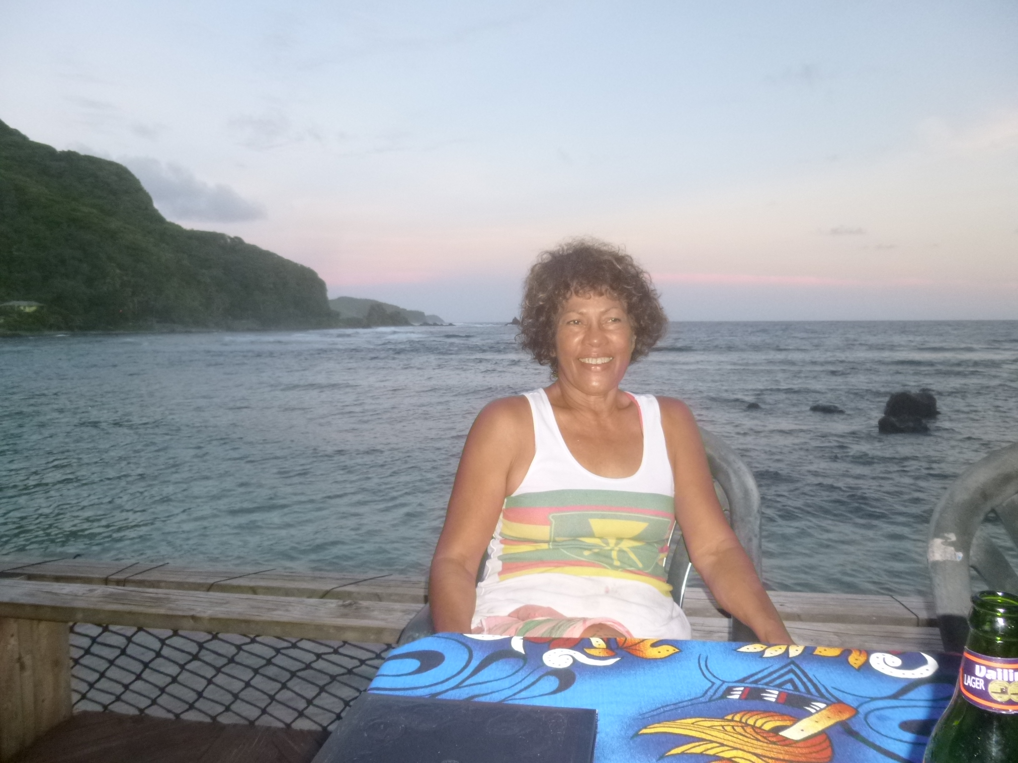 Tisa called me first thing this morning to let me know that although there won’t be enough people for dinner to do the Samoan umu meal, she can still fix a nice Samoan dinner from all natural, local food that’s in season – sounded good to me! So I’ll be stopping by there on my way back from Aunu’u Island later. After doing some computer stuff in the motel office, I met up with Teri the news reporter for a late breakfast. She had a lot of questions, and managed to type on her laptop and eat breakfast more or less at the same time! She was raised in California, and married a Samoan 30 some years ago, and has lived on the island for more than 25 years. When her husband passed away, people thought she would return to the mainland, but the island is her home! It was fun to chat with her and she took lots of notes about my journey. And when we went to pay for our meal, we found out one of her longtime friends had already taken care of our bill! That was a pleasant surprise!