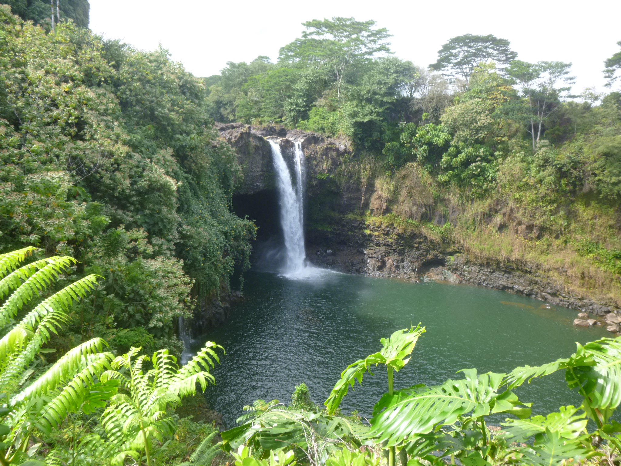 Then I drove into Hilo and parked outside of town and wandered all around. I was tempted to visit the Pacific Tsunami Museum, but knew it deserved more time than I had now. Hila hasn’t turned into a big touristy resort type city, which made it more fun to walk around. As I was making my way back to the car, I walked through a farmer’s market and got some bananas and tomatoes. The bananas are different from the ones back home and they’re yummy. I got some sweet apple bananas to try. It’s fun seeing all the different stuff at the markets – I don’t recognize everything! Then I drove out to Wailuku State Park to see Rainbow Falls. I wasn’t there at the right time of day to see a rainbow, but the falls were still pretty. I also drove out to the ‘boiling pots’ area, but didn’t see anything that looked like boiling mud pots!