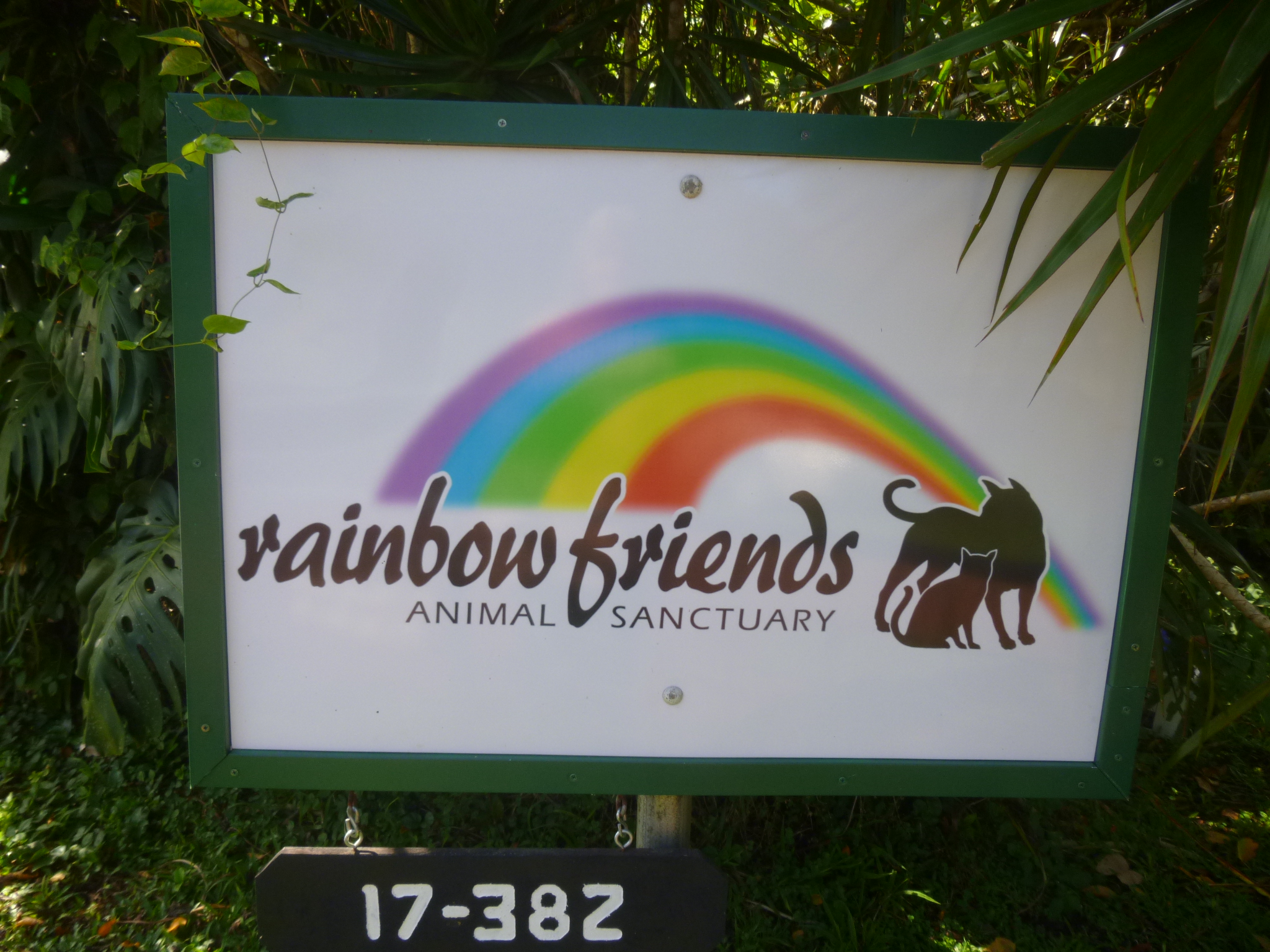 I didn’t get much sleep on the plane, but at least I got a little. We left American Samoa a little before midnight, and landed in Honolulu about 5:30am but we gained an hour. I had made a reservation to fly to the big island of Hawaii to finish off my week in Hawaii that started back in Oahu. My choices for Hilo had been either 7:15am or 11:15. I picked the later time originally because I thought it was cutting things a bit close going through customs and immigration – which we have to do even though American Samoa is a territory. But we were waved through quickly, and I decided to make a dash for the inter-island terminal to see if I could maybe catch the earlier Hilo flight so I wouldn’t have to sit in the airport. They had room and I was able to make the switch – just barely. It was a short hop from Oahu to Hawaii, but my rental car wasn’t quite ready since I had arrived earlier than planned. At first I thought I’d have to sit around in this airport for 4 hours until I could get my car, but the agent had my phone number in case one came back early. I started researching some donation possibilities, and soon enough my car was ready. I got a map and good directions, and I set off for The Food Pantry, which was open on Fridays and wasn’t too far away. I found the street with no trouble, but try as I might, I couldn’t find the food pantry. I was in kind of an industrial area, but I saw a vet clinic on the corner, and figured they might know where the Food Pantry went. The first thing I saw when I walked into the vet clinic was pamphlets about the Rainbow Friends Animal Sanctuary and a couple of donation jars pretty full of cash. It made me think this was a place people liked, because they were supporting it. The receptionist told me that the Food Basket had just moved up the road a ways where they would have more room. I took a Rainbow Friends pamphlet on my way out, and thought it was coincidental that I stopped for directions at a place where I would be led to another donation opportunity.