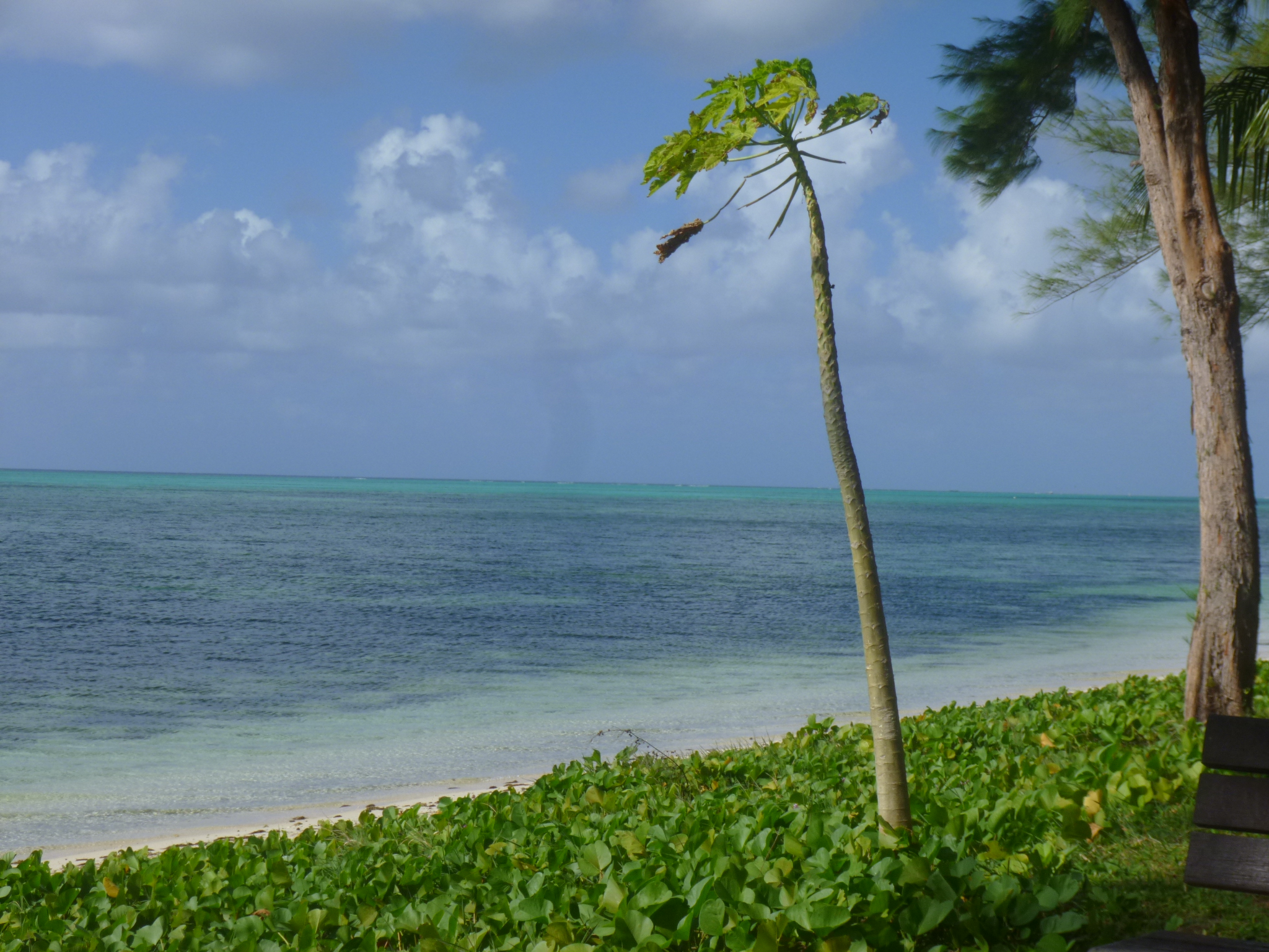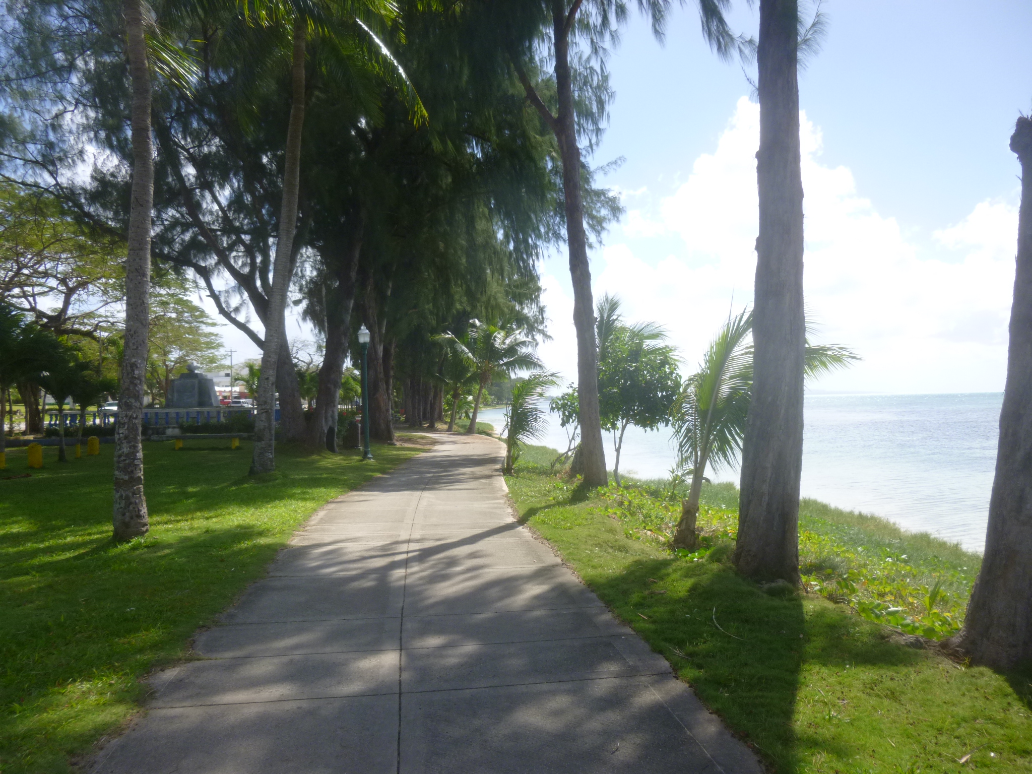 I arrived in Saipan in the middle of the night, and the shuttle picked up me and one other person. I couldn’t really see anything on the 20 minute drive to the hotel, and didn’t even have any sense of direction, or where the hotel was in terms of the layout of the island. About all I could see were lots of poker places! It was after 4:30am by the time I got checked in and ready for bed, so I slept til about 10:30 and I felt like I’d slept half the day away! The first thing I had to do was figure out how to call the lady in Guam who might have some of my things. The people at the front desk told me I could get a phone card in the adjoining poker room, which was full of cigarette smoke. Then when I figured out how to use it, I thought I’d look out my window to see where I was, and all I could see was rusty corrugated rooftops! Between the smoky poker room and the rather dismal view out my window, I did begin to wonder what I’d gotten myself into! But then I called Guam, and spoke with the woman who had my passport and driver’s license and quite a few other things – that made my day. She works for the mayor of Dededo, and assured me my things would be safely locked up until I was back in Guam. So with that good news, I went downstairs to the restaurant that’s part of the hotel lobby, and got a good late breakfast. Then I studied a map, asked some directions, and set off to get my bearings, and find the beautiful walking/jogging path that several people had told me about. I had heard it was a path that ran for several miles along the coast, but I had a little trouble finding it. The hotel was about 1/2 mile from the ocean, but there were still a bunch of shops and buildings. I found some dirt road that went closer to the ocean, but it was just a private road. I got back on the sidewalk that was right next to the busy street, and could only see a glimpse here and there of the ocean. But as I continued on, the buildings disappeared, and the sidewalk turned into a wide path that got closer to the ocean, and then I was on it – an endless sidewalk next to a picture-postcard turquoise sea, with palm trees and ferns and a gentle breeze on a hot day. It was wonderful, and I walked and walked until I’d gone about 4 miles, and the trail seemed to end in a park. I was out in the heat of the day, so I was happy some of the trail was shady, and I got a cold drink and just sat on one of the benches and admired the calm view. There must be a reef about 100 yards out, because the waves were breaking way far out, and the water in between was shallow and full of shades of blue that don’t seem to exist anywhere else. There was also an enormous ship anchored out there – it looked like some kind of navy ship. I walked back, feeling more comfortable now that I knew I had a good place to walk, and had figured out the hotel was kind of in the middle of the island, and I wandered into a couple of the Japanese markets just to look around and people spoke English! I’ve never seen rice sold in such quantities – huge sacks of many varieties of rice stacked up like pet food displays, and so many kinds of soy sauces and other sauces! Back at “my” end of the trail, people were setting up a farmer’s market and hot food booths. I had also seen people selling fresh fish at makeshift stalls in several places along the beach – all in big stacks of coolers, and quite a variety of fish – lots of it for under $3/lb. I wasn’t quite ready for dinner but I bought some more little bananas, and it occurred to me that I have bought bananas from a farmers market on the first day of each of my island visits! I wish we had the variety of bananas that the islands do! The farm market was only about 3/4 mile from the hotel, so I knew I’d come back later to try a few things.