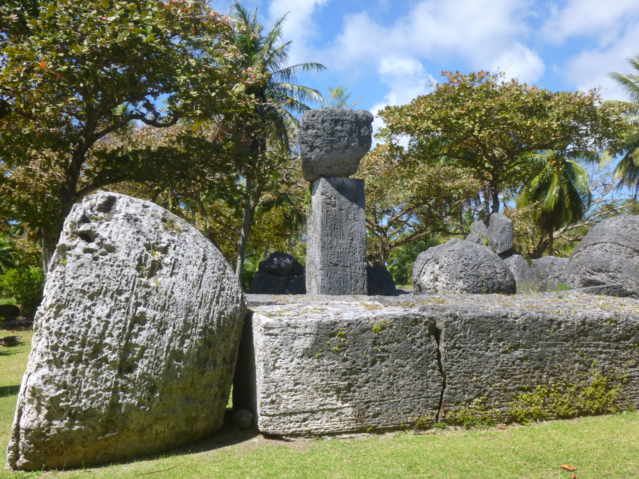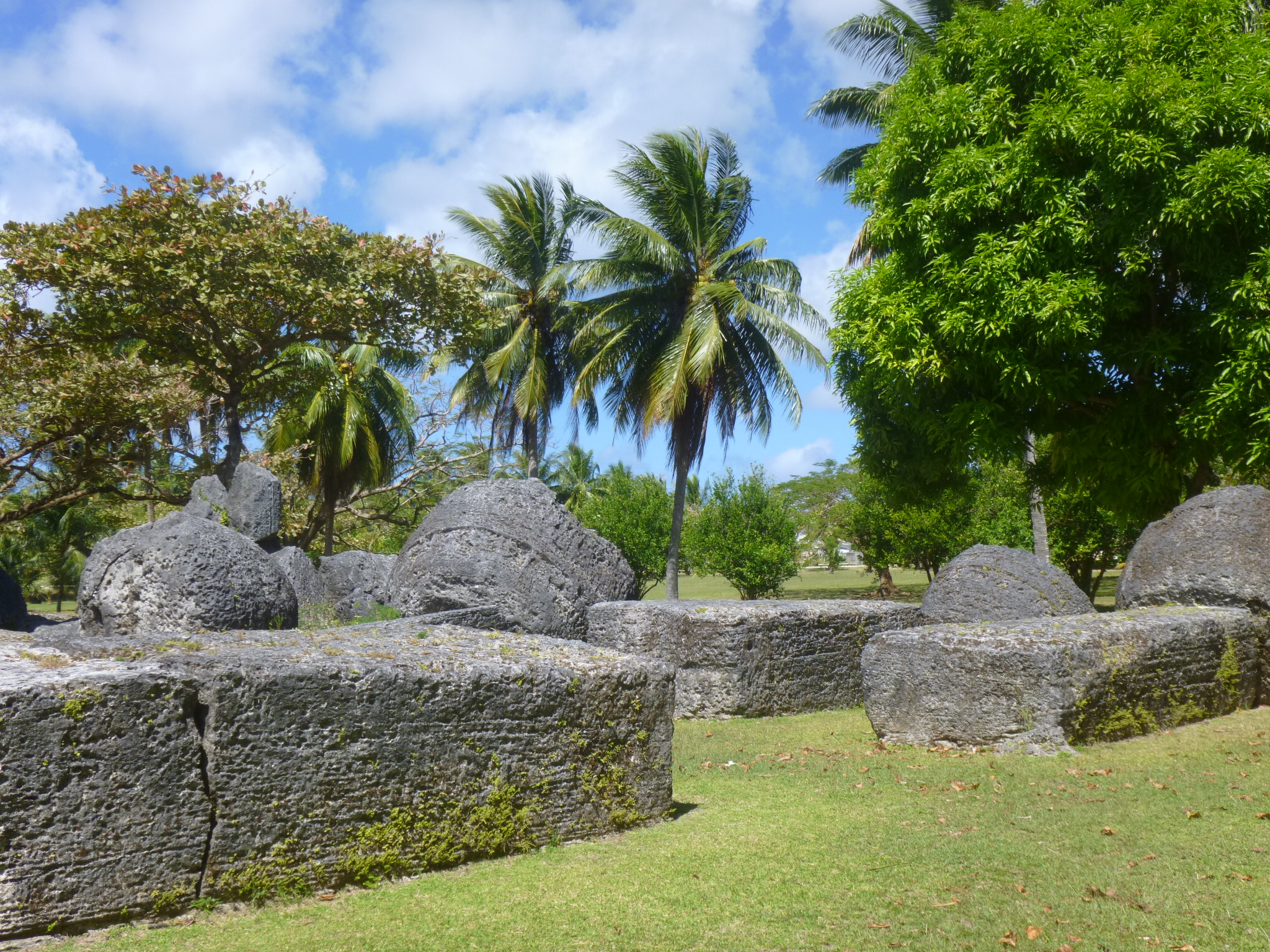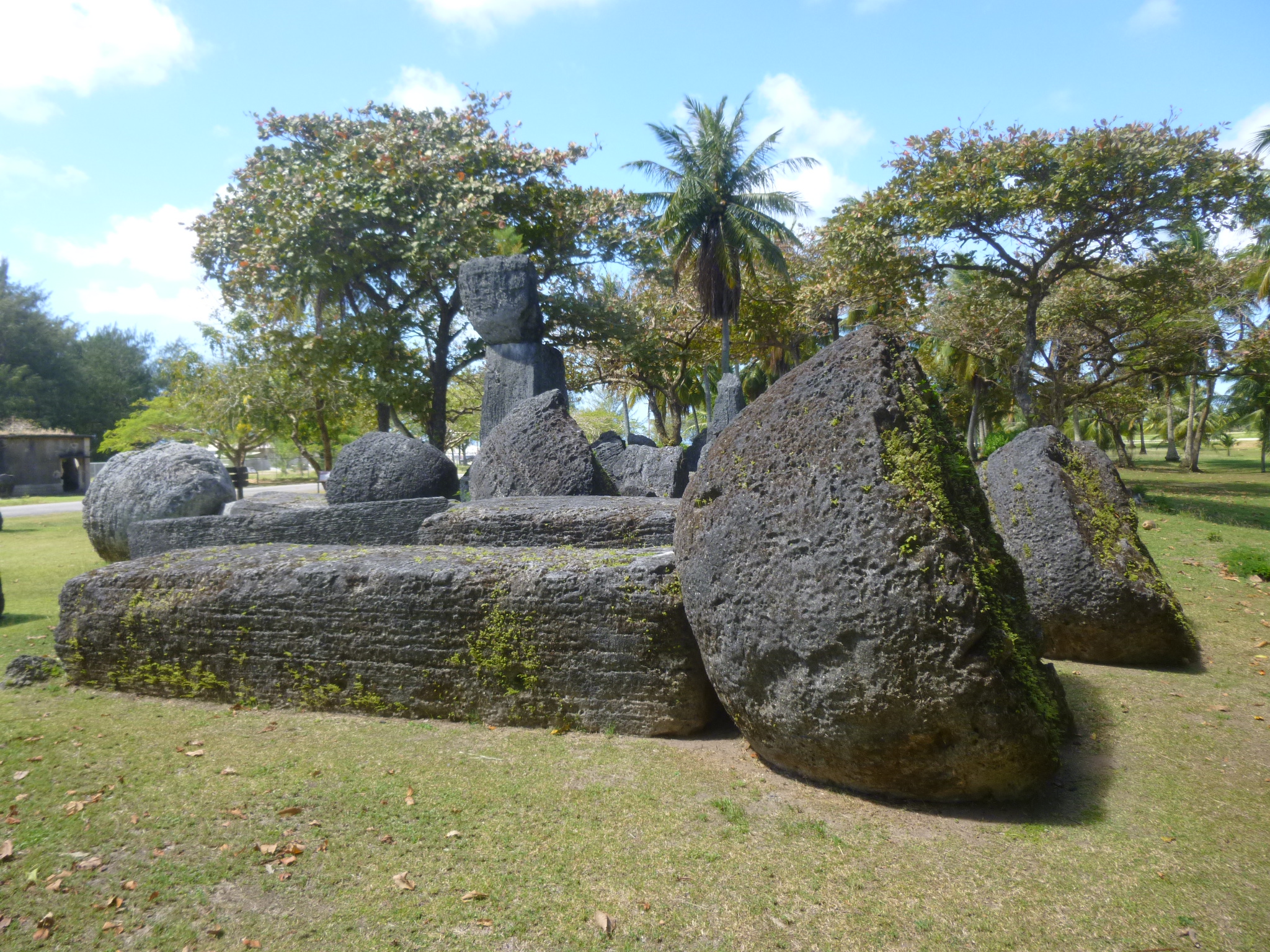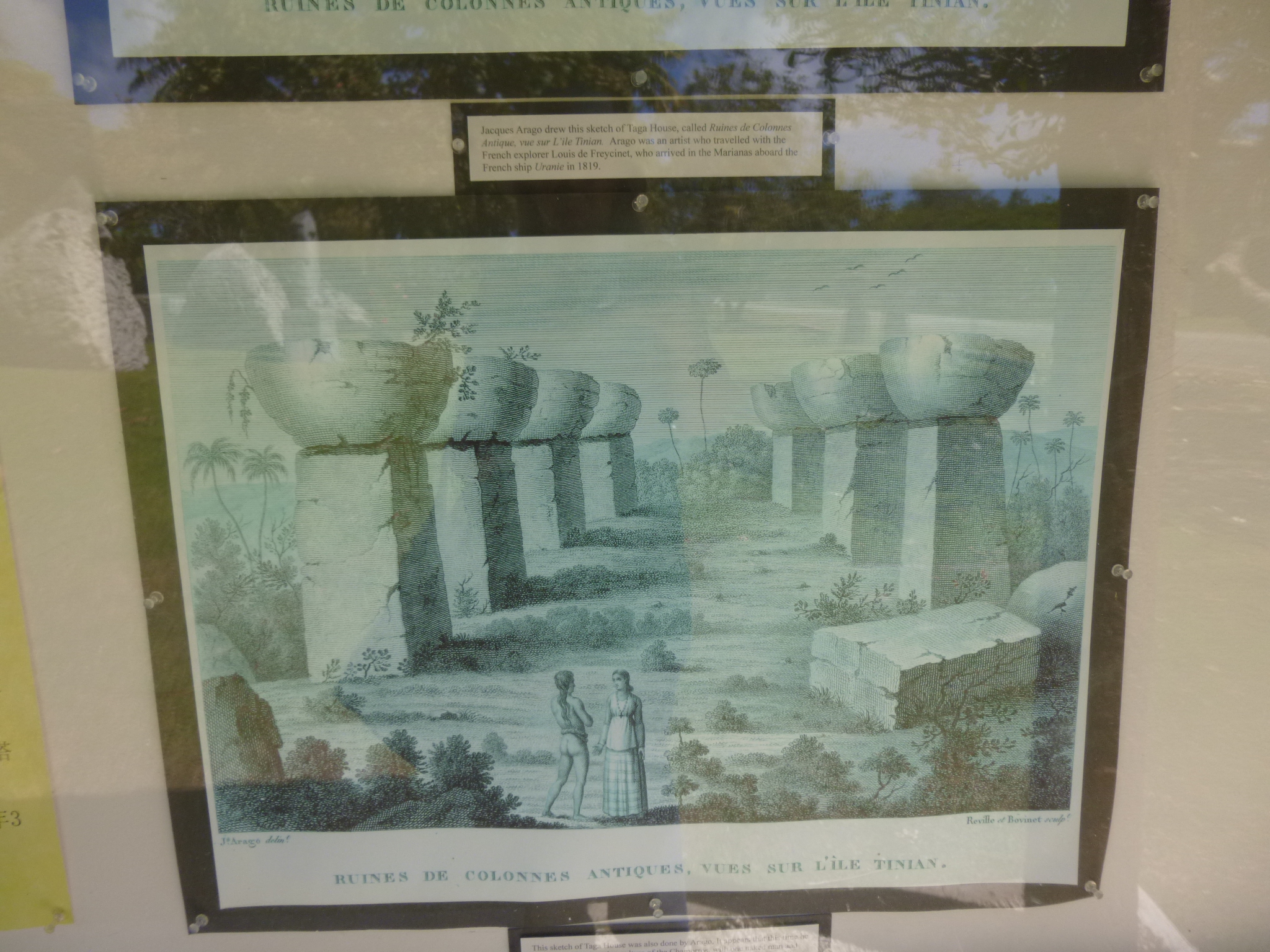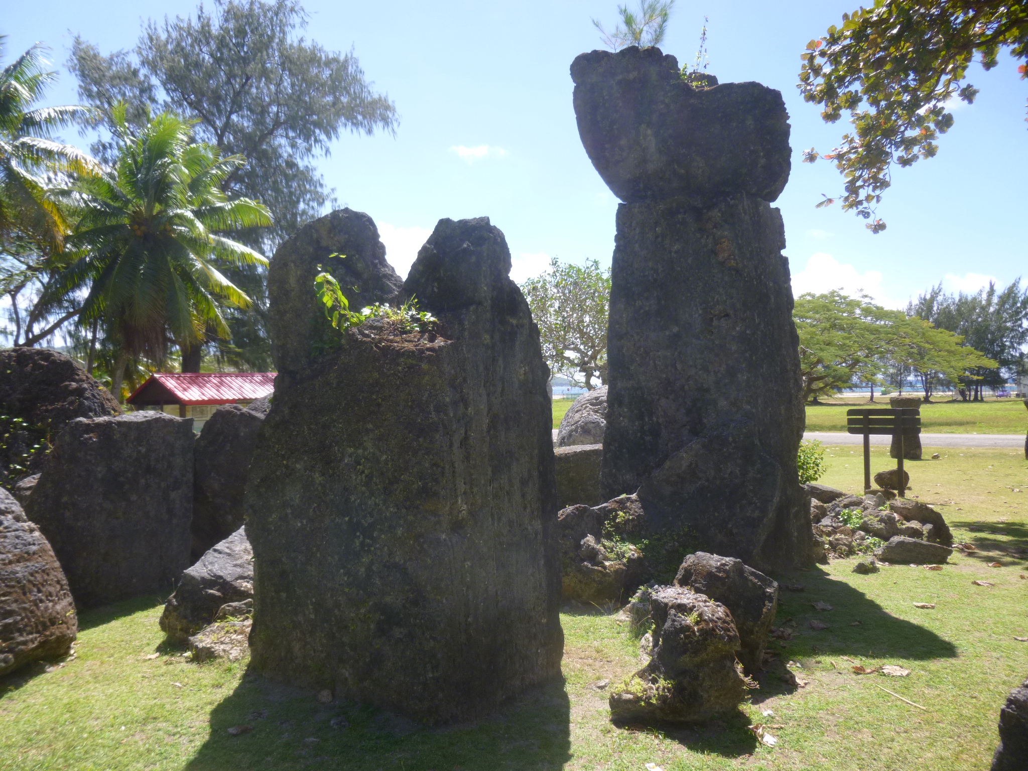 I walked about a mile to the visitor center and got a map. The little town and the beachfront walking trail were within walking distance, but I also really wanted to get to the northern end of the island to see the old airfields from WWII. A lady had called me at the airport this morning about a possible driving tour, and we had tentative plans to meet at the hotel at 2:00. In the meantime, I planned to do most of my walking and go see the latte stones. I walked back to the hotel and from there found the beach path without trouble and it was another beautiful walk – with water that seemed even more sparkly and blue than on Saipan. I wish pictures would do it justice. There were a few places where rusty old pieces of equipment from WWII just lay in the shallow water. There were a few small groups of people out by the beaches but overall it was pretty quiet. After that walk, I walked to the House of Taga where all the old latte stones are. Latte stones are unique to the Mariana Islands, and I have seem them on Guam also (Guam is the southernmost of the Mariana Islands, but apparently big enough to be its own territory). They are big stone pillars that have 2 parts – a column, and a half-sphere that is balanced on top of the column. They were used about 800 years ago in pairs of 6-12 to support important structures. There is a legend connected to the House of Taga about a giant, and these are really big latte stones. Only 1 of the latte stones at the House of Taga was still standing, but the others all lay neatly on the ground where they toppled over centuries ago. Even in the 1500s when the Spaniards were exploring the area, only 7 of them were still standing. This was in a shady area, and it was nice to just sit on one of the stones for a water break, and to think about it all.