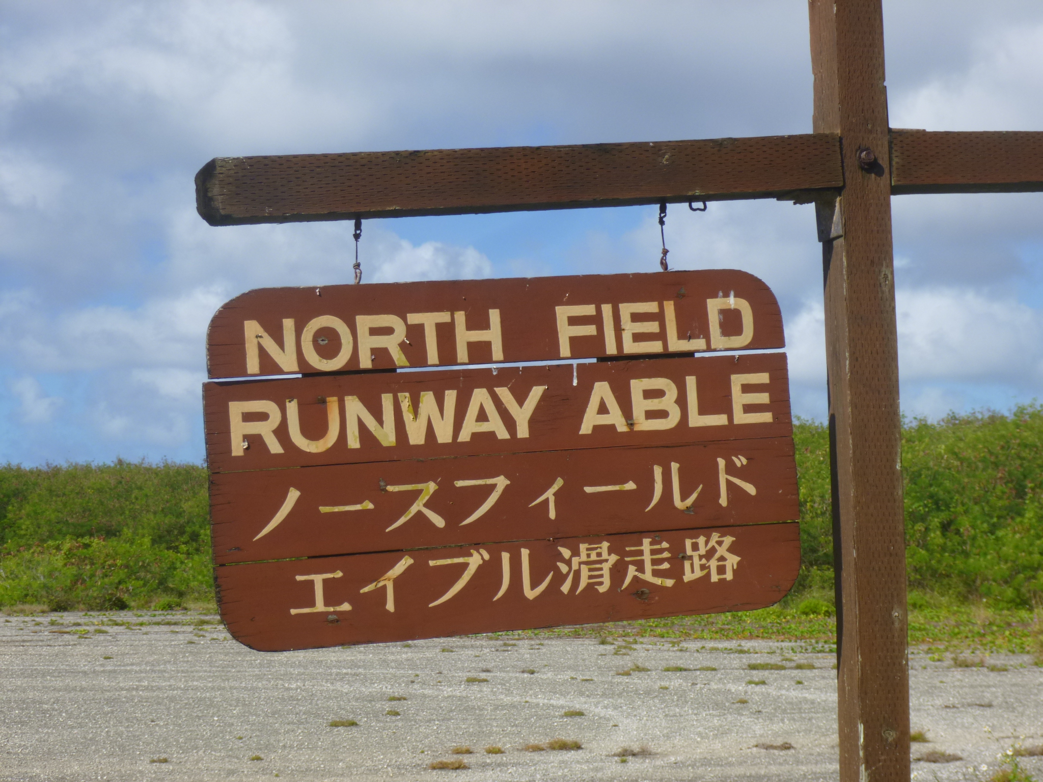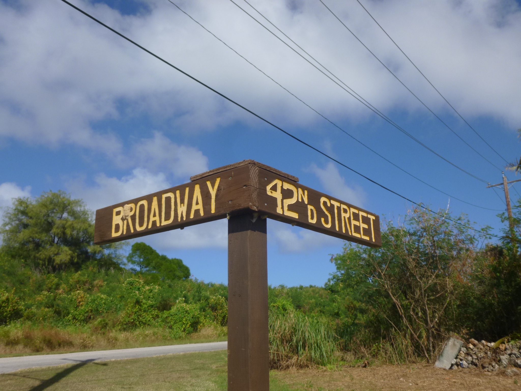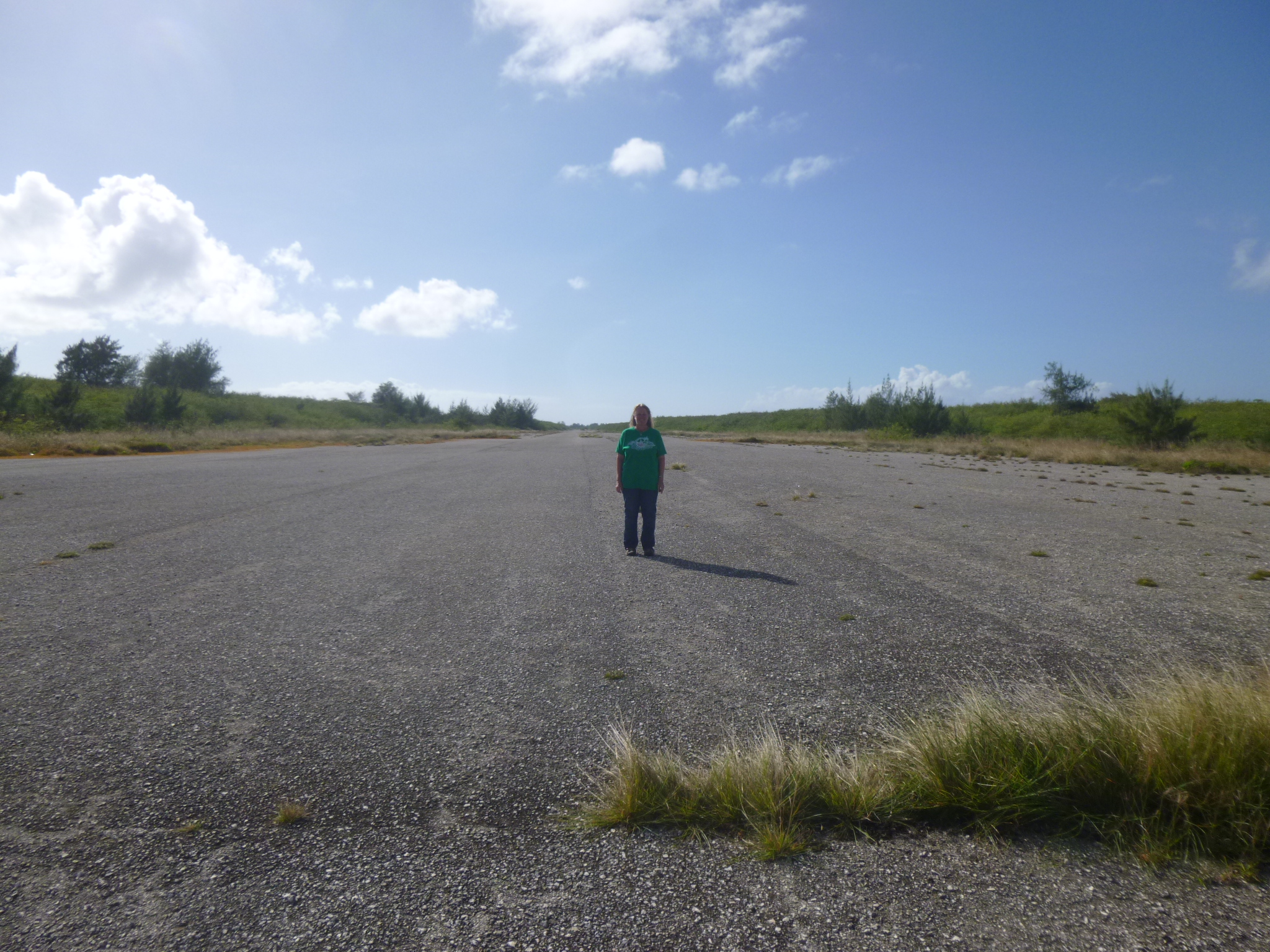 The road across the island was built in 1944 by the navy to haul goods from the harbor in the south to the airfields in the north. Apparently some of the soldiers building the roads were from New York, and they were homesick, and since Tinian is similar in shape to Manhattan, they named the roads Broadway, 42nd Street, Canal Street, Wall Street etc – just like back home. I didn’t expect to stand at the intersection of Broadway and 42nd Street today…such as it is! The airfield was very interesting. Back in 1944 and 1945, the small island of Tinian had the biggest and busiest airfield in the whole world. There were 4 long runways, specially built to accommodate the new B-29 Superfortress bombers. The first runway, which is the only one that hasn’t been overgrown, is the one that was used by the Enola Gay bomber to take off with her deadly atomic bomb, which helped end WWII. Many other planes and many other bombs took off from both Tinian and Saipan, and Japan had no way to defend herself once the US secured these islands that were so close to Japan, yet so far from America. America had a very well-organized supply system with both the navy and the merchant marines, and that made a big difference. I was also able to see old fuel storage buildings, and I went into a Japanese air raid shelter. I walked along a good part of the runway, and we drove along the whole thing. The atomic bomb pits are now covered with glass shelters, but there were posters inside showing the process of loading the bombs. The bombers needed every bit of the mile and a quarter length of the runways to get off the ground with their heavy loads. Everything is so quiet and overgrown now – it was kind of difficult to visualize what this place must have been like nearly 70 years ago.