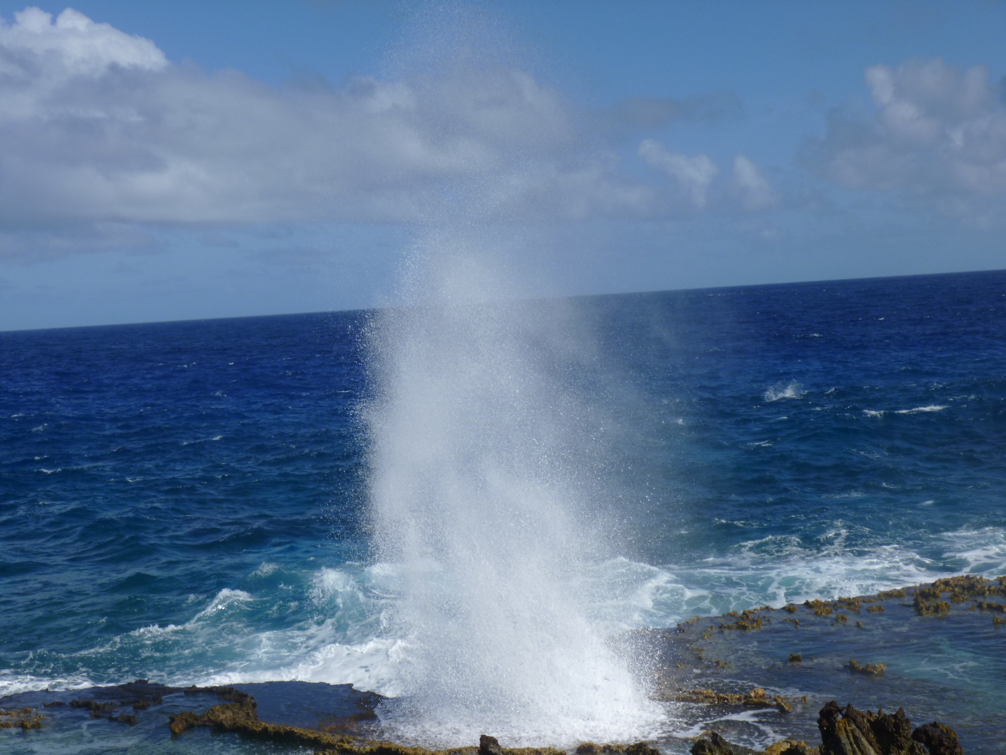 Then we headed to the north side of the island, but first my driver pulled into an old lot behind the old buildings that the hotel workers live in to show me the replicas of the atomic bombs “Fat Man” and “Little Boy”. A third atomic bomb, “Thin Man”, had also been built and that was the test one. These replicas were built to be a part of the 50th anniversary memorials, and were going to be placed in the atomic bomb pits, but they caused too much controversy, so they were just taken away to this old parking lot, and many people don’t seem to have a chance to see them. The atomic bombs weighed about 4 tons, which is why they needed special pits to be loaded from – they were too heavy for conventional methods. Their size would never suggest they were that heavy – they looked like they would fit into the back of the van with all the seats out. On the way to the other end of the island, we stopped at a place where the ocean waves crash against the rocks, and they’ve made a hole through one of them, and when the waves come in underneath, the water spouts up like a whale’s blowhole.