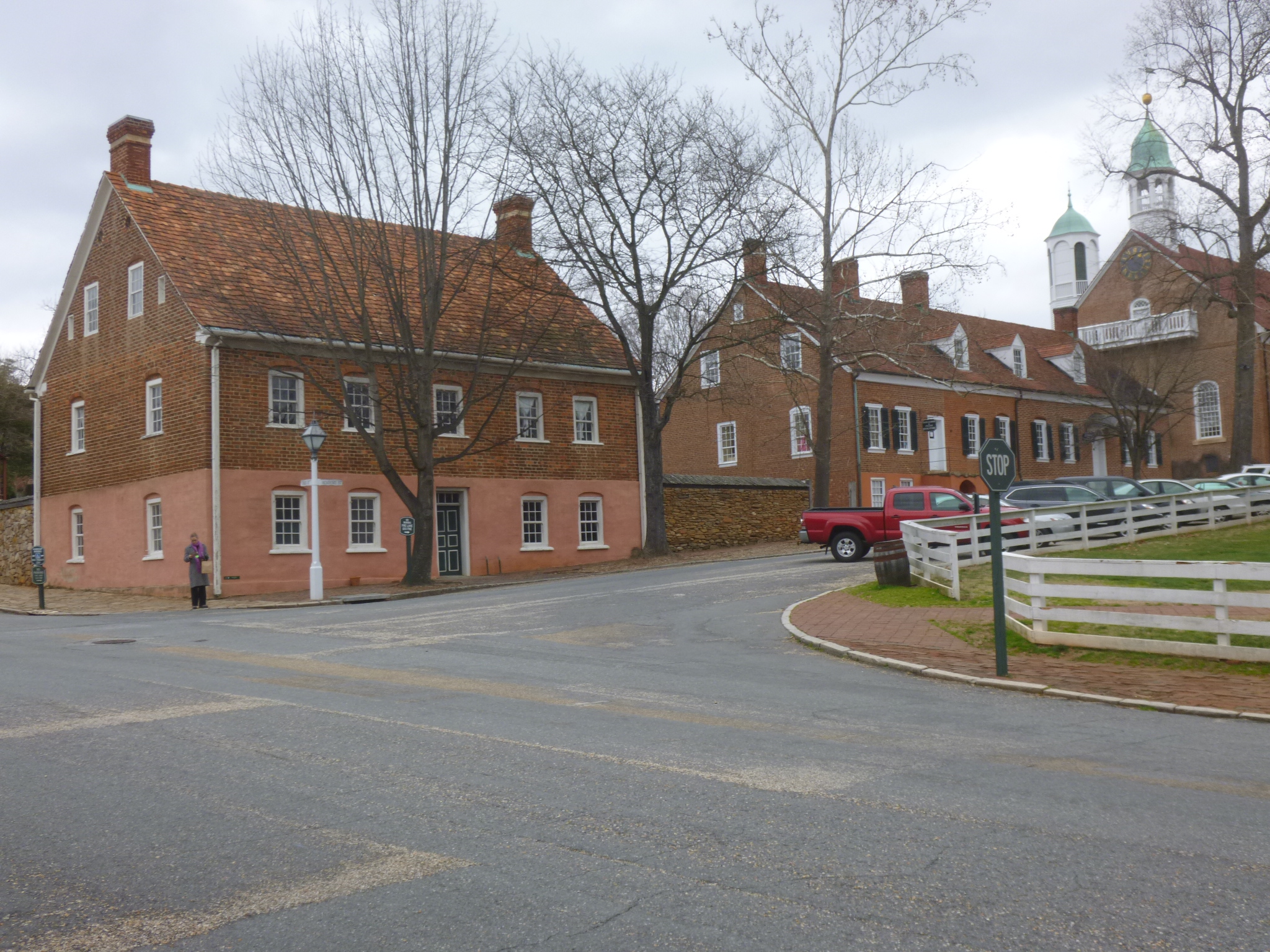 With all of my donations done and only 4 miles of walking to finish before leaving North Carolina, I headed for the historic Old Salem part of Winston-Salem. Salem was originally settled by a group of Moravians from Pennsylvania, and Winston was founded nearly 100 years later. But Winston grew fast because of the successful tobacco industry, and quickly became bigger than its much older neighbor, and they consolidated in the early 1900s. The drive was pretty and Old Salem was a wonderful restored town to walk through. Many of the homes had been built in the 1800s and some are still lived in today. The sidewalks and streets were brick, and with the smell of woodsmoke in the air on this chilly day, I could almost think I’d gone back in time. There was an old set of mounting steps to get into a carriage or on a horse, and several old wooden rain barrels were out in the yards, which I realized later were garbage cans! We walked past Salem College, which is a small women’s college founded back in 1772 and it just blends right in with the old town. There was also a girl’s boarding school from 1805, so some communities thought about education for girls back then! There’s a big coffee pot at the end of town which is a local landmark – a smaller version used to be in front of the tinsmith’s shop back in the day. We also walked on the “strolling path” that was built to connect Old Salem with the downtown area. And then my North Carolina walking was done.
