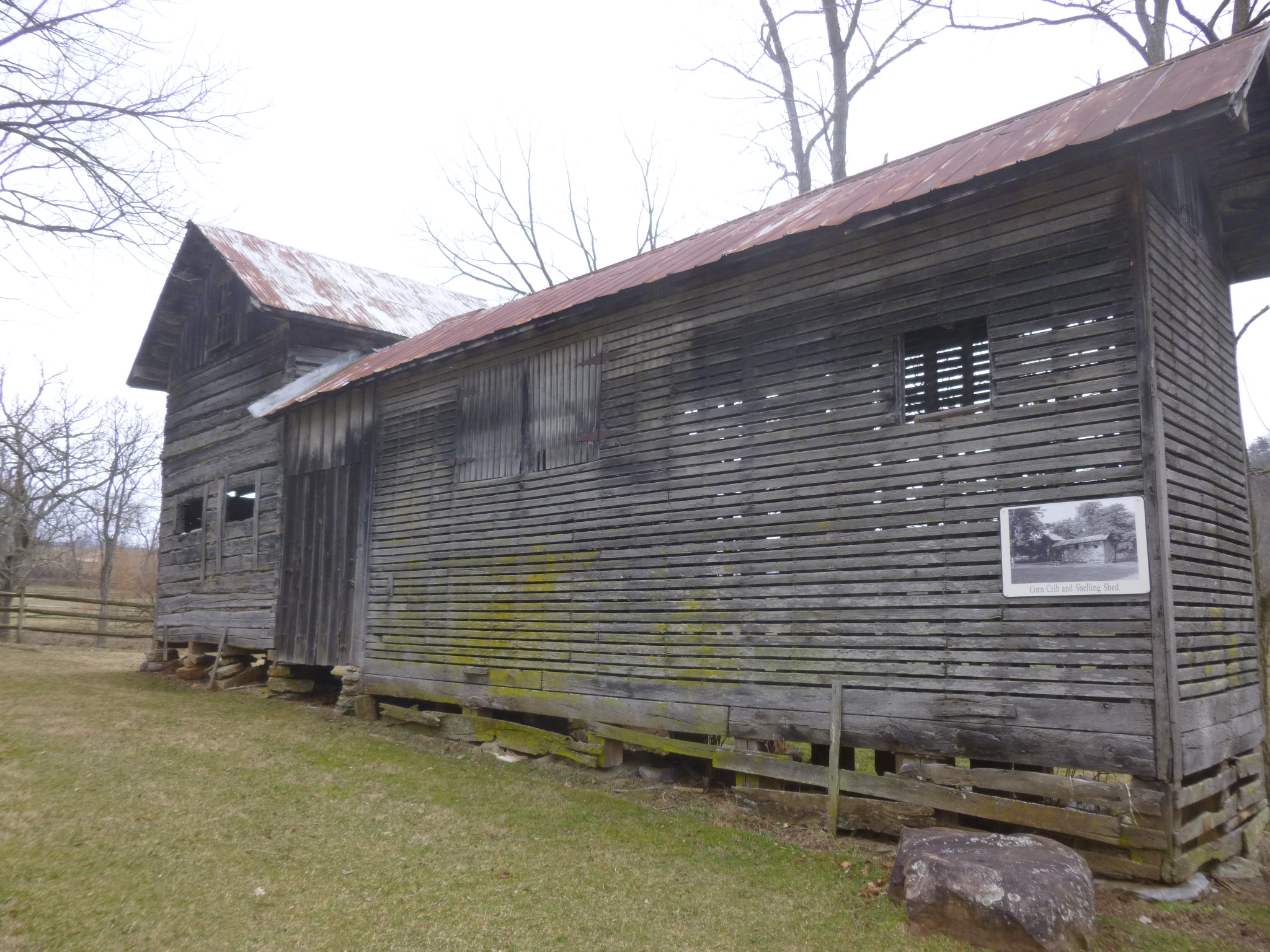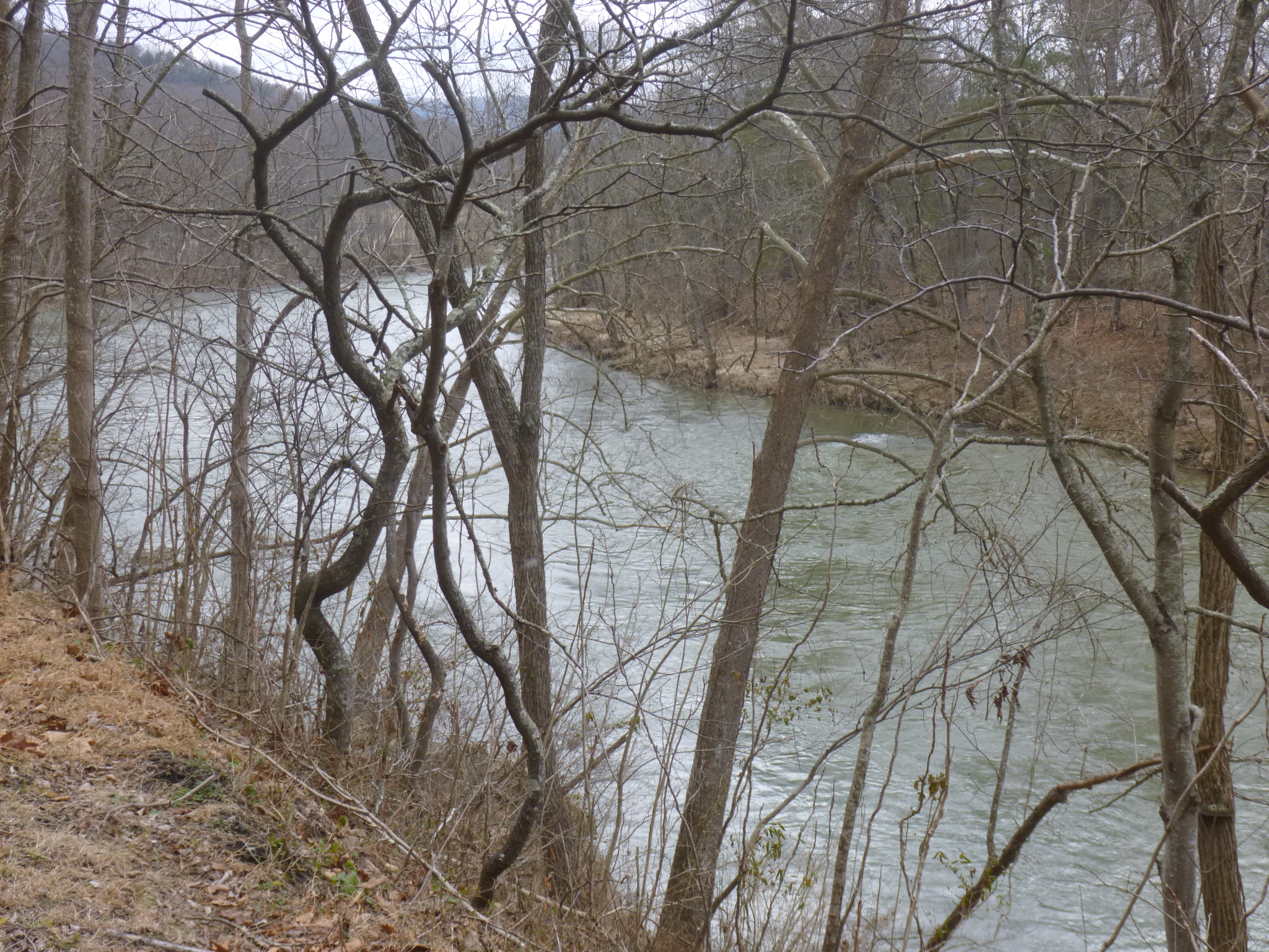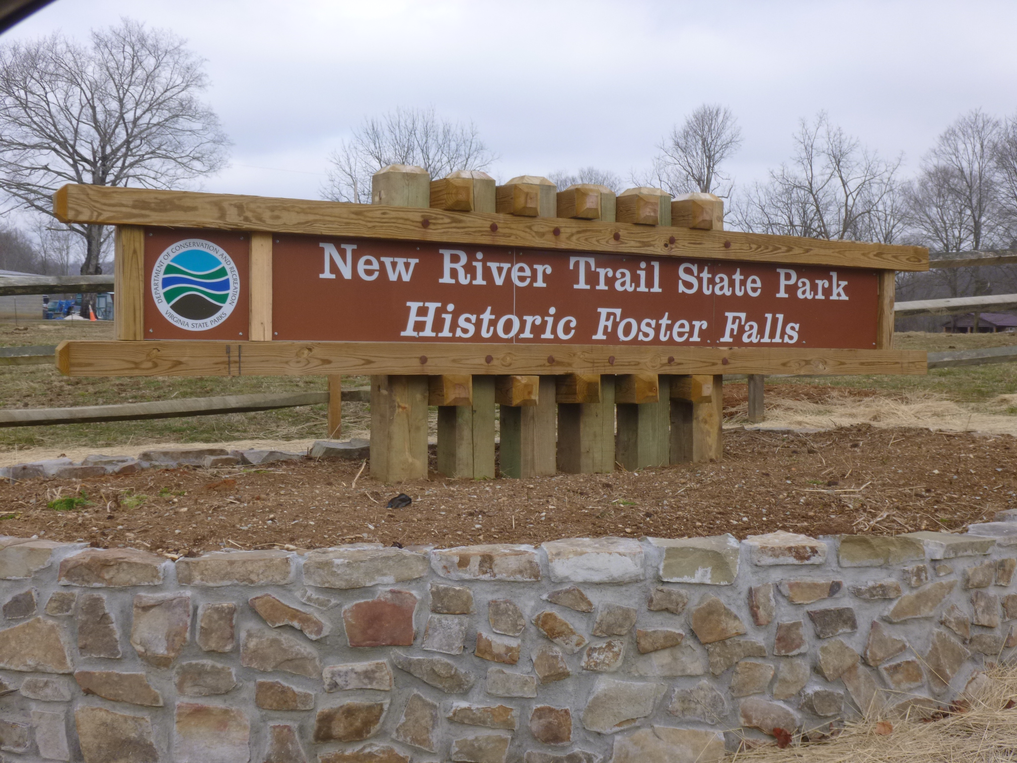 I woke up to see a dusting of snow on the van and everything else. This is the first snow of the journey (other than the snow in Ohio after leaving New England during Hurricane Sandy). But it’s only a little, and I just bundled up a bit more and set out for New River State Park, which is Virginia’s longest and skinniest state park – in places it’s not much wider than the old railroad tracks and their right-of-way. I backtracked a little to get there, and Tula and I headed out for a 6+ mile walk along the river. Some of the trail was bumpy frozen mud, and walking into the wind made the beginning of the walk a bit chilly. This would probably have been a very messy walk if it hadn’t been so cold. But the morning warmed up, and it ended up being a good walk. I was at the Foster Falls section of the park, and there were a few old buildings left from the original town, and it looks like it has quite a variety of activities in the summer, with a storage shed full of canoes, a livery for horses and a big campground.