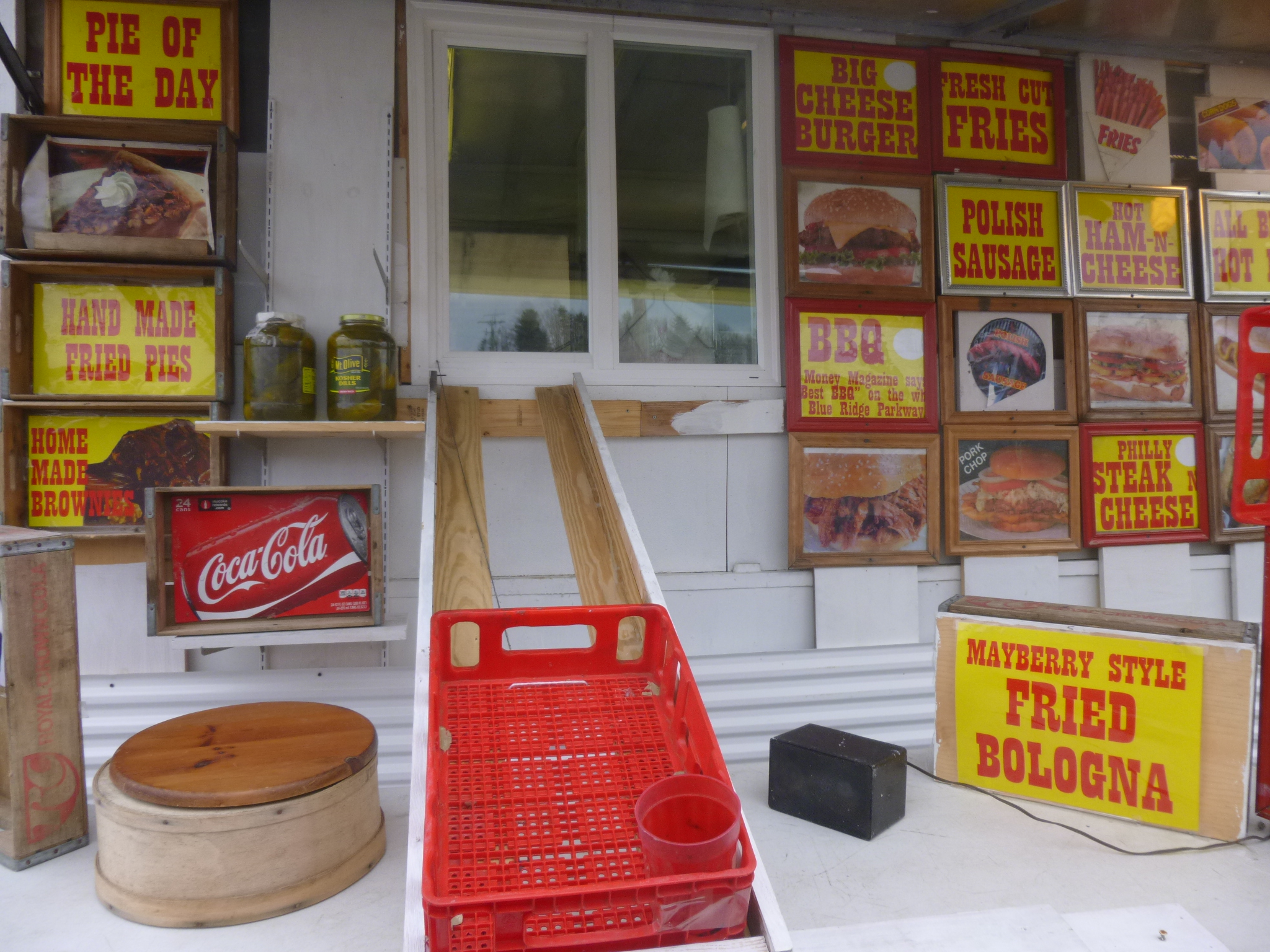 As long as I had backtracked a bit, I went a little farther back to get on the Blue Ridge Parkway for a while. It may not be the prettiest time of the year, but I still wanted to drive on the parkway. On the way, I stopped for gas, and there was a BBQ trailer by the road, and the timing was perfect for a local sandwich. There was even a version of a drive-thru with a bread crate and a plastic cup for money and string for the crate to be reeled in! It accomplished what it needed to! I headed up to the access point for the Blue Ridge Parkway, only to find it unexpectedly barricaded with no explanation. The little bit of snow was gone, and it had become a clear day, and the people at the gas station just figured the closing was because of the little bit of snow last night, and more snow to come this week. That was a bit of a disappointment, but I headed north a different way and ended up in Salem, which had been my destination anyway.