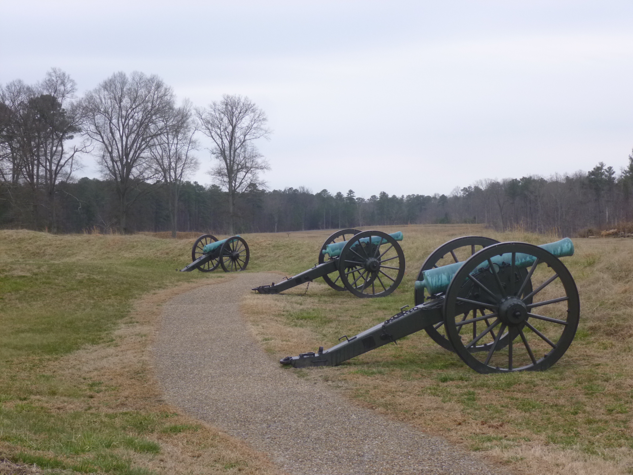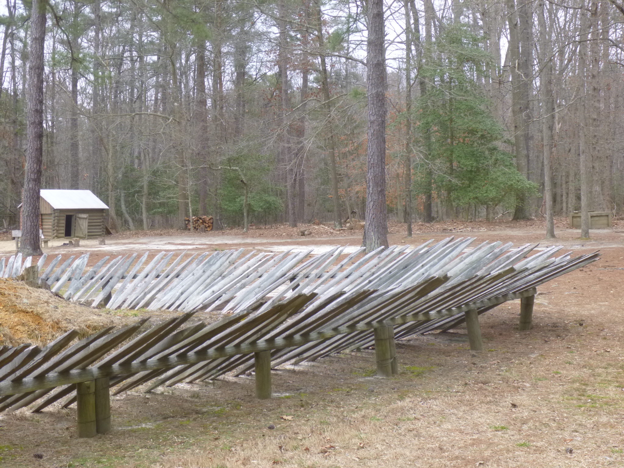 Then I drove a little south of Richmond to Petersburg National Battlefield, another National Park site, and got another dose of history. The siege of Petersburg was a 9 month ordeal – the longest military event of the Civil War. I watched a good video about it, and enjoyed the exhibits in the visitor center, then set out to walk on the auto tour route. I really enjoy walking in the national battlefields – this is the 4th or 5th one I’ve been to, and I didn’t expect to enjoy it so much! The history is interesting, and the land is usually rolling hills, to provide some cover during battle, and it’s very pretty. The auto routes are typically one way with low speed limits, and they’re designed with a pedestrian lane, so it’s easy for anyone to walk as much or as little as they want. Tula and I set out and walked a couple miles and then it started to sprinkle. We turned around and didn’t get too wet, because the sprinkles came and went, but I began to keep an eye on the increasingly gray sky. I drove a little farther on and walked another couple miles. I came across a section of a trail that was closed because it was an eagle protection zone for nesting eagles – with a $350,000 fine for anyone who trespasses! A lot of the trenches and battle lines are very visible – stretching on and on, and thinking about all the shoveling and digging and what slow work it must have been, especially in bad weather, really makes it seem like a miserable event. Back then, the Union and Confederate soldiers were in close proximity to each other, and the siege was hard on both sides. Eventually some mine-worker Northern soldiers tunneled about 500 yards to a spot under the Southern fort, and packed the end of the tunnel with gunpowder and blew the whole thing up – the crater is still sort of visible. I got Tula out for a last short walk as the rain began, but then I enjoyed another mile of walking under my umbrella – I thought it was very pretty to listen to the rain on the umbrella while out walking in the hills on a gray misty late afternoon.