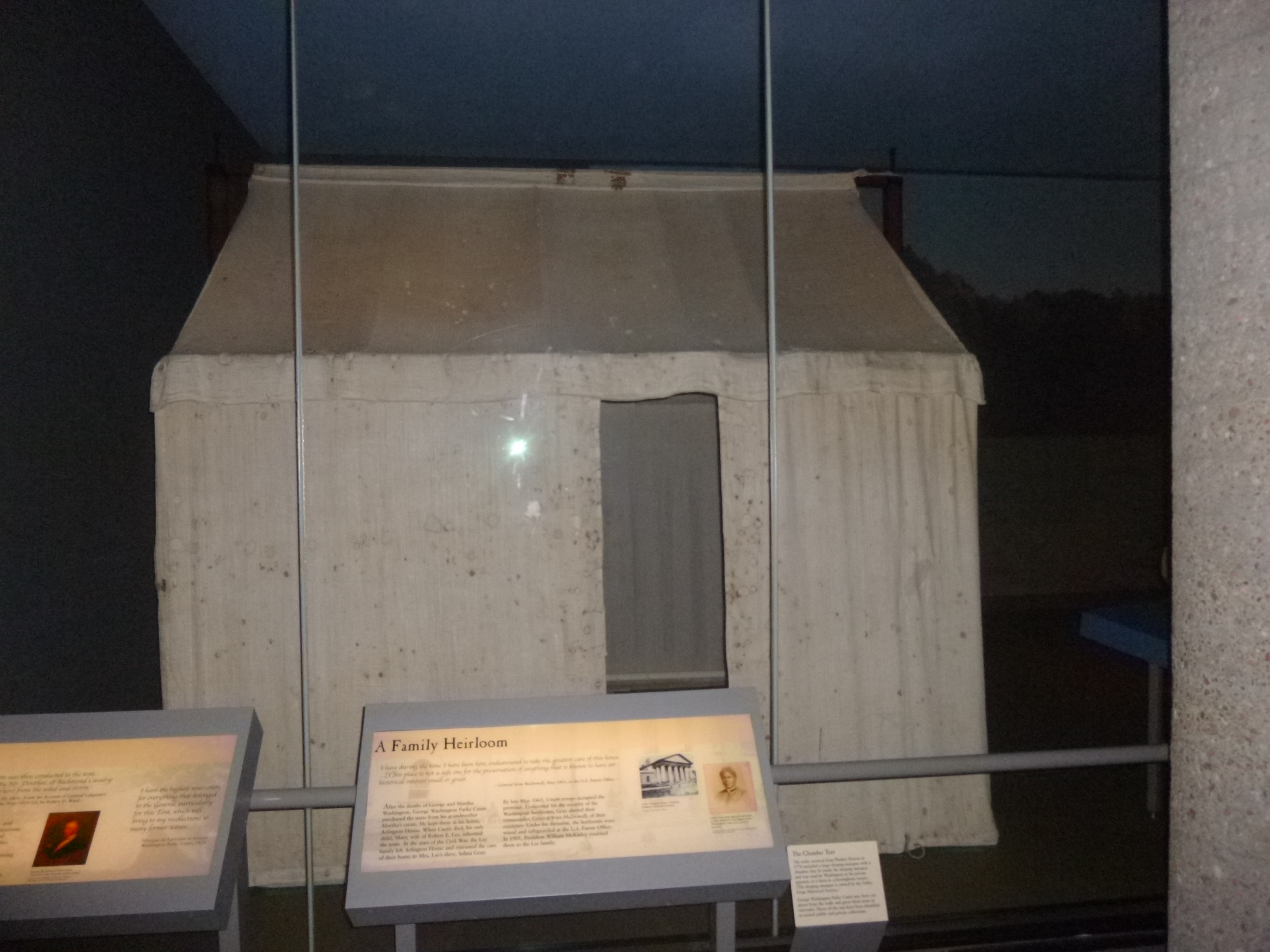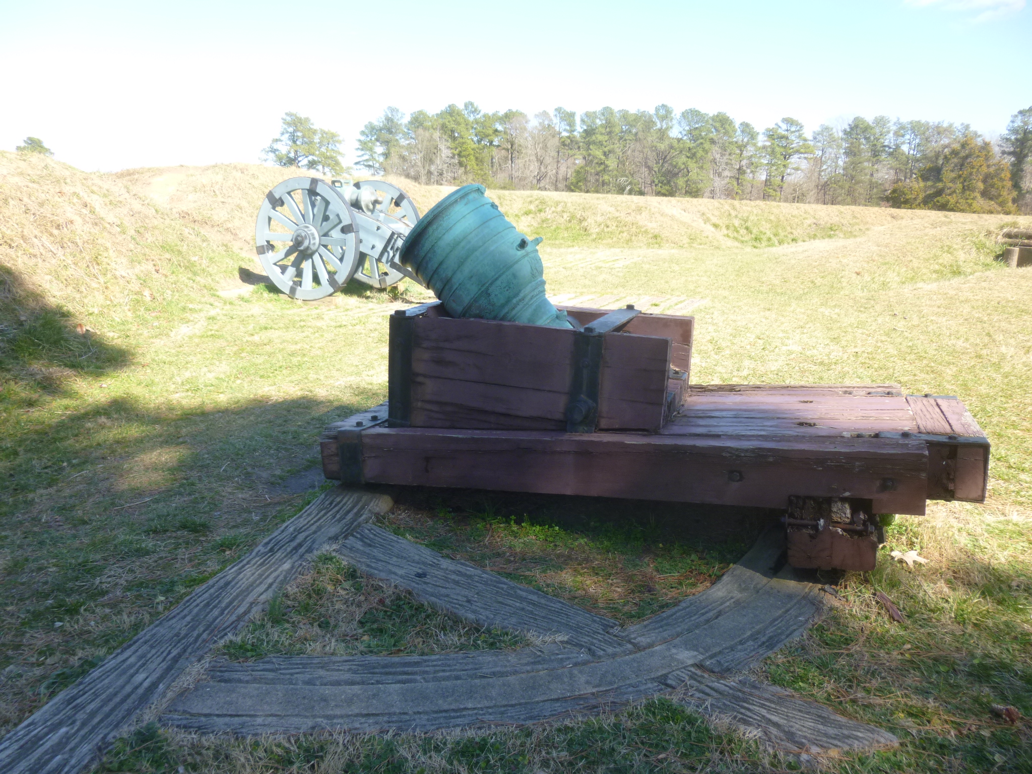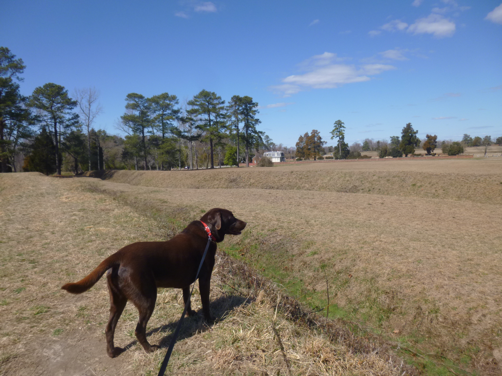 Then I drove toward Yorktown and stopped to get a map at the Yorktown National Battlefield. Tula and I did a lot of walking on the battlefields, and my brain had to switch gears from Civil War history to American Revolution history. Yorktown was the site of one of the last battles of the American Revolution. Again, trenches and siege lines were visible, and we walked by the encampment sites. George Washington brought his troops down from New York for this siege, and to be walking on battlegrounds that George Washington had walked on is a pretty amazing feeling of history. One of the little roads we walked on has been in continuous use for over 300 years – even before the American Revolution. I eventually made my way back to the Visitor Center so I could watch the video and look at the exhibits. The actual tents that George Washington used are set up and displayed under glass – somehow they survived despite use in the years following the war. I think they’re the only 18th century military tents in existence.