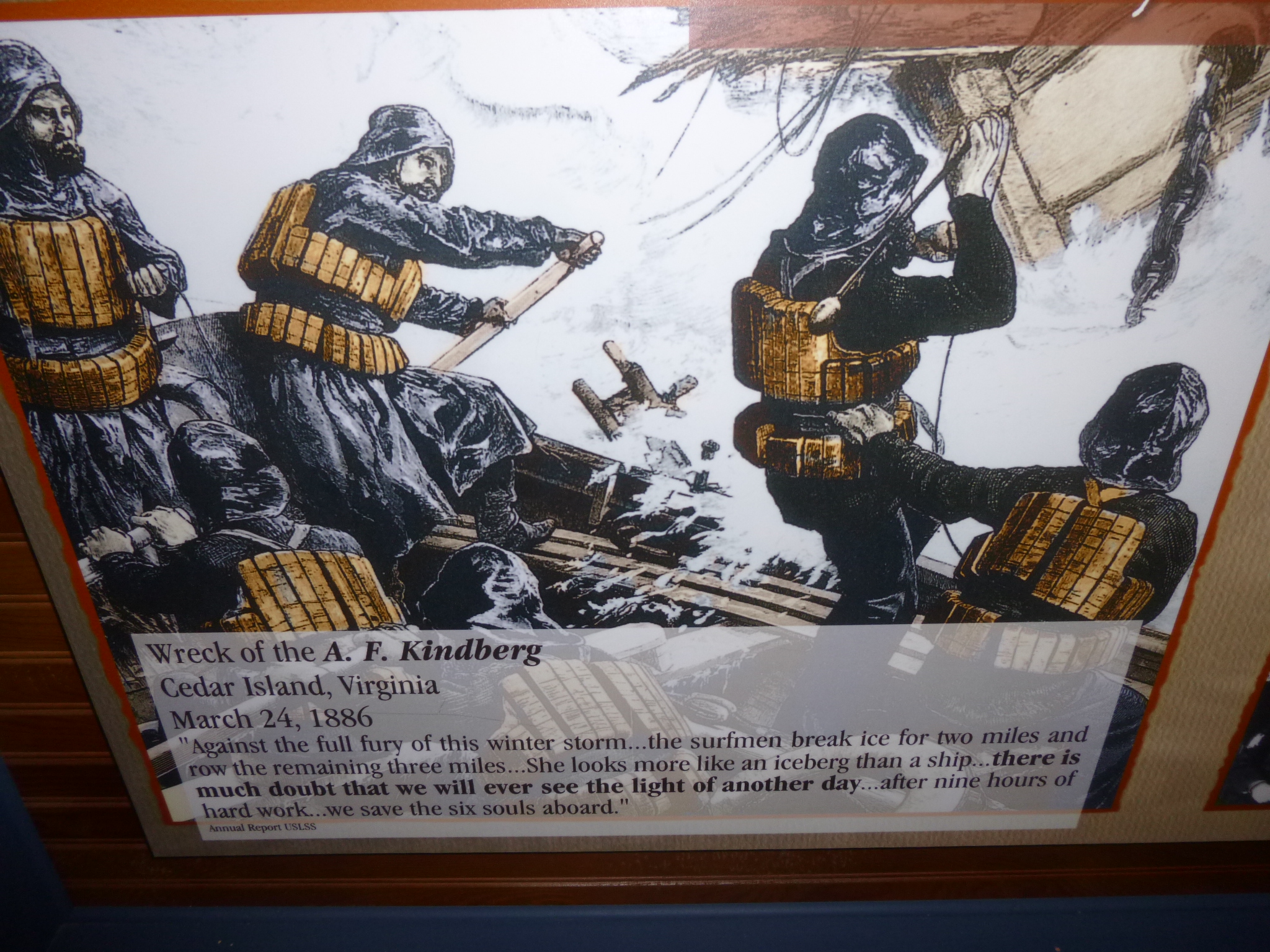 So after that unexpected visit, I continued heading north. I was aiming for the road to get onto Assateague Island at its northern end in Maryland, but then I decided to wait until tomorrow so I would have more time if I wanted to, because there was a visitor center and everything, and I didn’t want to be rushed. So I went to Ocean City instead, which is on the Atlantic Ocean, and that turned out to be a wonderful choice. There is a boardwalk that is over 2 miles long, and since it was the weekend, some of the little shops and food places were open, and there were lots of people out walking despite the fact it was kind of chilly and windy. At one end of the boardwalk there was a Life-Saving Station museum, and it was fascinating. Back around the turn of the century, life-saving stations were built along the outer banks areas in several states every 10 miles or so, since it was such a notorious place for shipwrecks. The men would work in shifts – usually a keeper and a crew of 6 “surf men”. They would patrol the beaches to look for trouble, or in bad weather, to listen for it. They would meet up with surf men from neighboring stations and exchange tags to prove to the keepers that the whole length of beach had been patrolled. There were about 19 life-saving stations, and over the years they saved over 7502 people from nearly 300 shipwrecks. The museum had their big boats, their torpedo devices for shooting a rope over the surf, a capsule that 2-3 people could get in to be dragged in to shore, and other stuff. It was really interesting – what a courageous group of men! And there was also a display of swimwear fashion over the years, and samples of sand from all over the world – the little bowls of sand on display looked like different spices.