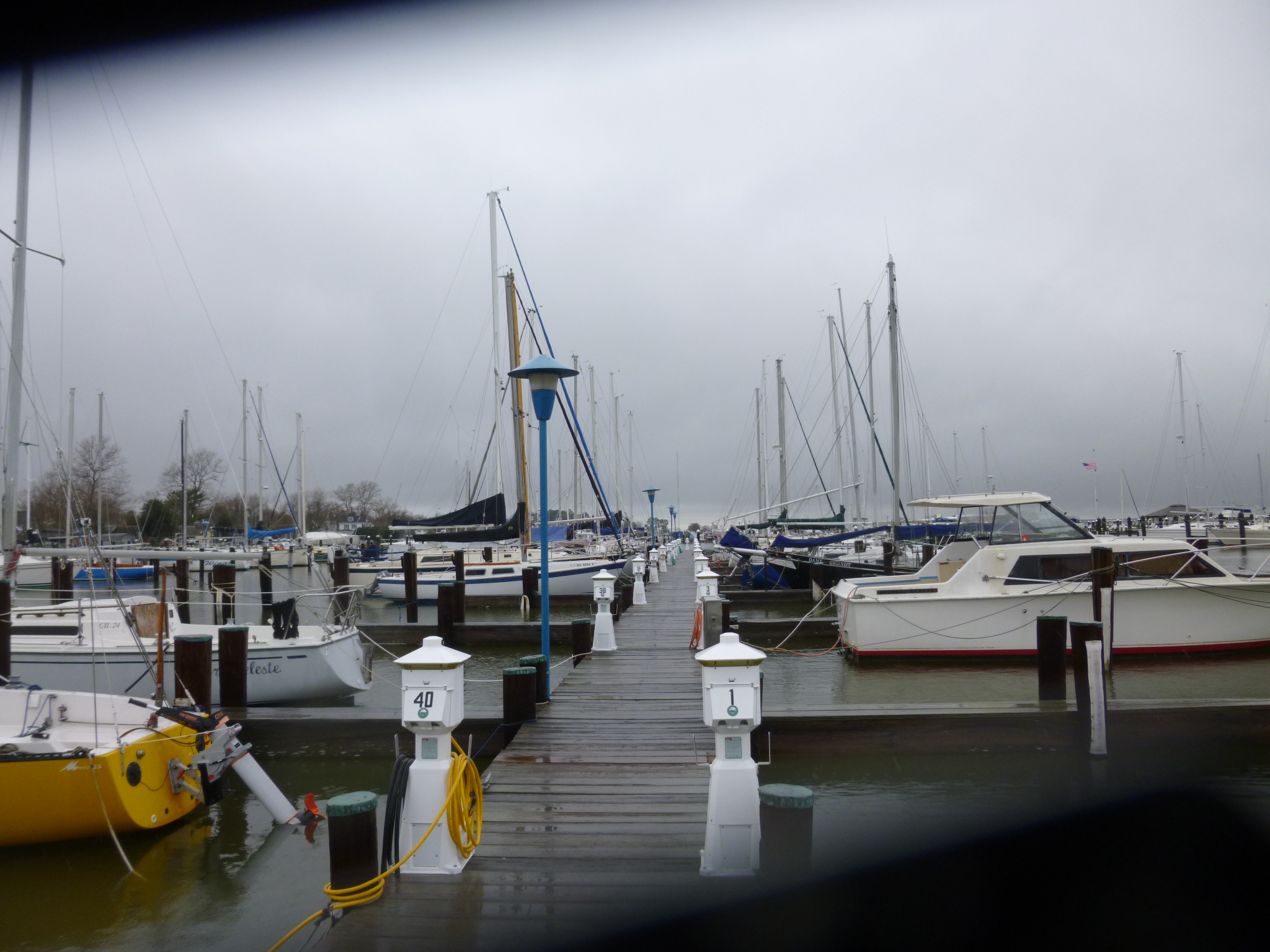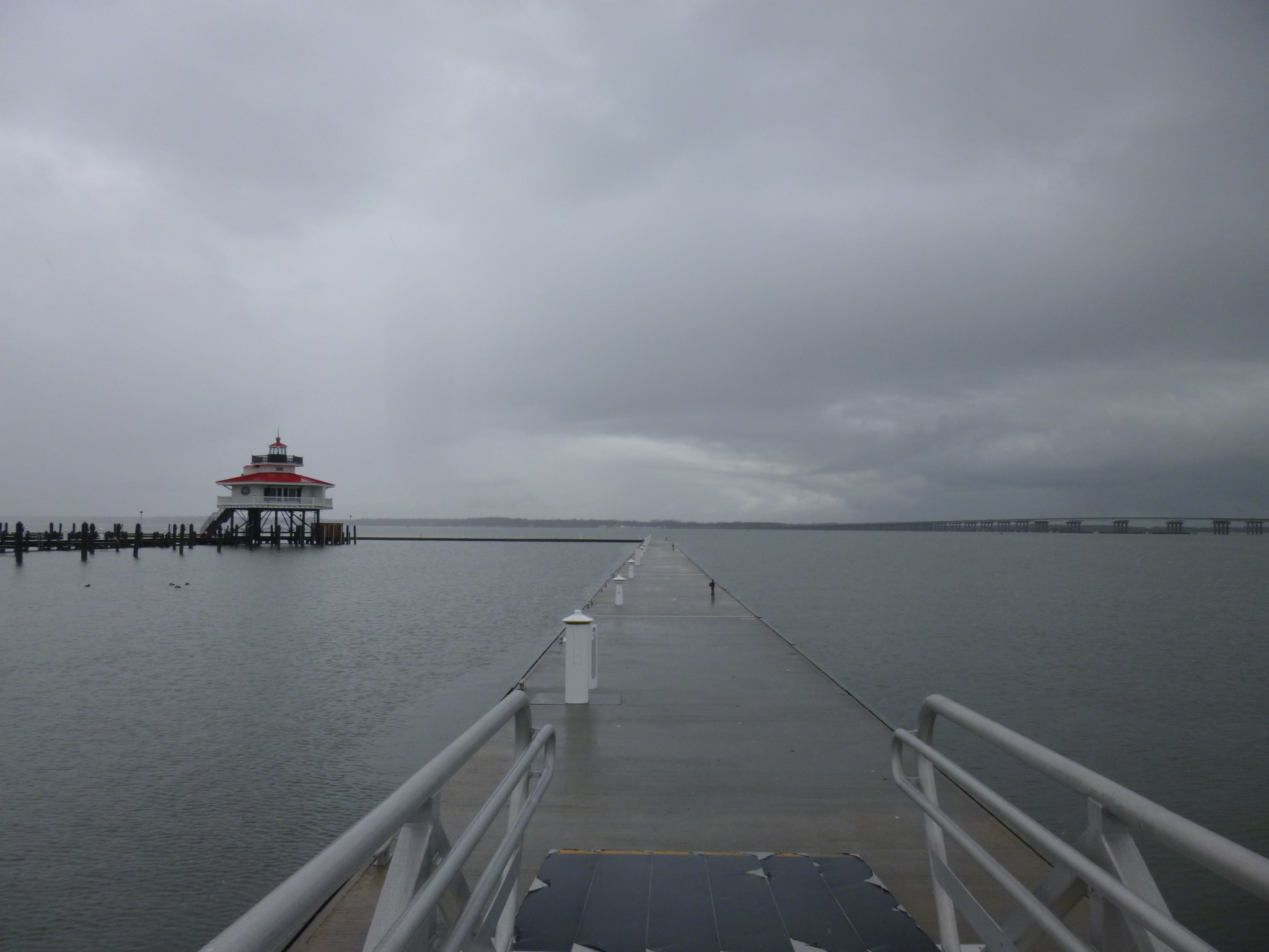 Then I drove west to the eastern shores of the Chesapeake Bay. It rained hard on the way over there, but began to let up a bit as we got closer, although it was still a gray day out. My plan was to meander north along the Chesapeake Bay, stopping in some of the little towns along the way. The first town I came to was Cambridge, founded in the late 1600s. Tula and I were able to get out for a soggy 2.5 mile walk, a bit through town, and a lot through old neighborhoods with big brick or wood houses built in the 1700s. There was a little park and marina with a river lighthouse, and I walked way out on the long docks by that. It started to rain again just as we got back to the car.
