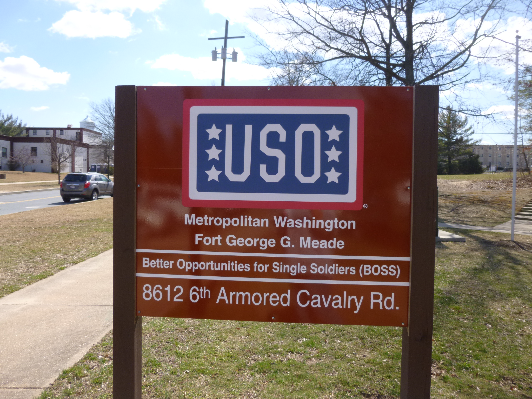I stayed in Jessup last night which happened to be sort of close to Fort Meade and the USO that was going to be my donation-of-day. So I set off for the base, and got turned around a bit, and finally found an entrance gate. But it wasn’t an entrance gate for visitors, so the guard gave me directions to the other main gate, but he left out a major road so that slowed me down temporarily again. I found the right gate, and the signs all said vehicles would be searched, but the guard just took my license and registration for a minute, then waved me through. It was another big base – basically a small city – but I found the USO with no trouble, and went in to make the donation. Two of the volunteers were busy sorting stuff behind the main reception counter, and I was a bit confused to see what looked like a bunch of costume jewelry! That was not what I would expect to see people sorting on an army base! They explained they were getting ready for a special event for the military wives/women on base – a Cinderella-for-a-Day bit of pampering. The USO had just moved into its new location in January, and the volunteers were very happy about that – not only was it bigger space, but it was right across from a lot of the barracks, which made it more convenient for many soldiers. And there were soldiers coming and going and enjoying the amenities. I enjoyed seeing some of the base while I was driving in and out.