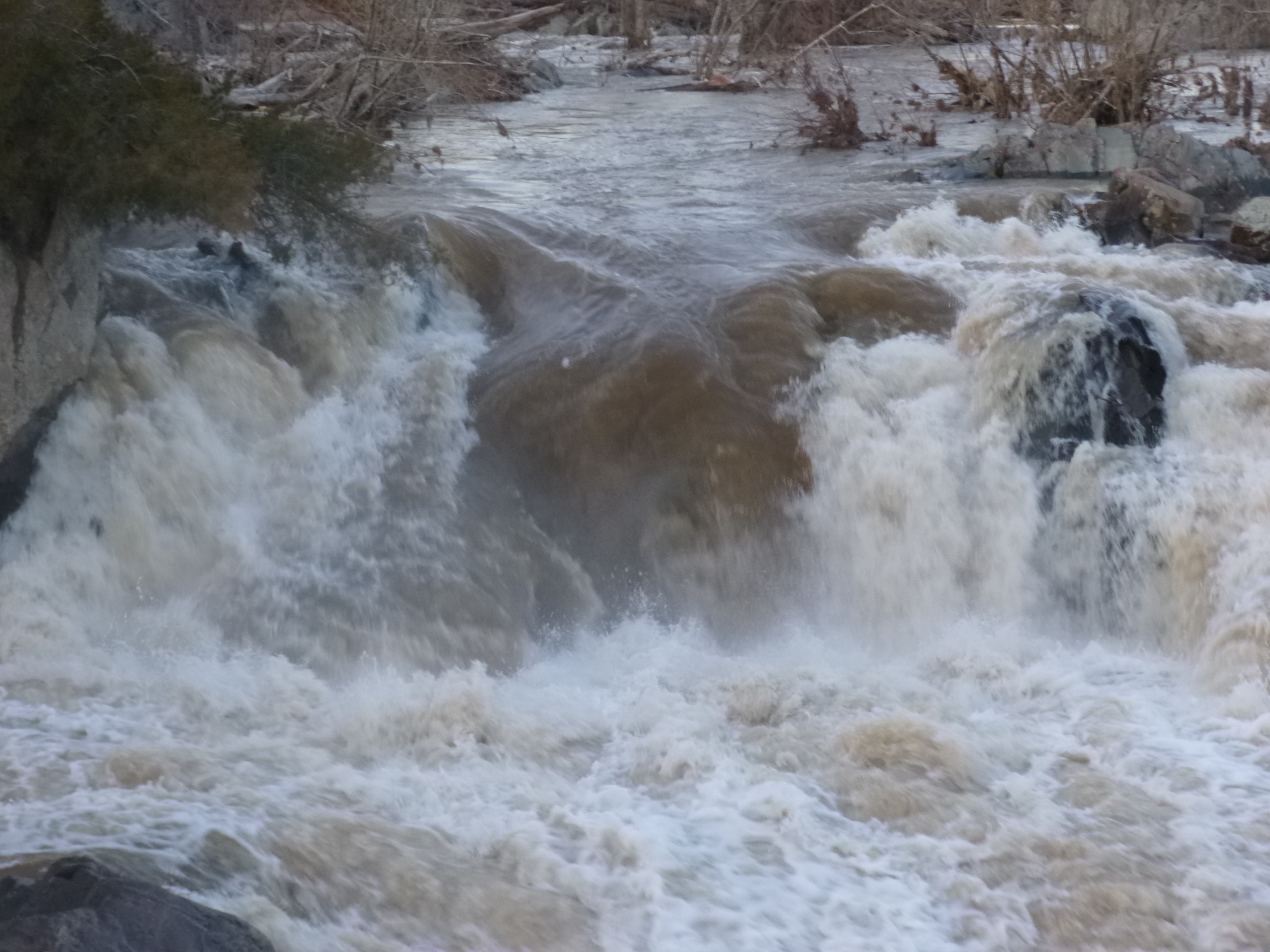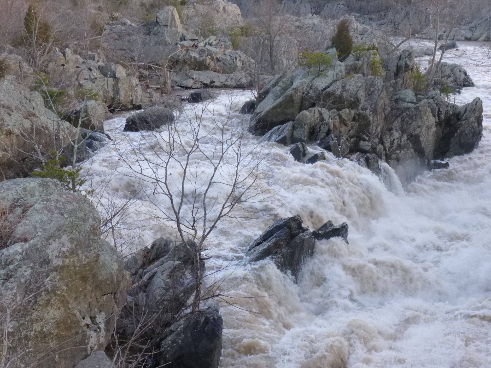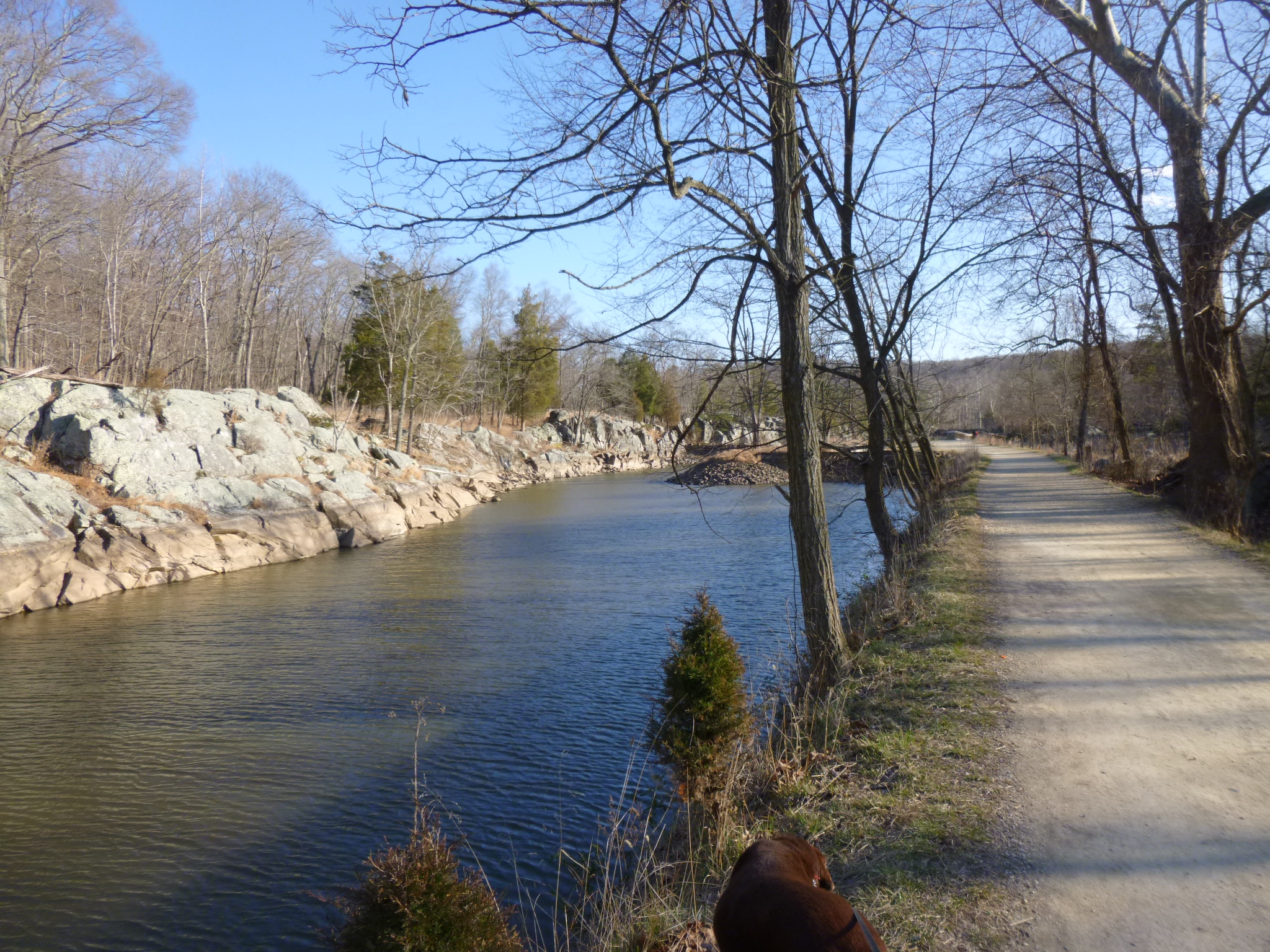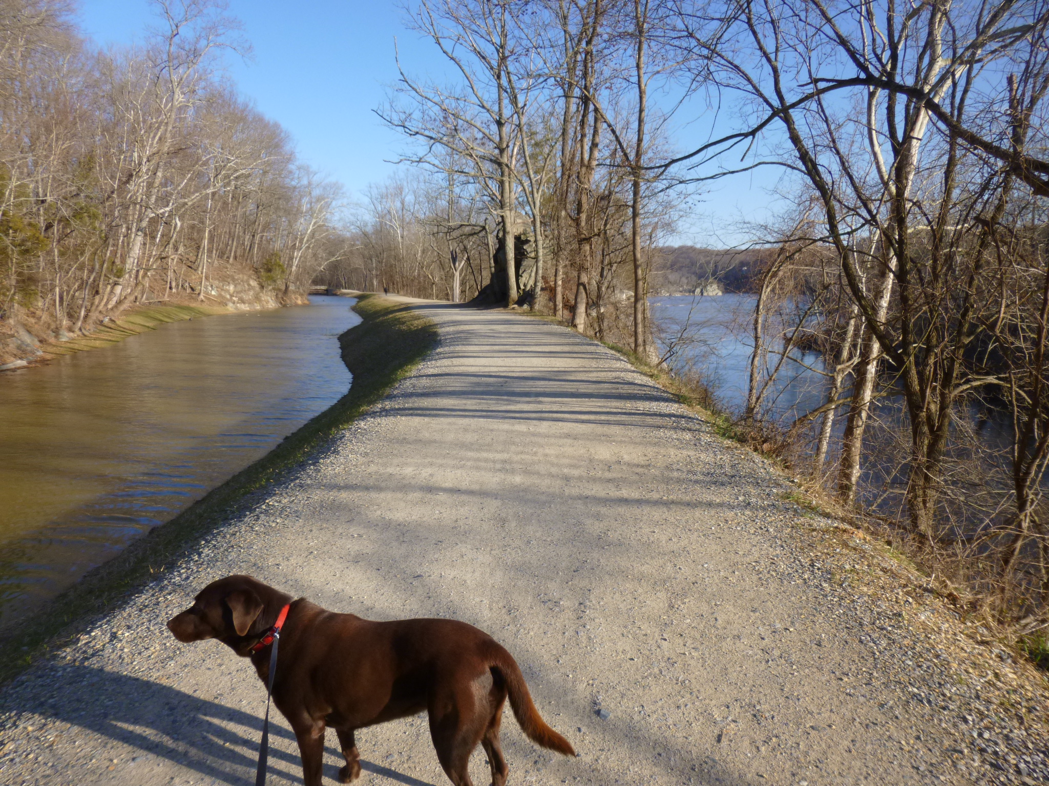 After my visit to Clara Barton’s house (and I was the only person on the tour!) the ranger directed me to the C and D Canal Historic Park, where the towpaths are now used as walking trails. It was only about a 15 minute drive away – C and D stands for Chesapeake and Delaware canals. The canal had to be dug along the Potomac River because the river falls about 60 feet as it approaches Washington DC, and the whitewater made it impossible to navigate. Maryland has a big canal system, and canals were very labor intensive to build. The canal also connected the Delaware River to the Chesapeake Bay. They only served their purpose for 20-25 years before the trains started hauling everything, although they still continued to be used for a while. Mules would pull the barges and stuff upstream and the tow paths are still there and make awesome walking paths. (And I couldn’t help but think of the elementary school song about the Erie Canal and the mule named Sal!) Tula and I walked over 4 miles along the canal, and even though it was cold out, it was one of the most peaceful, beautiful walks I’ve taken in Maryland. There were lots of ducks and herons, and it was so pretty following the canal along the Potomac. There was a boardwalk leading to the Great Falls and a little island, but dogs weren’t allowed, so I put Tula back in the car after our canal walk, and went back to the falls. There were a couple pedestrian bridges over the river, and the Potomac was a churning, turbulent mass of whitewater – nothing could have negotiated its way downstream or up – which was why the canals were built. The power in all that thundering water is something to see and hear, and I could sometimes feel the spray. I got an extra mile of walking in today, and I don’t think a day could be any more full and wonderful!