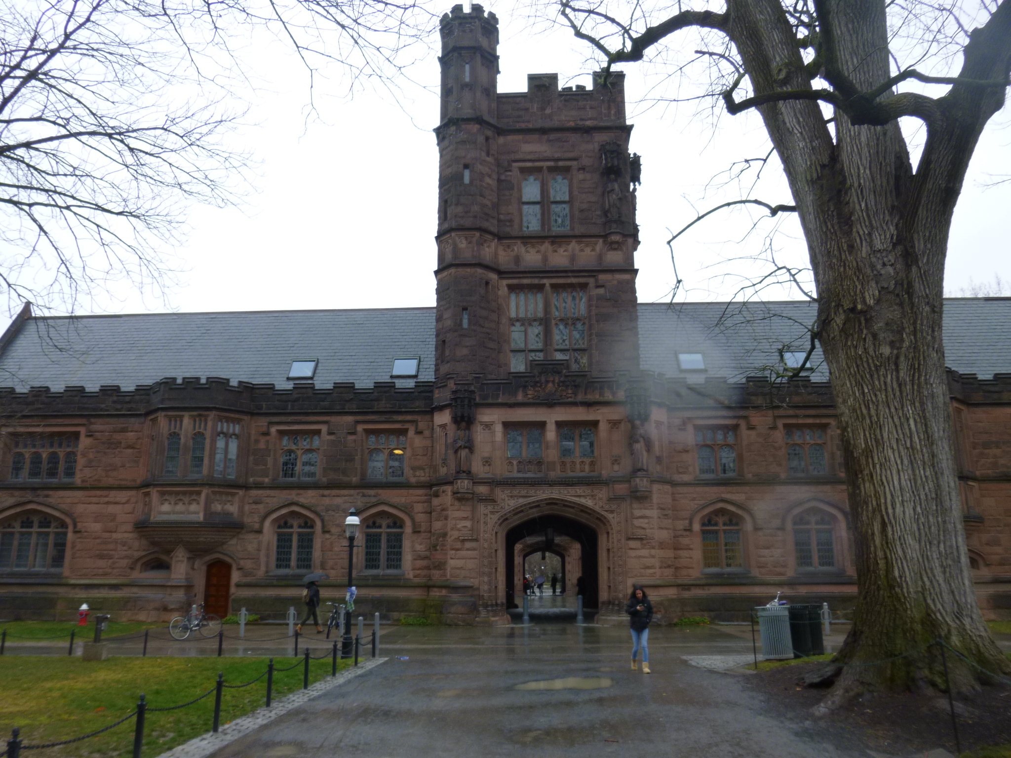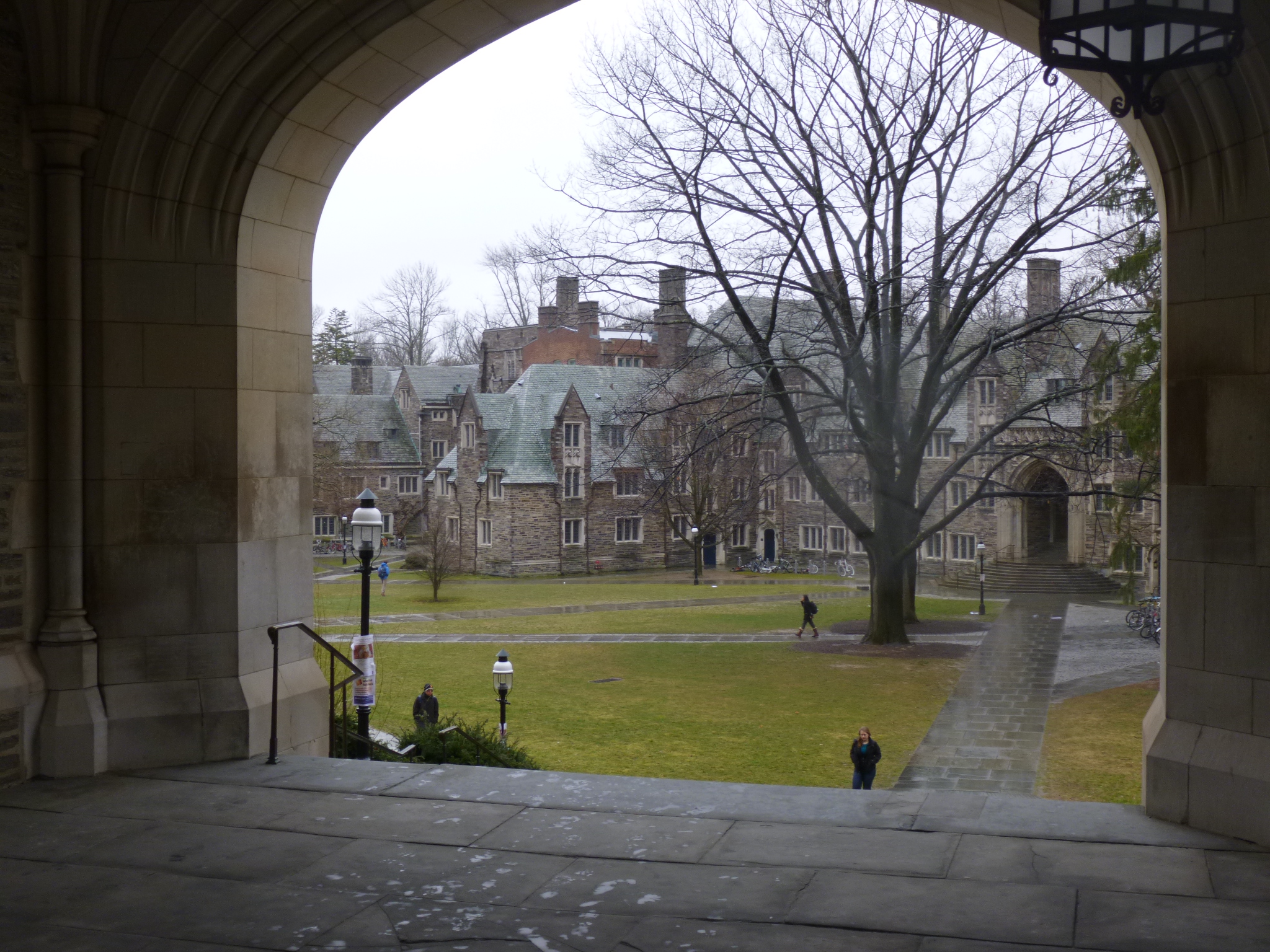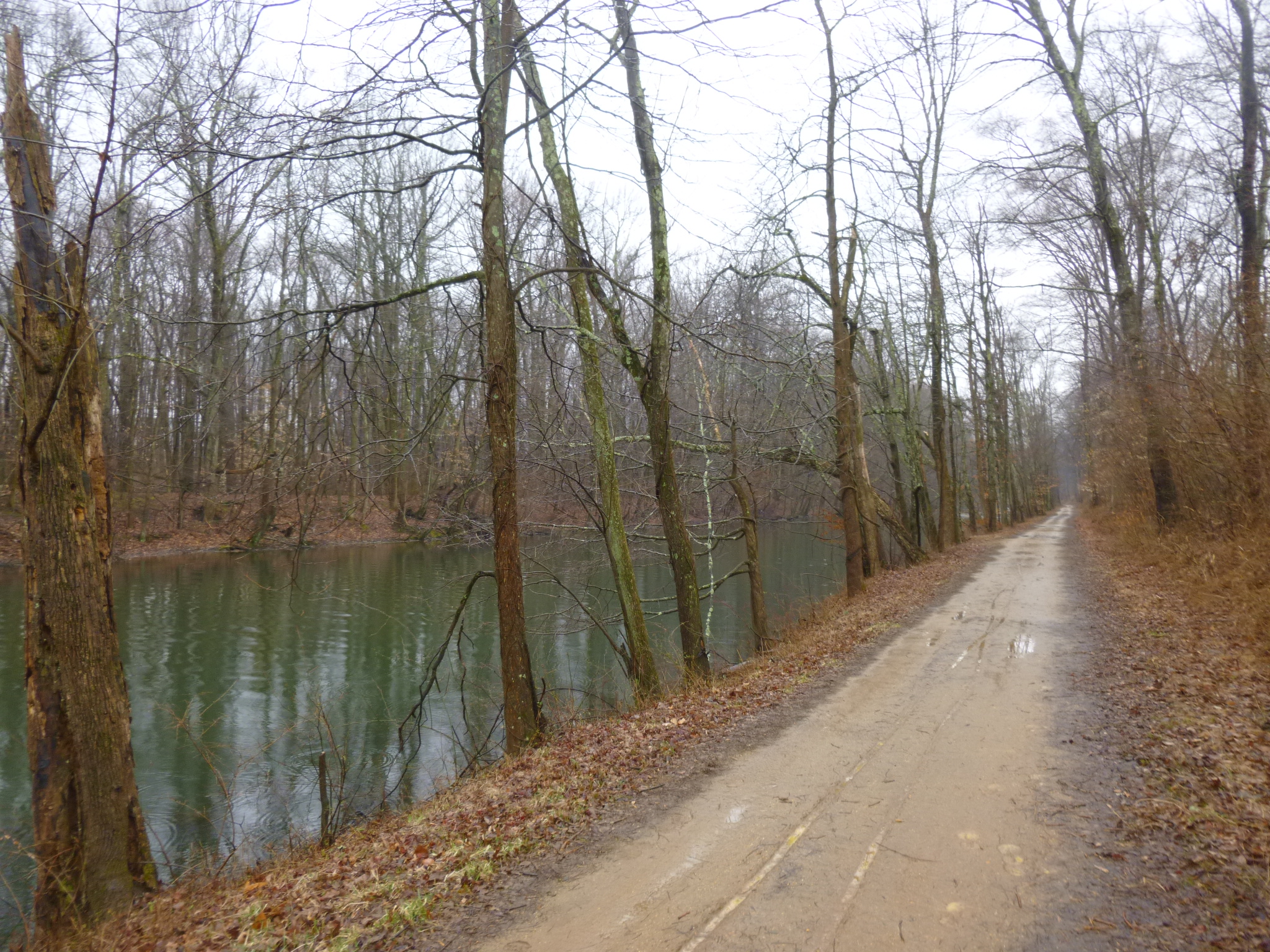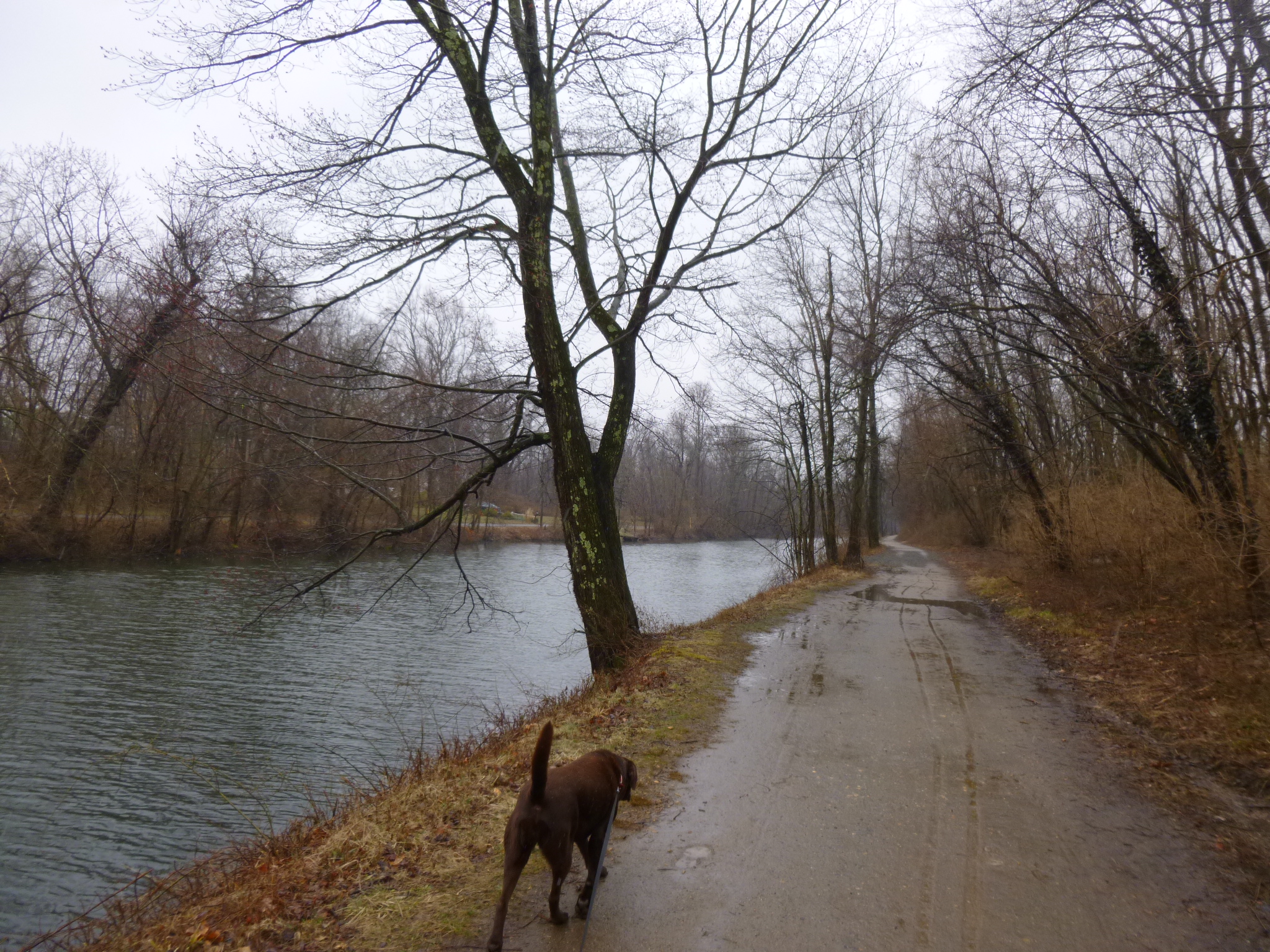 Then I was ready to get Tula out for a walk despite the rain/snow/slush. I was going to head to Princeton, which was just a straight shot up the road, and along the way I crossed the D & R Canal (Delaware and Raritan Canal) and its tow path, which I knew was around somewhere. So I pulled off into the small parking lot, and set out for a walk. It was kind of a muddy mess though with all the precipitation, and we only did about 3 miles. Tula was a mess – she doesn’t go around puddles; she trots right through them! It was a good thing I had towels back in the van, so I did the best I could, but we were both kind of sloppy. I drove into the town of Princeton and found a place to park, and that was one of those wonderful places to set out for a long walk – with its fun downtown area, and great neighborhoods, (one looked like an old English neighborhood with half-timber homes), and of course the college campus, there was lots to see and enjoy. We walked for a couple hours in a misty sort of snow and covered 5 miles all over the place. Sometimes when I’m walking on college campuses, people sort of focus on Tula with a wistful expression, and I imagine they’re missing their dogs back home, and then I sometimes overhear them starting to talk about the dogs in their family. So despite the weather, I did all my walking, and headed back to the motel in the heavy rush hour traffic, which took a while. Once there, it felt good to get dry and heat up some soup in the microwave! My camera’s been giving me problems for the last week or so – I’m pretty sure there’s some grains of sand that are affecting the zoom lens, and now it’s totally stuck. I messed around with that for quite a while then I dug out my nice underwater camera that my mom gave me years ago, and got that all ready to go – it takes really nice pictures on land too, so I have a back-up plan while I figure out what to do with the other one. I don’t think Tula budged for the rest of the evening, and Dancing with the Stars was on (yes, I’m a fan!), so it was a cozy way to end a chilly wet day! Tomorrow’s forecast is warmer with some sun.