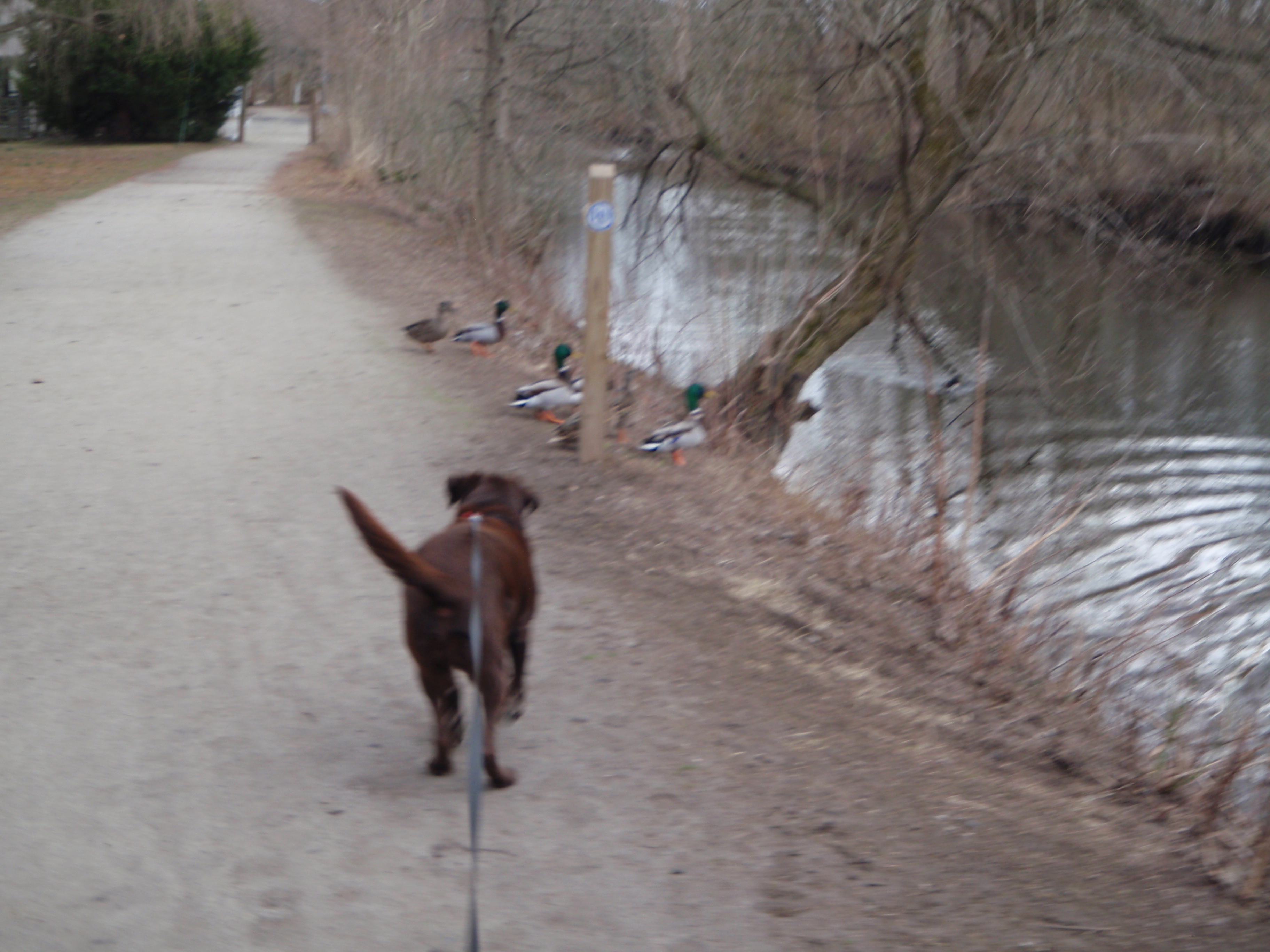 I found a place to leave the van, and Tula and I got out for a long walk. We went all through town and it was a wonderful one to wander through – lots of old buildings, and antique shops and unique things to see. There were even several flag collection boxes – not quite sure what those are for. Once again it strikes me that I’m seeing so much more by finding good places to walk instead of just driving through. Since I’m not much of a shopper, it doesn’t bother me at all not to be able to pop in and out of stores (if there was something I was really interested in seeing, I could always go back once I put Tula in the car.) I simply enjoy walking past and seeing such a huge variety of things. I headed down by the river and figured I would find the canal nearby, and indeed I did. So we walked a few more miles on the towpath, and this time it wasn’t muddy. This was part of the same canal system that I was on yesterday – the canal cuts across a good chunk of the state. The miles and miles of canals in this area were all hand-dug – mostly by Irish immigrants. They’re about 8 feet deep and seem to vary a little in width, and some of the locks and lock houses are still around. It was such a labor intensive task, but before the trains came, they really were a time saver in shipping goods back and forth. Tula had a bit of a challenge in the first part of the canal walk – there were so many ducks and geese that she had a little trouble restraining herself, and once pulled the leash right out of my hand. She made a number of “false charges” at them – she pretty much knows exactly how much leash length she has! Another time she just looked longingly at the ducks in the canal, like she wanted to join them, and I began to wonder if she was going to try to get in the water, but she just watched them from the towpath. I only walked a little over 5 miles today – with the extra miles I’d walked earlier in New Jersey, I was ahead of the game, and I wanted to save the rest of my miles for tomorrow.