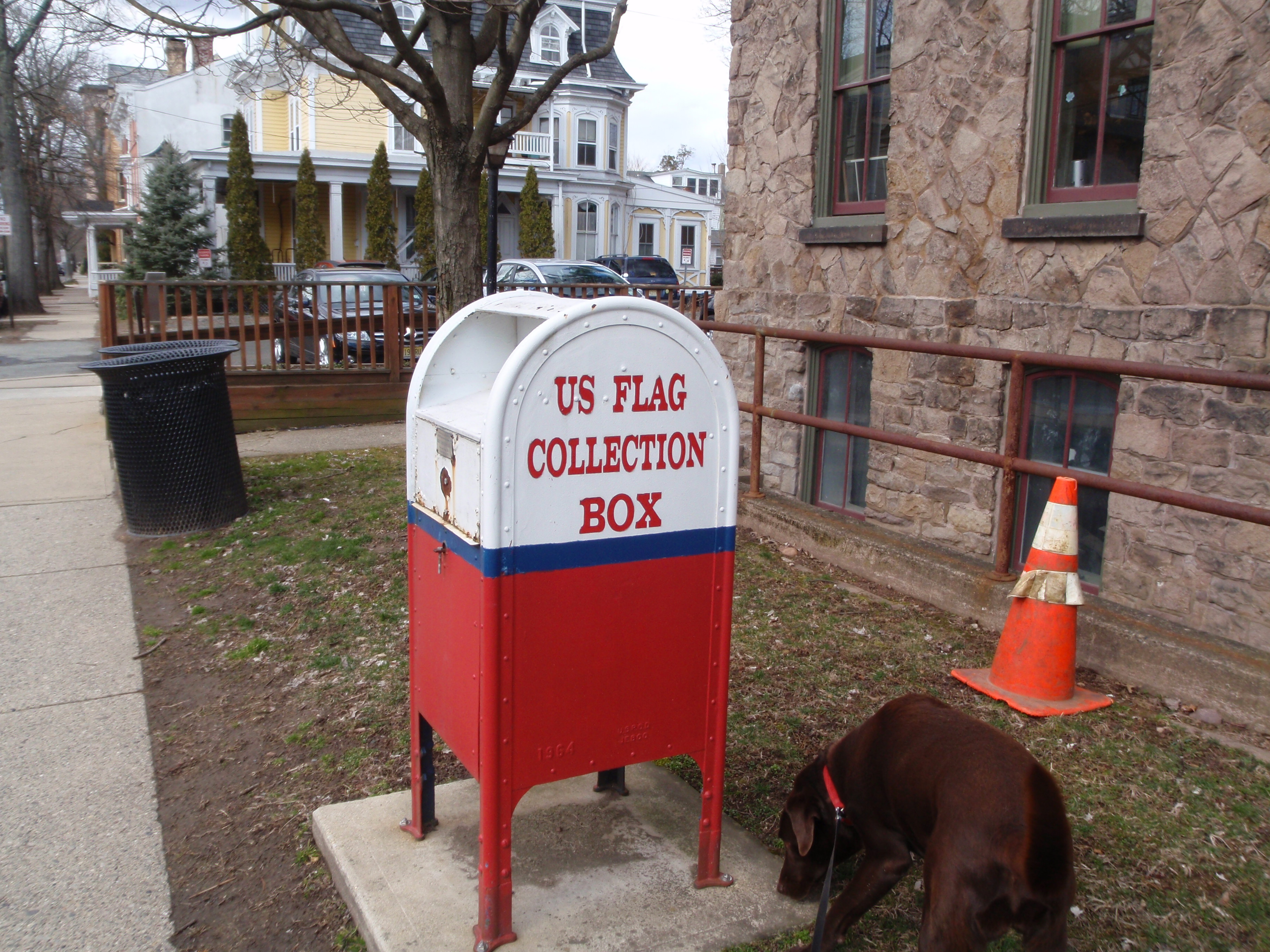 Re: the flag boxes. They are collection sites for torn or otherwise damaged flags – they are picked up by Scouts and disposed of with the proper etiquette/ceremony by Scouts or vets. They were an Eagle Scout project, as I recall.
