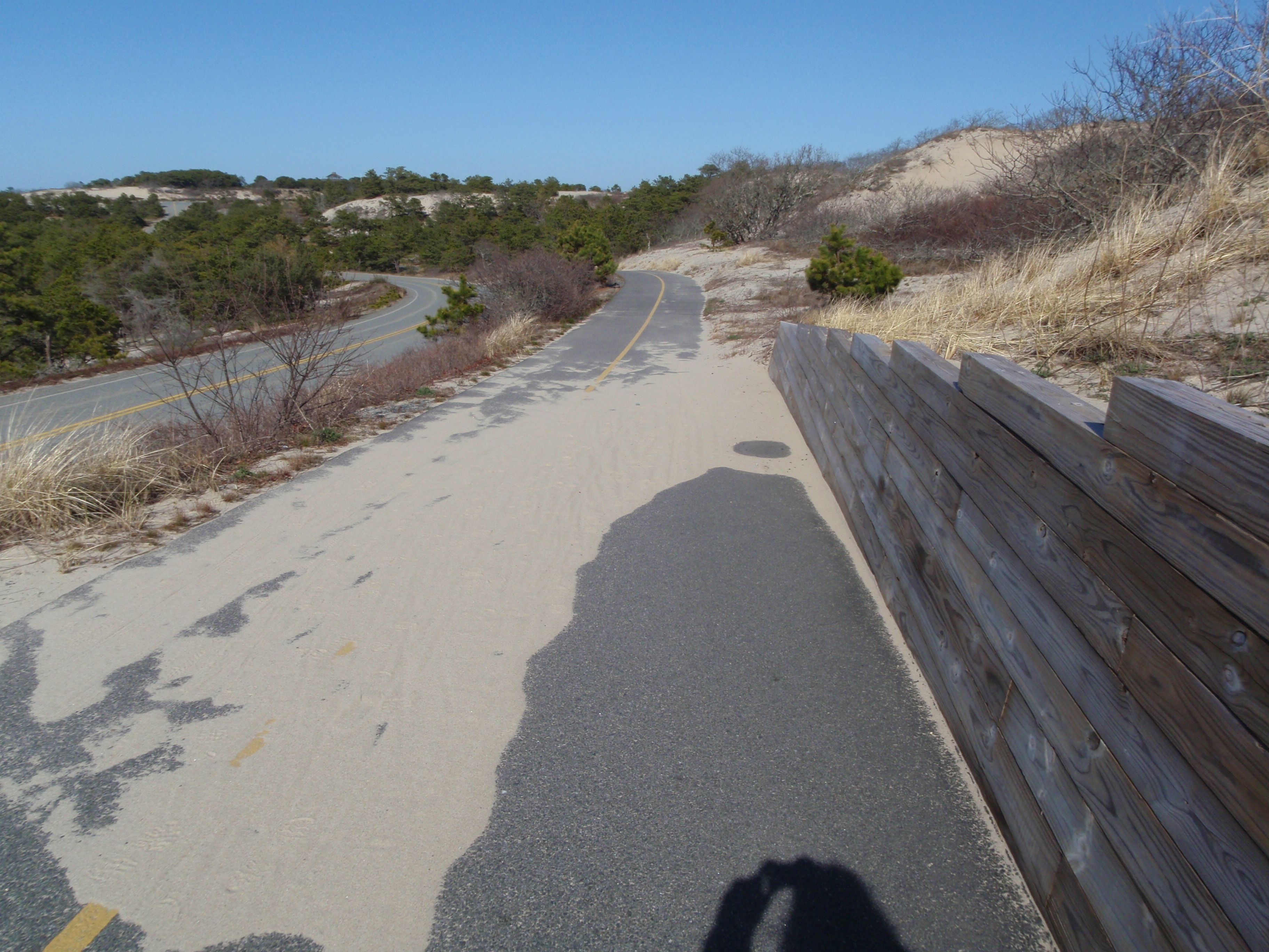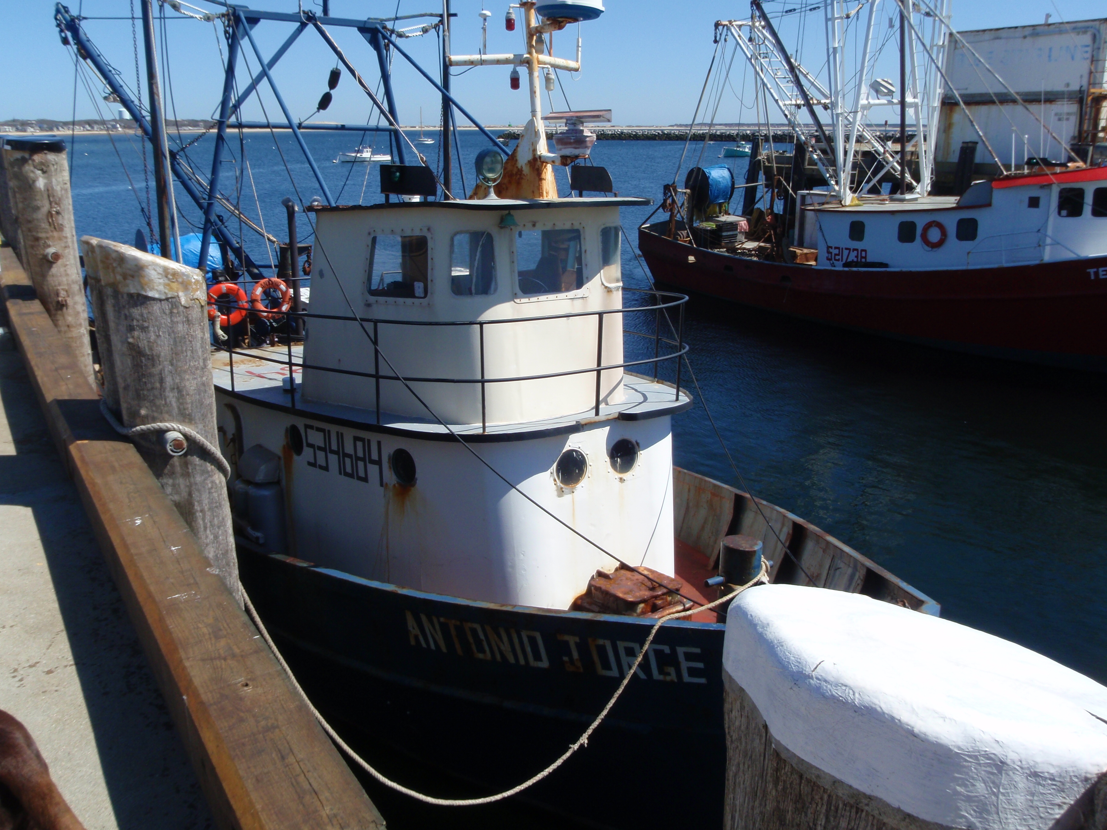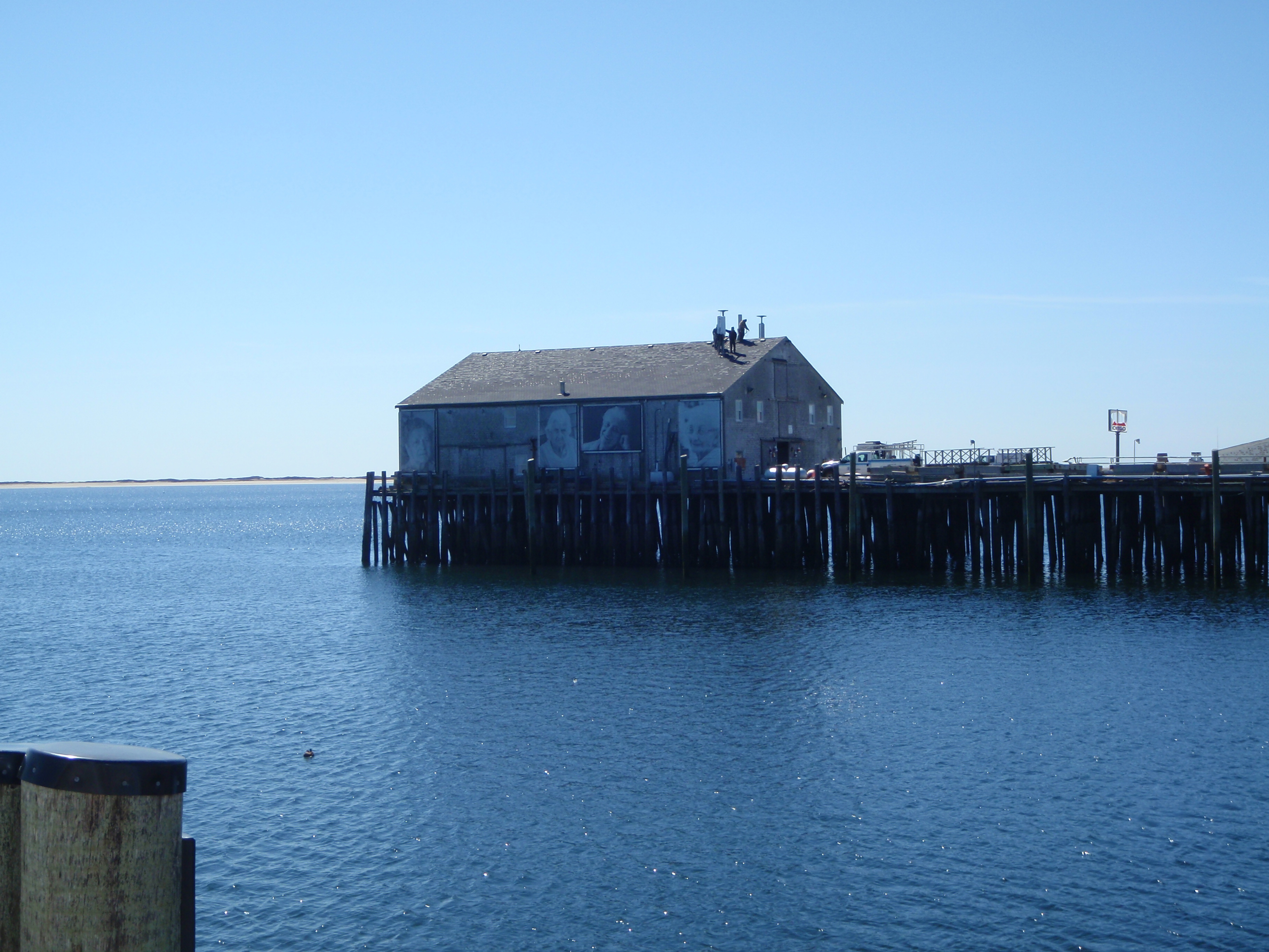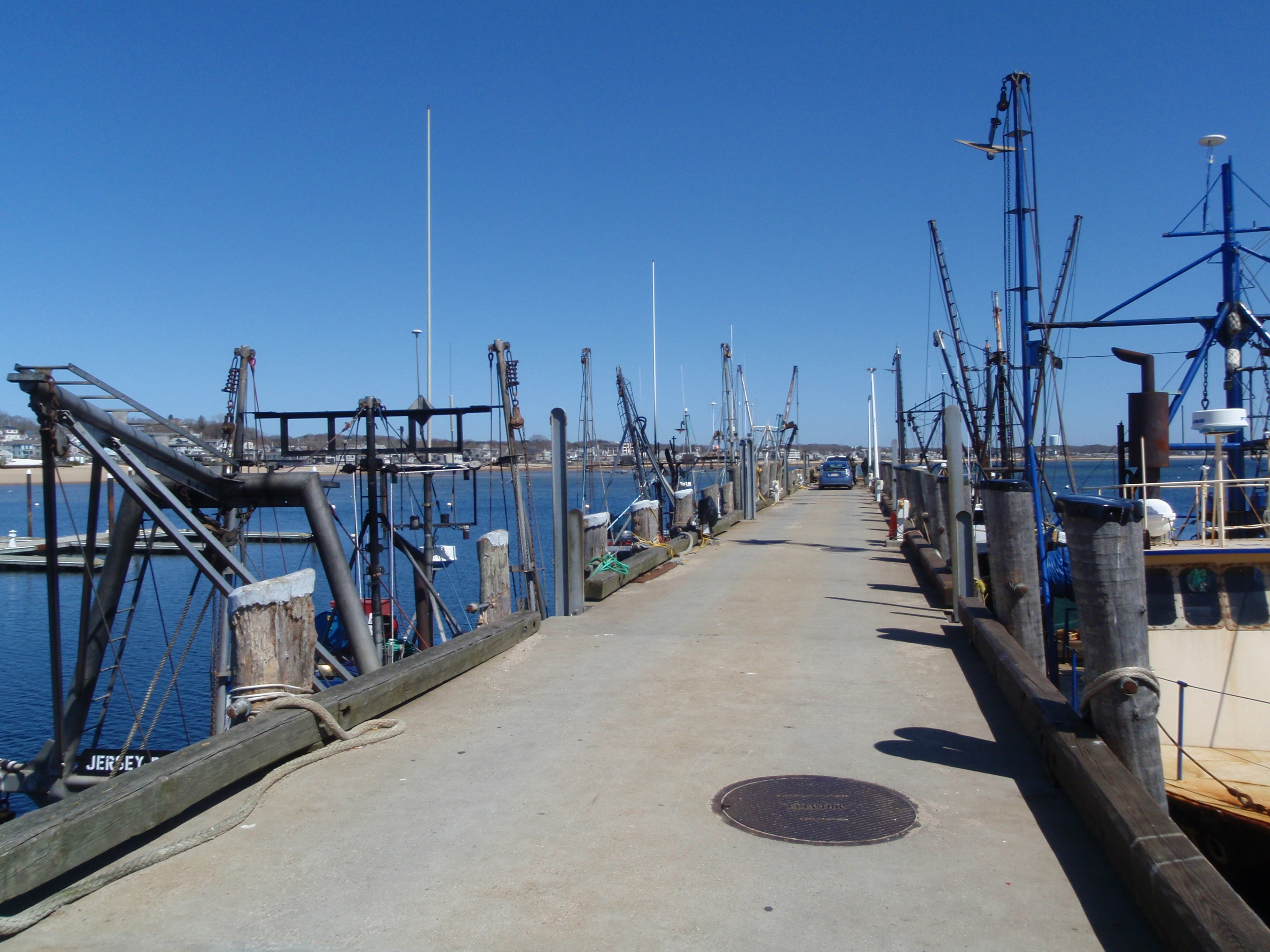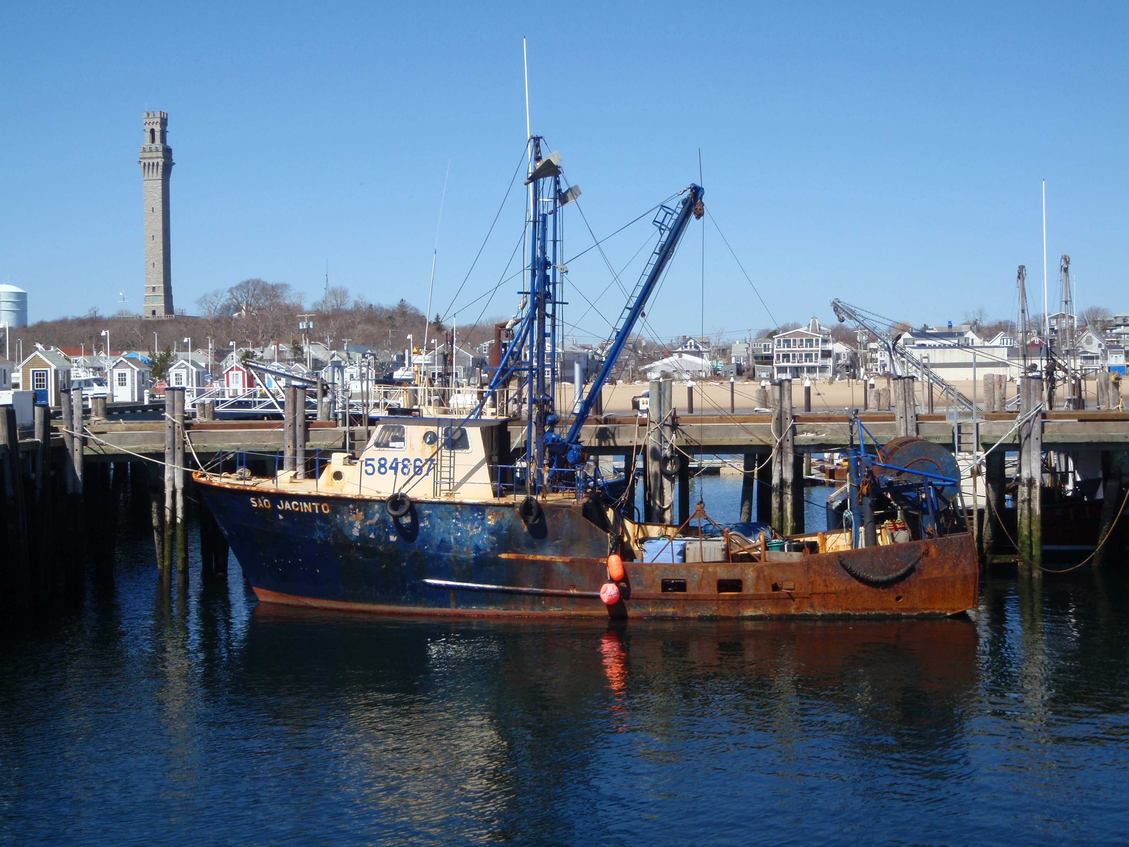It was a pretty, sunny day out, and Tula and I started off with a long walk through Provincetown. The first thing I stopped to look at was a towering memorial to the pilgrims on the Mayflower, which actually landed here first and the pilgrims stayed for about 5 weeks before making their way across the bay to Plymouth. Then we walked through town, and even though quite a few shops were still closed (many won’t open until mid-May), there were a lot of people wandering through town. It’s an artistic community, and it seems like there’s a gallery or 2 on every block. We walked down by the waterfront, and out on the big pier, and saw a lot of shrimp boats tied up to the dock. There seems to be a big Portuguese community here too. It was interesting to be able to look down into the boats to see all the nets, pulleys, cables, boots, rust – evidence of a lot of hard work!