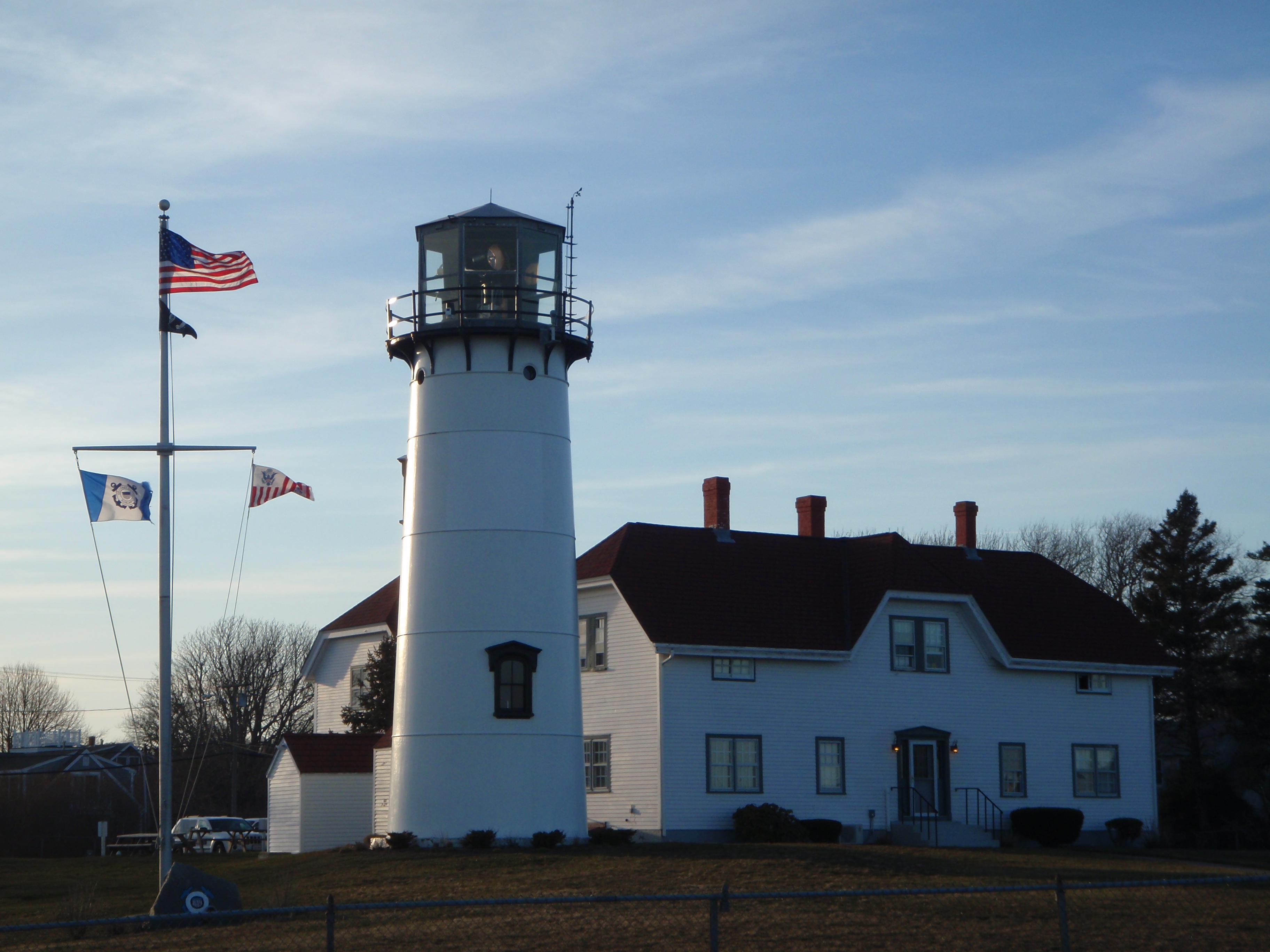 I decided to start the drive back down (up?!?) the cape, and didn’t get very far at all before I saw a paved trail through part of Cape Cod National Seashore. So I got out and walked nearly 4 more miles – Tula couldn’t come on that walk so she napped in the van. Then I enjoyed a pretty drive down to Chatham at the “elbow” of the cape. I almost hit a fox that darted out in front of me – I didn’t expect to see one all the way out by the end of the cape. When I saw a fox in Maryland, it was also at the far end of a peninsula jutting out into the Chesapeake Bay. Then I saw a bunch of wild turkeys. I’ve seen a few yellow road signs in this area that say ‘thickly settled’ and I don’t know what that means. I drove around Chatham a little and went down by the water where I ran across a coast guard station and a lighthouse. Tula and I got out to walk there, and mostly we went through charming old neighborhoods where the homes had cedar shingles and it just seemed like such a typical New England seacoast town. After a couple miles, I was feeling the cold and the sun was going down so I headed back. I passed a small seamen’s cemetery with some memorials – the sea has claimed its share of Chatham residents. There were some plaques in the little parking lot about some of the daring rescues the coast guard crews have made over the years, including one in the 1950s when a tanker broke completely in 2 during a violent storm and the coast guard crew went out in 60 foot seas (and their rescue boat isn’t all that big) and rescued 32 people, and made it back to shore without their compass which had been washed overboard. Pretty amazing. I was absorbing all of that when I turned around to get back in the van, and I just happened to catch 2 coast guards beginning to lower the flags for the day. I thought there were 2 of them because there were a couple flags to take down, but one guy lowered the flags by himself while the other guy simply stood at attention and saluted the whole time. When the flags were folded, they both saluted and went back into the station. I found that very touching – they weren’t doing this as a show, or for an audience – I doubt they even saw me watching from across the street because I was on the other side of the van. They were just showing respect. A nice way to end the day. I drove a little farther and stopped for the night in West Yarmouth – I thought I’d be back on the mainland tonight, but I poked around a little too much!