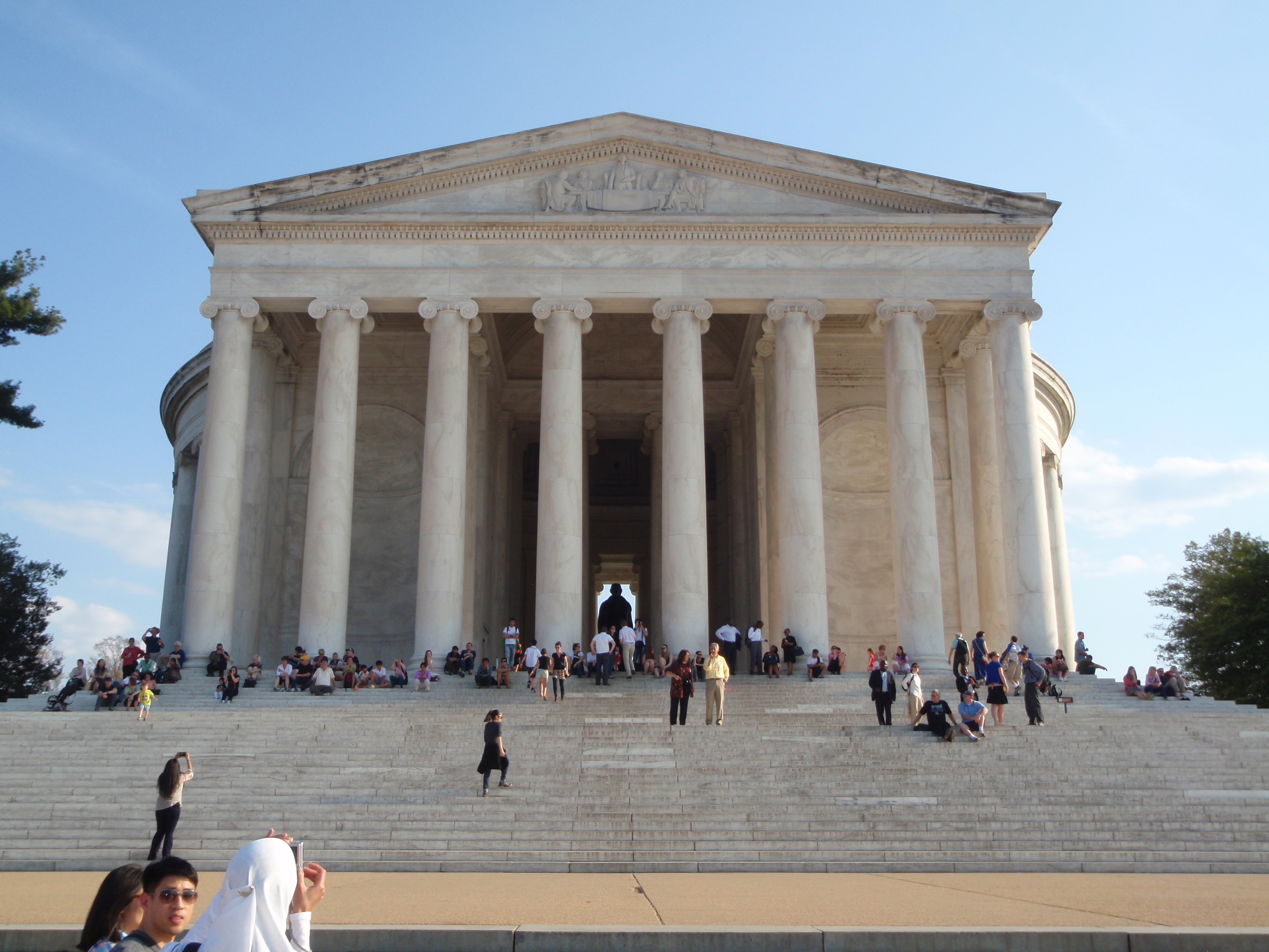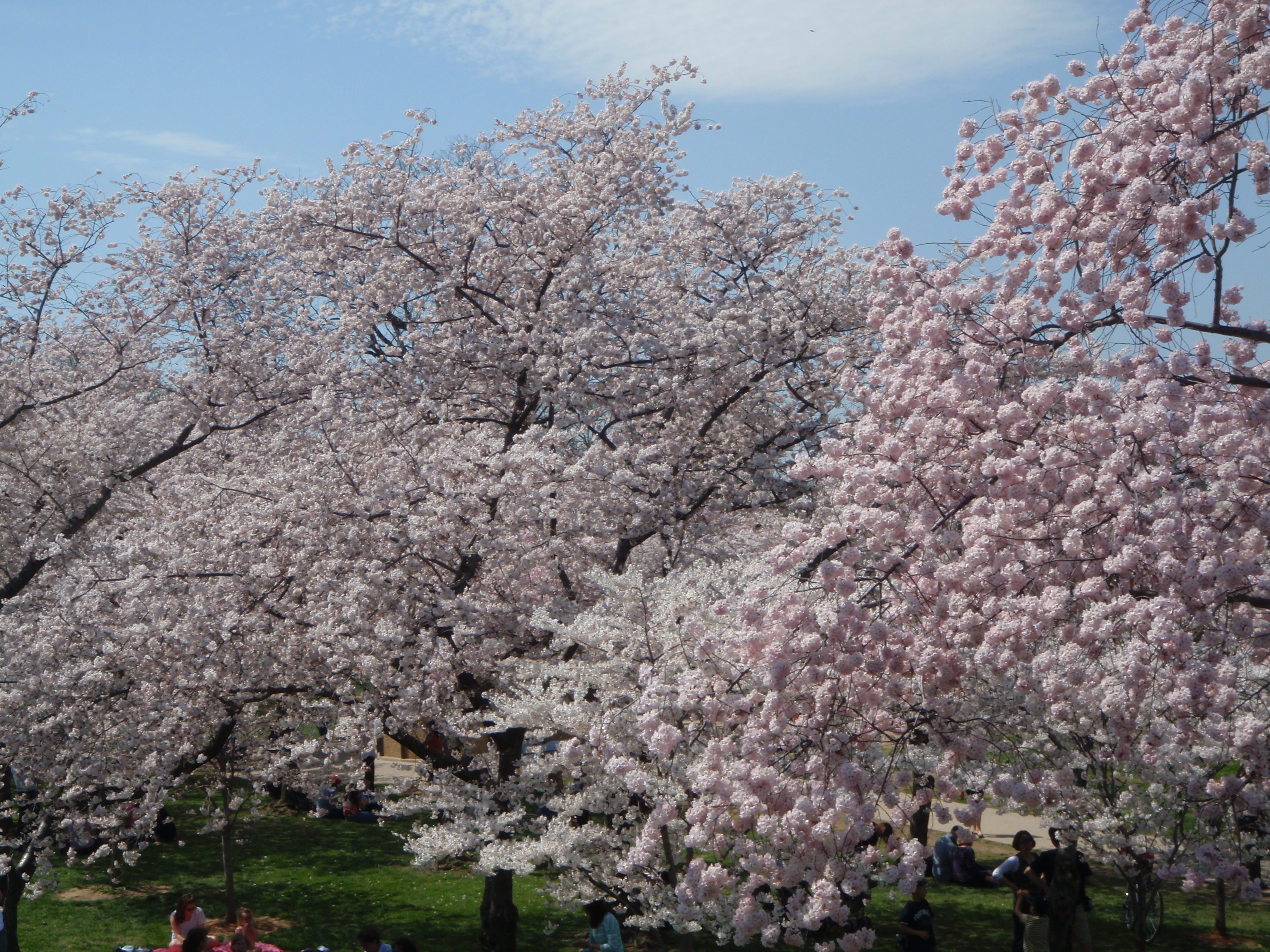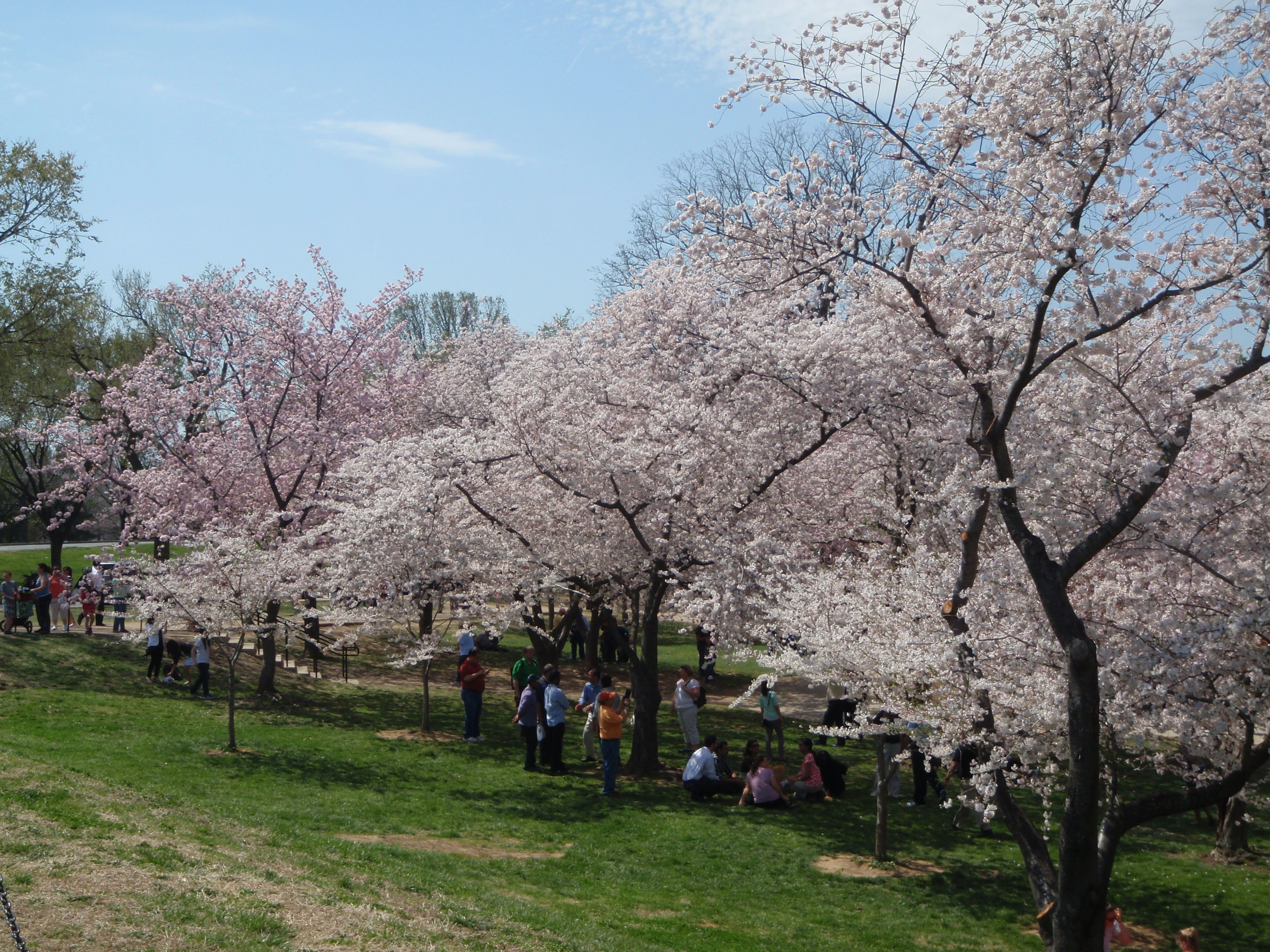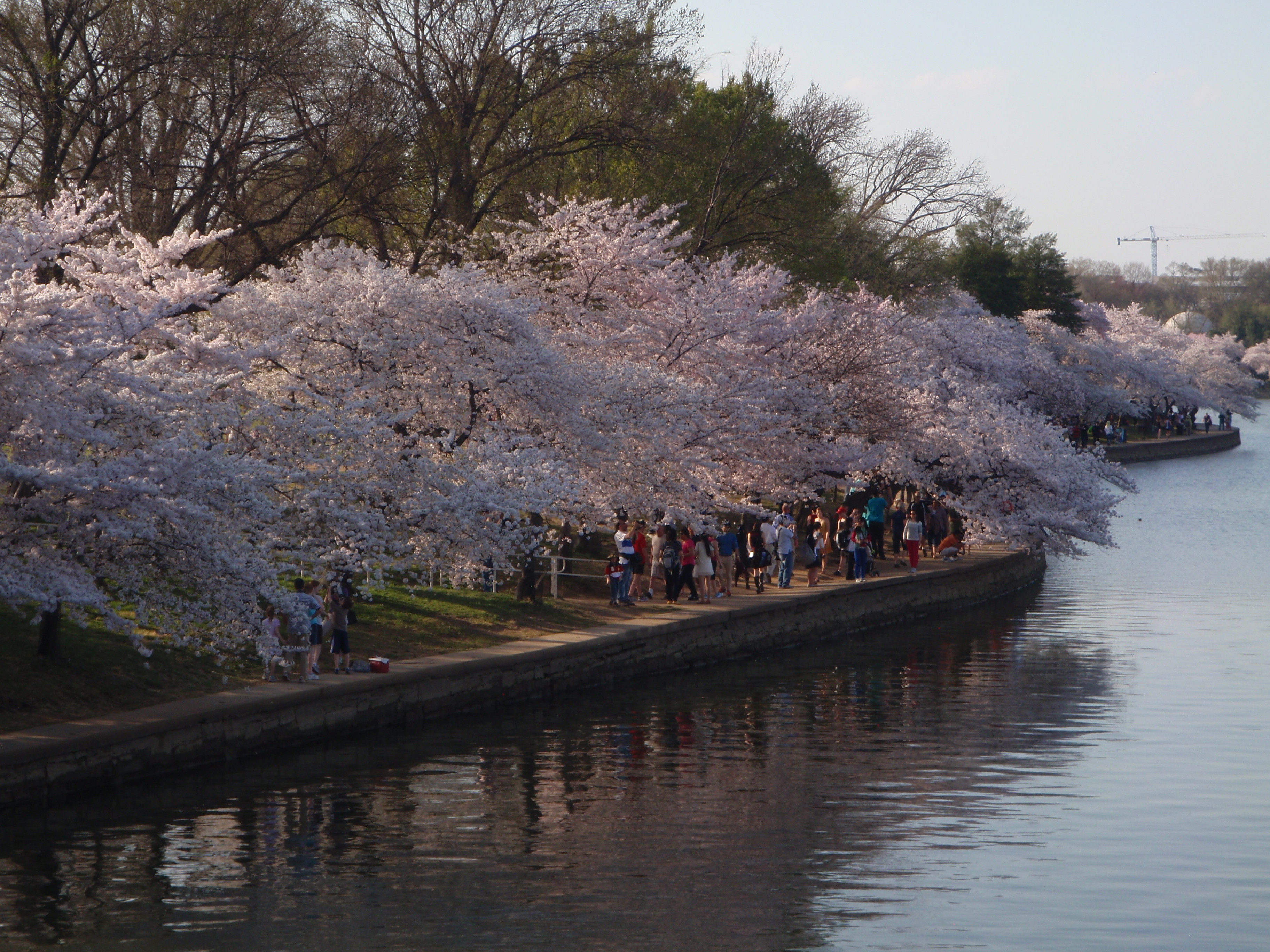 By this time, I wanted to head back into the melee and enjoy a long walk in the cherry blossoms. I was determined to find a parking space along the mall, which had a 3 hour limit until evening, and then no limit. I didn’t want to be worried about time. I had to circle around for a long time (intersections take forever with all the pedestrians crossing), and watched as other people found spaces, and finally my patience paid off and I got a spot. It was still a long walk to get to the Tidal Basin, and was still very crowded, but it was truly a spectacular sight with all the trees in full bloom. There was pink everywhere I looked! The cherry blossoms don’t have a strong smell like lilacs or something, but seeing thousands of trees in bloom was really a treat. It took a long time to walk all the way around the basin – lots of people would stop to take photos of themselves by one of the trees, and the strollers and all made it a slow go. But it was such a pleasant evening I don’t think anyone minded. Some people were enjoying picnics under the trees, and the whole thing was a wonderful springtime picture. Even the news trucks were out getting some footage for their broadcasts. When I was by the Korean Monument a couple days later, I read that the cherry trees were a gift from Korea in gratitude for the Americans coming to their defense during the Korean War in the 1950s, and I don’t know if that meant all of the trees (the cherry trees seem to have Asian scientific names) or the ones by that particular monument, but it was a nice gesture no matter what. There were a lot of Asian tourists here too – it made me think back to my time on Guam. The scene was especially pretty on the far side of the tidal basin with the stately Jefferson Memorial sitting on the grounds in front of all the water and surrounded by pink trees. I can’t imagine he thousands and thousands of photos that people took just this evening – me included! Kodak must have sold a lot of film there back in the day!