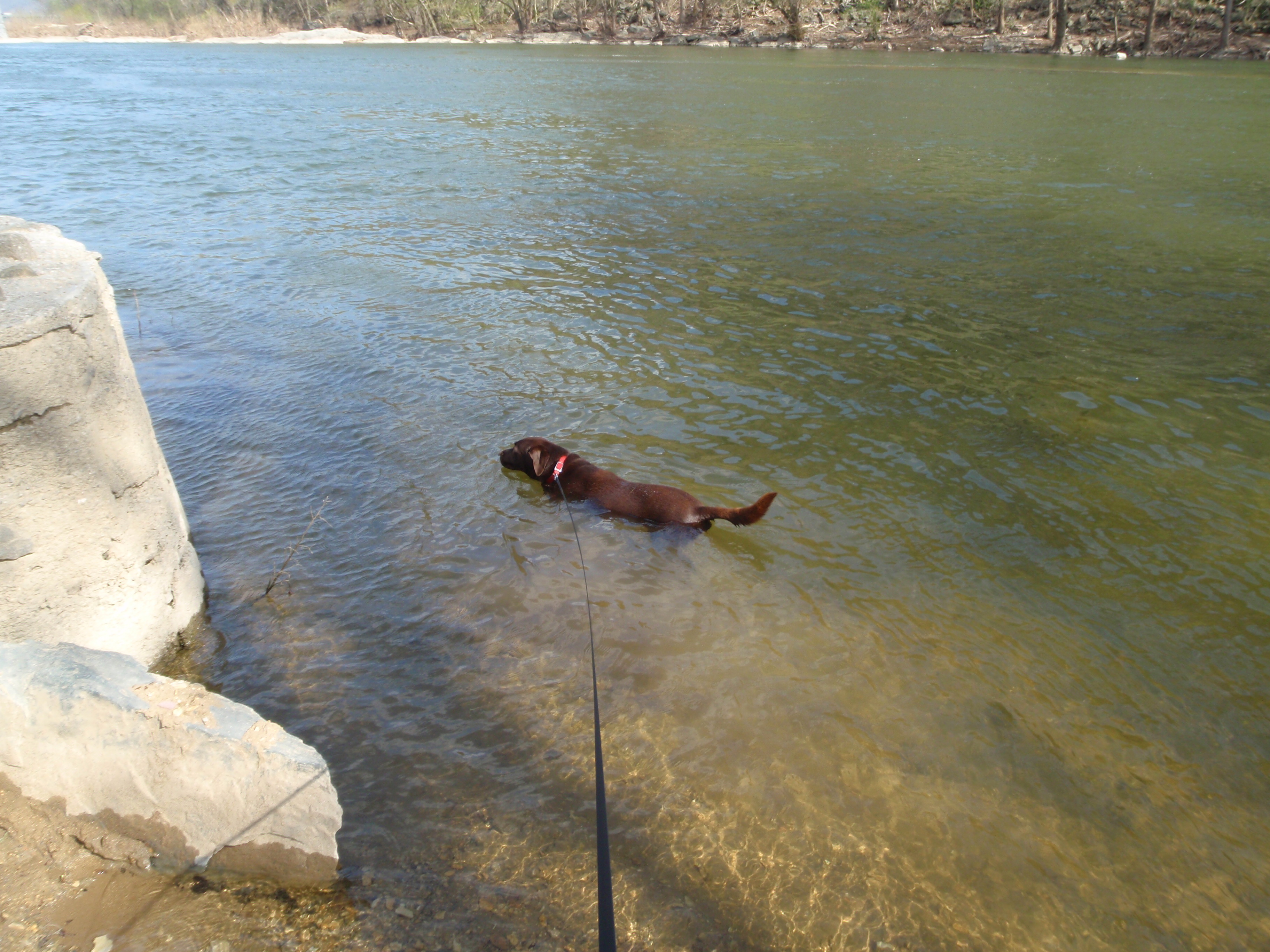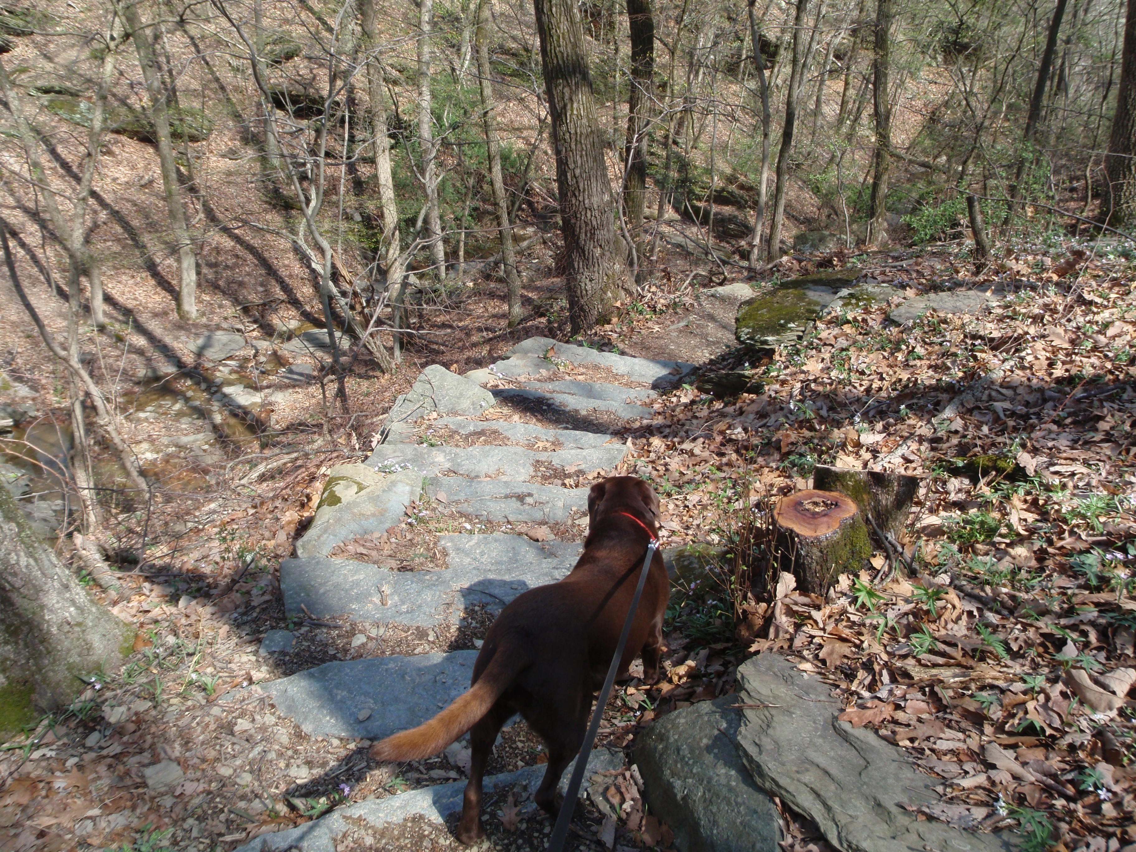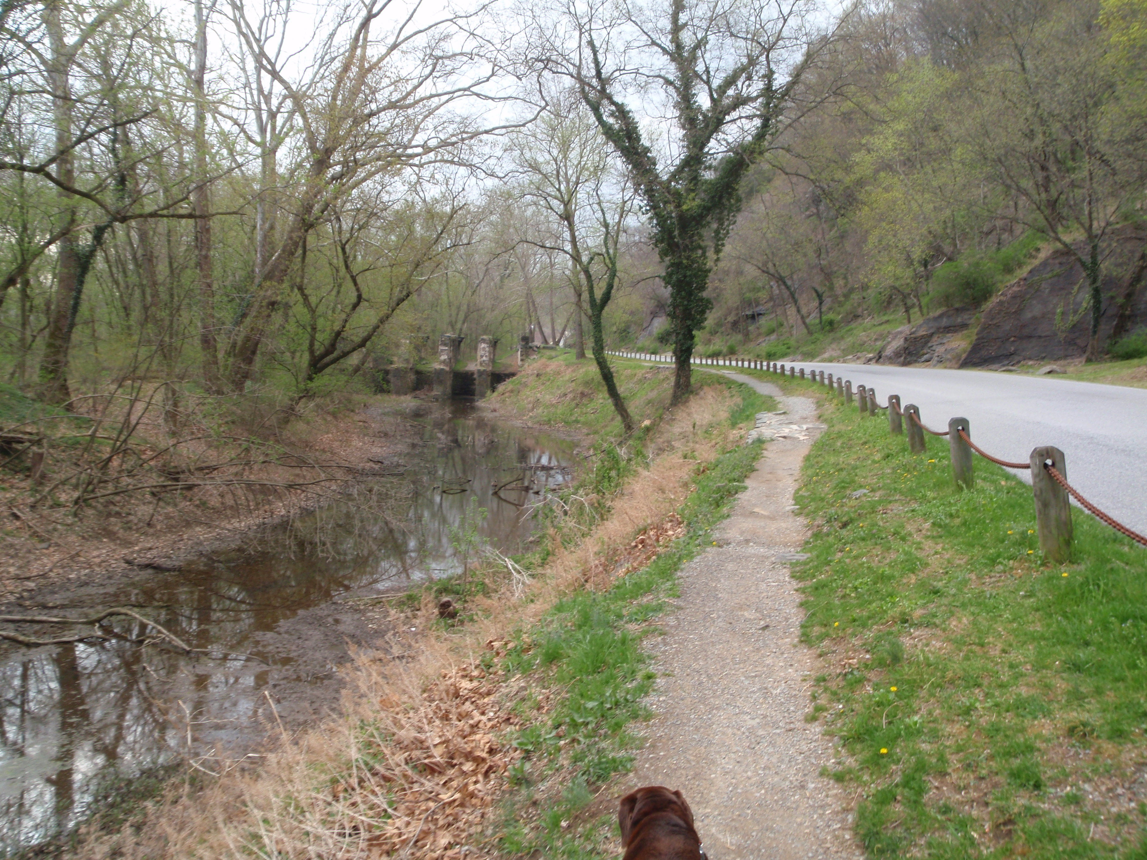 After just a couple miles, we came to the Harpers Ferry National Historic Site, so I stopped by to see what all was there. Harpers Ferry is located at the junction of the Potomac and Shenandoah Rivers, and played a big part in the Civil War. Tula and I started off with a 2 1/4 mile walk back to the site of one of the major battlefields. Then I decided we would walk down to the “lower town” – the national park provides a frequent shuttle bus back and forth since it’s a mile and a half away with a 300 foot drop, but there was also a trail for those who wanted to walk. And Tula seemed to be more her usual self, so we set off for the lower town, which was sort of a step back in time with wonderful old historic buildings. With 2 rivers and lots of current, this town operated cotton mills and pulp mills back in the 1800s, and several foundations were still there. But, there were also numerous bad floods due to the town’s location right on the banks of 2 rivers, and eventually the town was abandoned. Now there are gift shops, a small museum, restaurants and ice cream places. Tula and I walked up and down the main streets, and walked out by the Shenandoah River where she took a short swim, and crossed a bridge to an island and walked around that. Then we began the walk back. By the time we returned, we had covered all 8 miles for the day, counting our walk out to the battlefield.