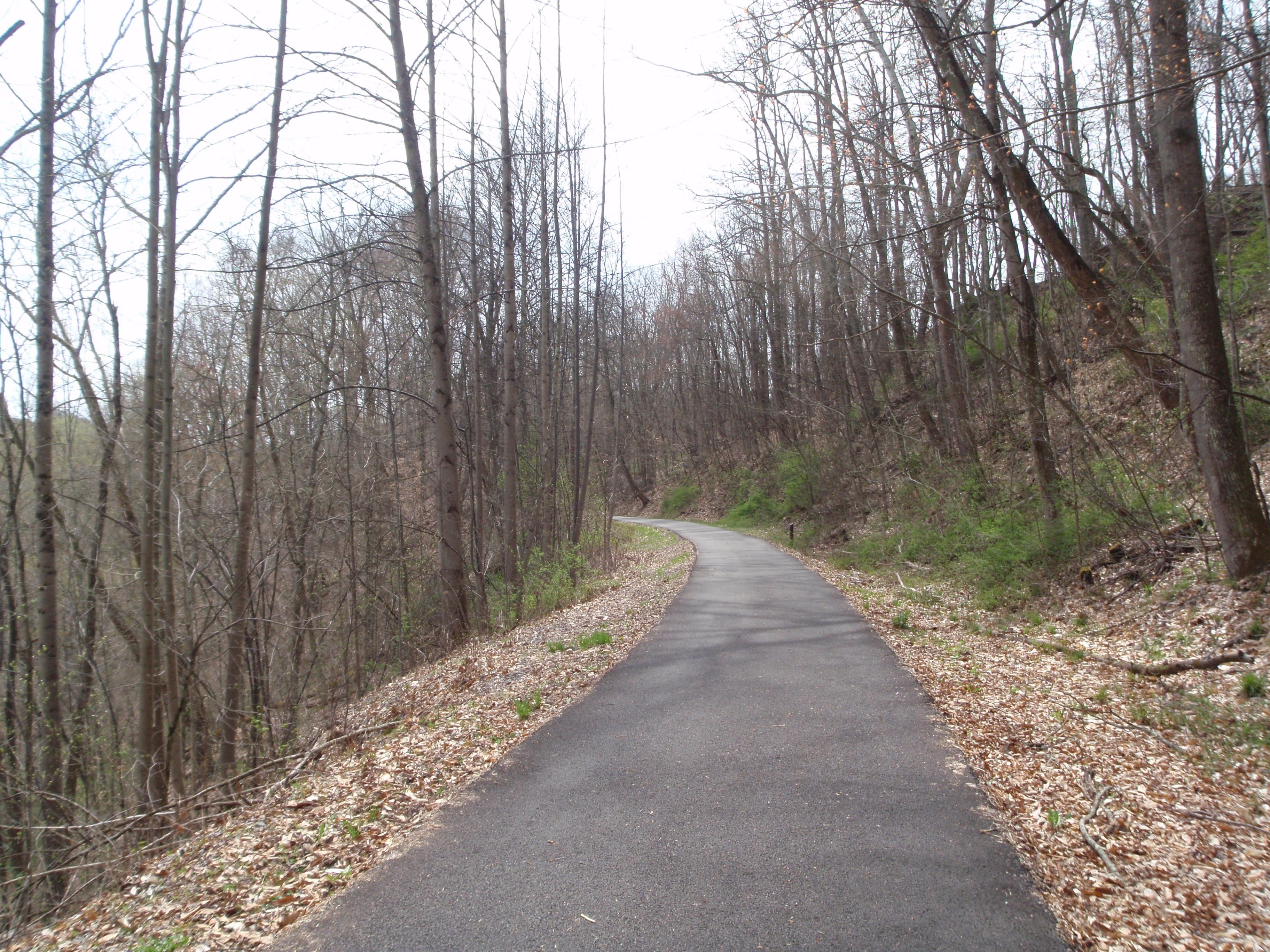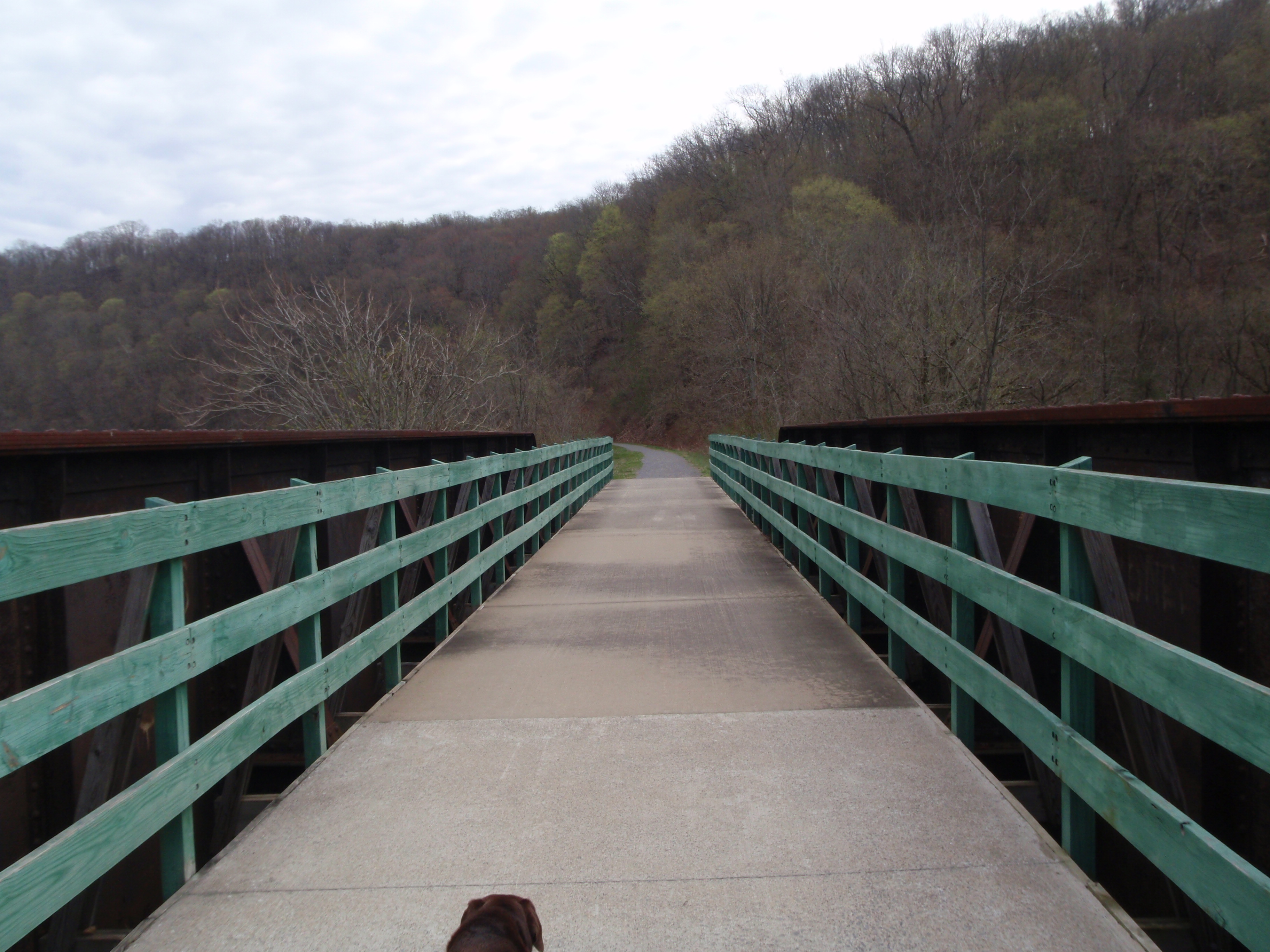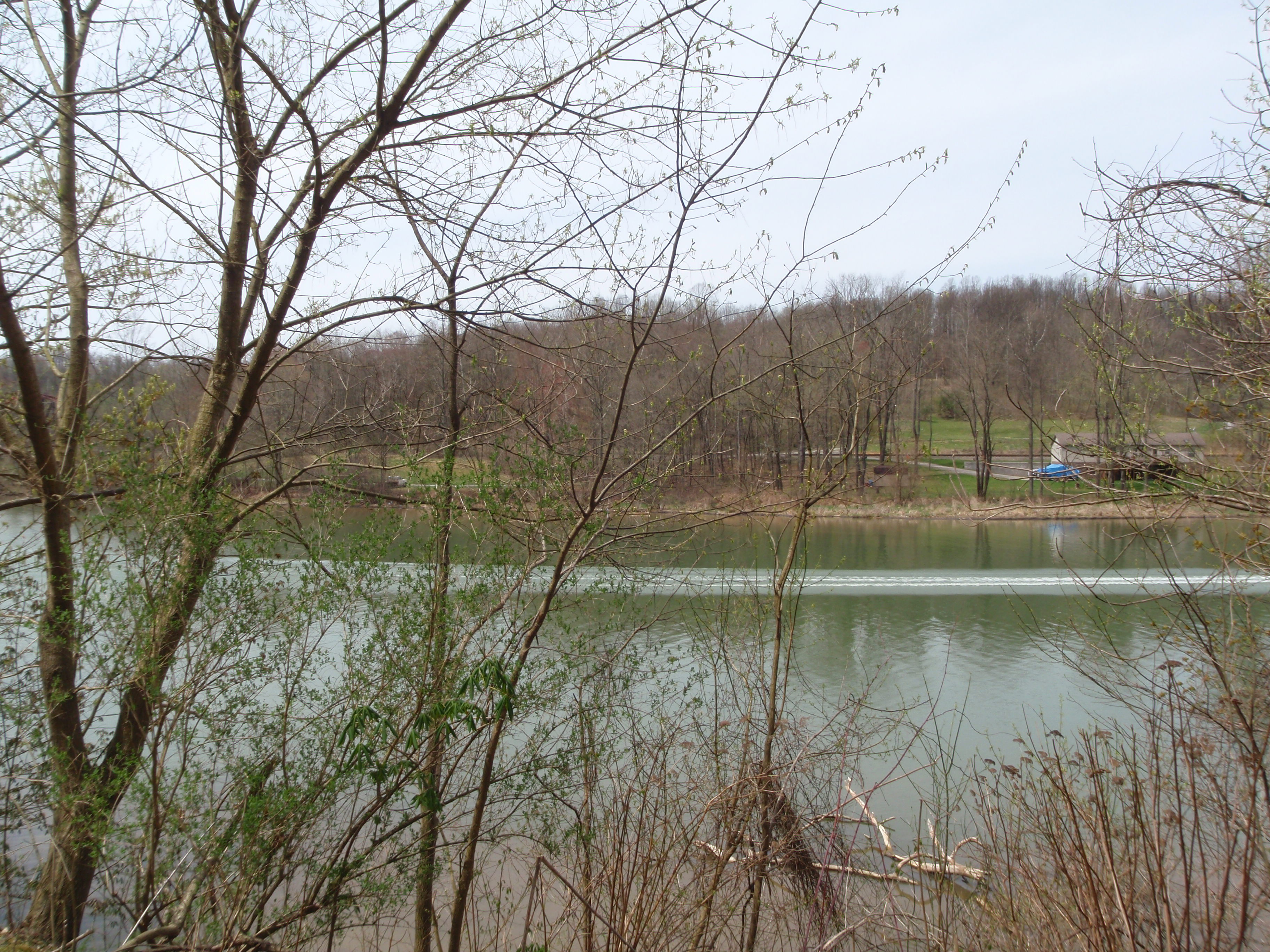 This part of West Virginia is also very hilly and rugged – it had to have been tough land to settle back in the 1700s and 1800s. I found Pricketts Fort State Park, and the first thing that caught my eye was a replica of the fort that was built here in 1774 as a place for settlers to come during Indian attacks. It wasn’t open inside since it’s still early in the season. After checking things out, I discovered there’s both a river trail and a rail trail, and both were tempting, and I didn’t know which one to start on! I got Tula out of the car, and then noticed someone else with a dog had just set off on the rail trail, and I didn’t want to be following them, so I headed for the river trail, and it was absolutely beautiful. The river we followed is the Monongahela River, which means “river with the crumbling or falling banks.” Locals simply call it The Mon. It was a pretty day, and the trail stayed right by the river nearly the whole time. West Virginia had a hard winter, and the faintest of green is now settling over the land on all the trees and bushes as the buds begin to pop out – spring really is here! There were a lot of people out on small boats fishing along the banks, and a few high speed boats zipping along the middle of the river – seeming to barely skim the surface. There were bluffs on the opposite bank, and houses and trailers scattered here and there along my side. Some of the trailers had things like a little deck or a better foundation or stairs added for a sense of permanency, and I have seen a lot of people living in trailers in West Virginia. But these people all had the big outdoors and the river right outside their door, and that no doubt is a big draw!