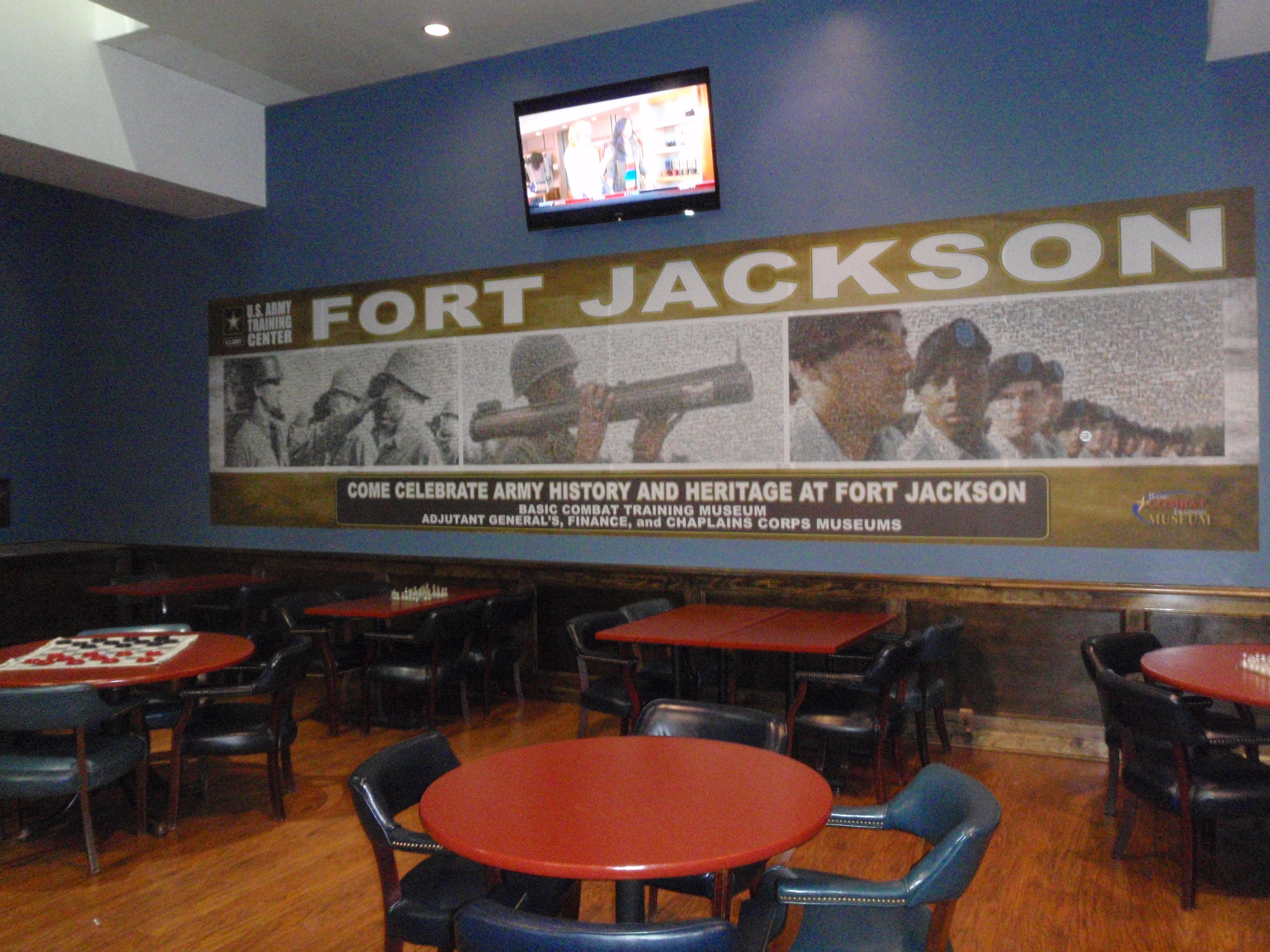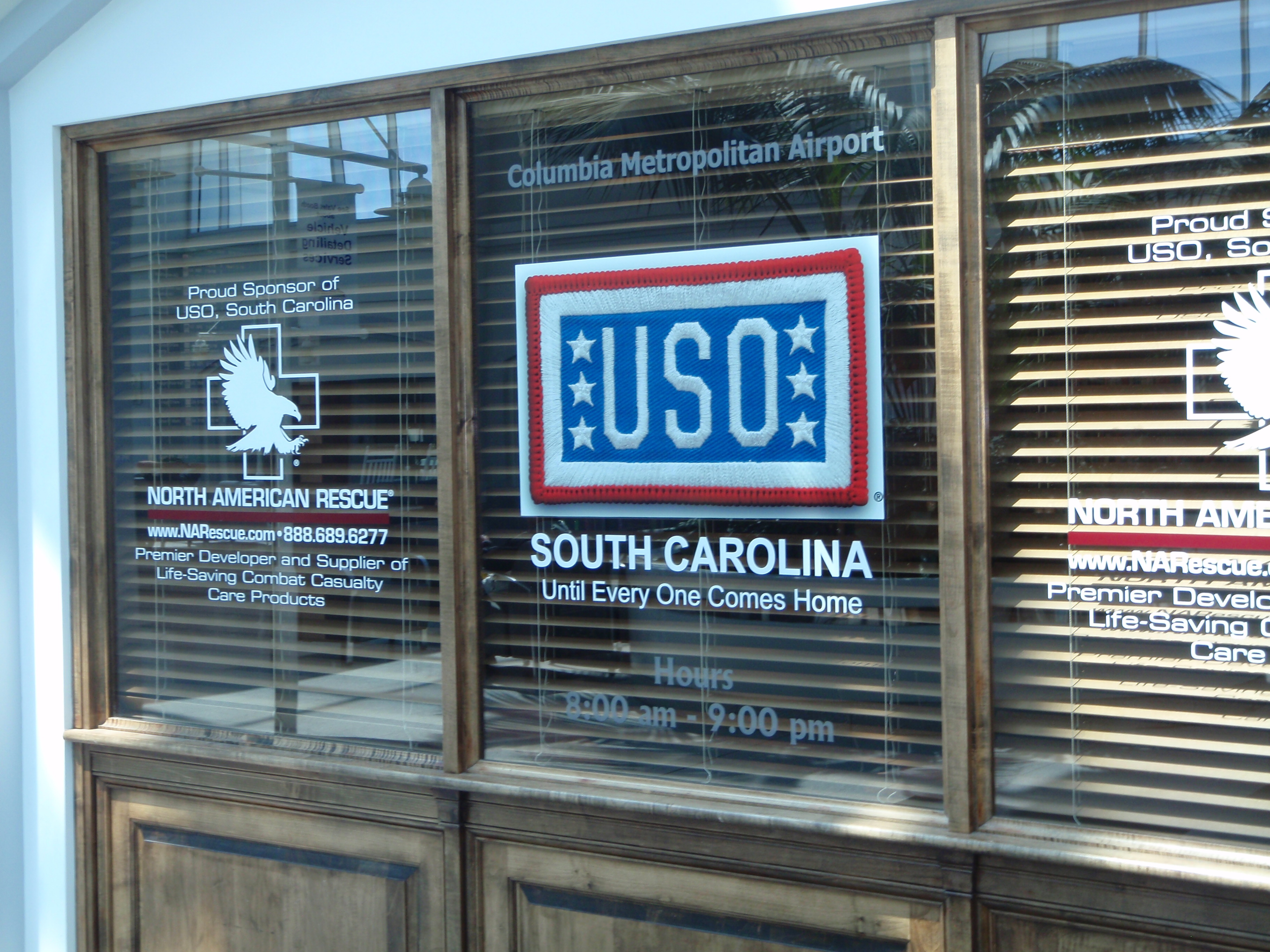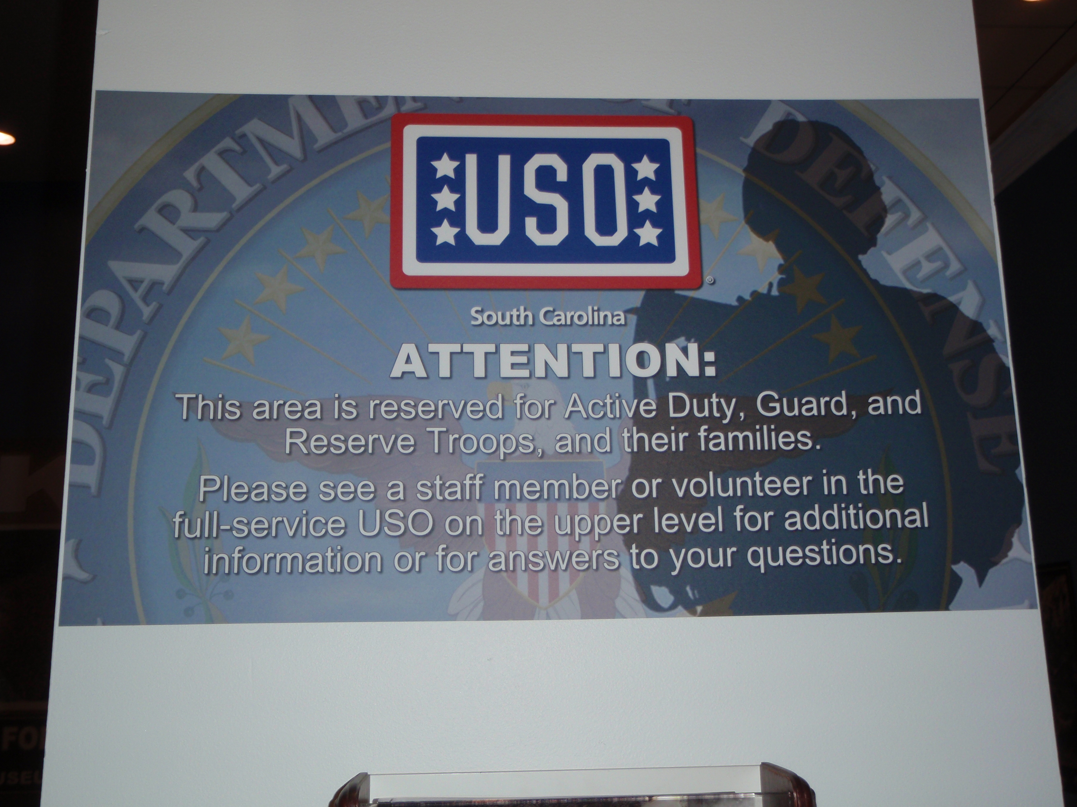 I stayed near Columbia last night because I had read that South Carolina’s USO is located in the Columbia airport, and since they’re usually open on weekends, I figured it would be a good place for my Sunday donation. So I drove to the airport, expecting a big bustling one since Columbia is the capital of the state. But it was actually very quiet, although when I drove around I didn’t see any signs at all about a USO. I drove around by both the departure and arrival areas, and began to wonder if I had mis-read something. So on the next pass, I saw a lady who seemed to be monitoring some curb-side parking, and I asked her about it. She not only told me the USO was indeed right inside the door, but she let me park in a place people can’t usually park since I was making a donation. I went in and met the volunteer who was working (she drives down from Charlotte, NC to volunteer!) and it’s a very nice place. It’s all wood-paneled (courtesy of Lowe’s) and is a very inviting place for all the military troops who come through. The volunteer also took me downstairs to the “overflow” room – sometimes they are very crowded. There was only one person in the place this morning, but the airport is close to Fort Jackson, which is one of the biggest army training areas in the country, and every summer the USO experiences “summer surge” when 9,000 new recruits come through to begin basic training. The volunteer said it’s pretty exciting when the place is bustling with new recruits! So it was fun to see all of that, and my donation will help get supplies for the summer surge.