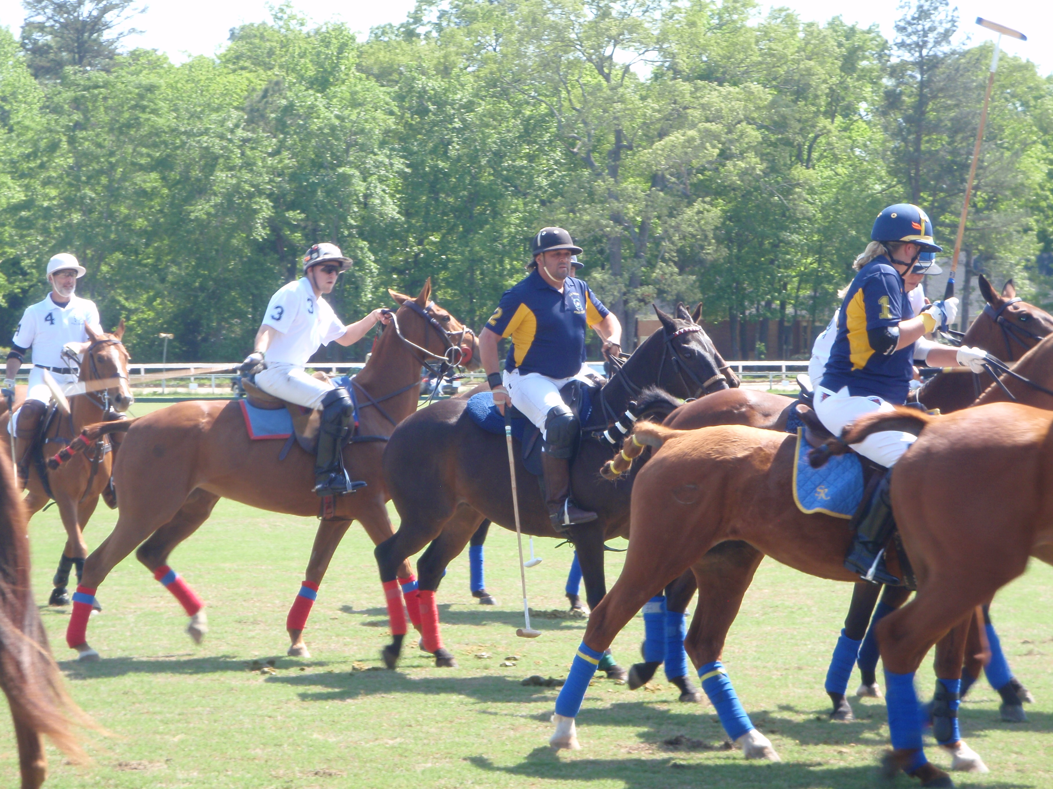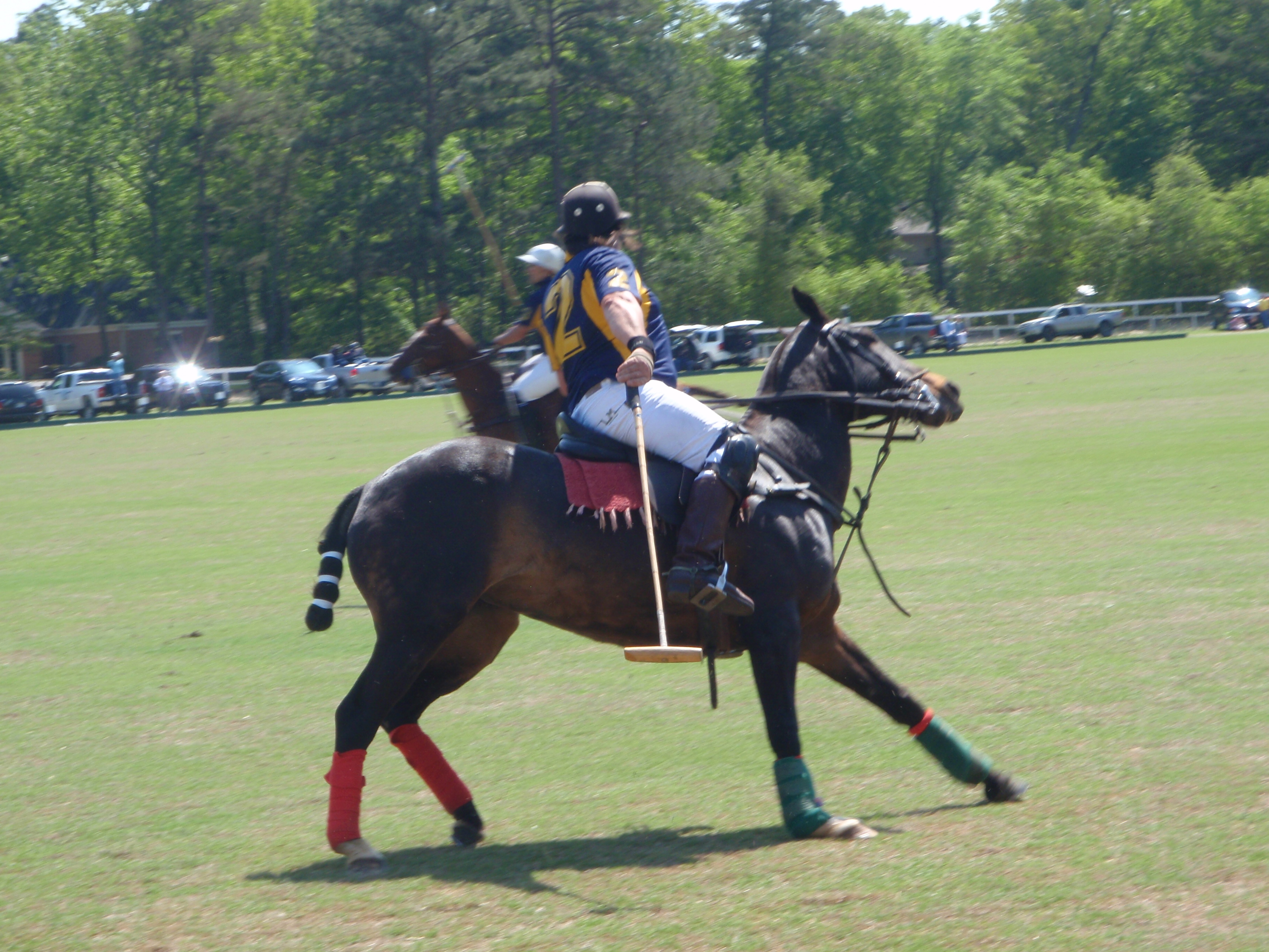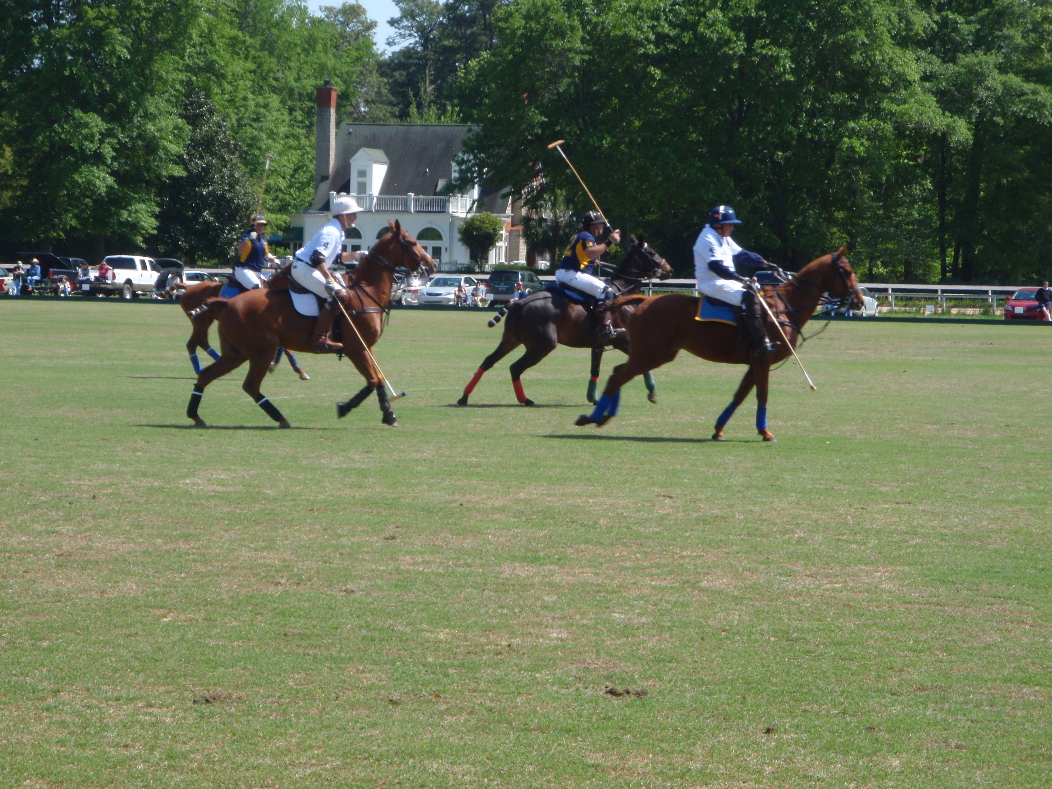 I had stopped in Aiken in 2011 when South Carolina was my annual “state-of-the-year” trip, and I knew I wanted to come back and walk some more here. The horsey part of town is truly a horse paradise. The roads are soft red dirt for riding (almost completely shaded by big trees) and there are countless horse barns, 2 polo fields, and a jumping arena. One of the polo fields had a sign out that there would be a polo match at 3:00 this afternoon. I found a place to park and Tula and I did some more walking on the red dirt roads until it was time for the polo match, which I wanted to watch. I found another cool shady place to park, and went in to see what polo was all about. Many attendees are regulars and they reserve places to park right along the polo field, and they back in and tailgate. The announcer said this is the oldest continuously-played-on polo field in the country, and they started back in 1882. Since I had just walked in, I found a good place to stand where no one had parked right near the center of the field, and enjoyed watching the first half. There are 4 people on each polo team, plus a referee, so there’s 9 horses dashing around the field, and the thundering hooves kind of echo. The mallets must be about 4 feet long, and they’re sometimes swung in circles, and sometimes swung outward from the horse, so in addition to all the running horses, you have swinging mallets (and they hit that ball hard!), and it’s simply hard to believe that horses and people aren’t hit with a mallet! I would think a good thwack from a mallet could break a horse’s leg, but they’re all protectively wrapped, and their tails are wrapped too, so they don’t get tangled up in any of the action. There were 3 chukkers in the period, and each chukker was 7 minutes long, and a horn blows to signify the end of a chukker. The ball has its own “right-of-way” and there seem to be lots of rules to remember. The players and horses could get a few moments of rest during the frequent fouls, which often seemed to have something to do with the ball’s right-of-way. At the end of a chukker, everyone goes and gets a fresh horse, so I’m sure there’s a great deal of strategy involved figuring out when to use each horse, when each player needs 6 of them during the match – one horse isn’t sufficient; a polo player needs a whole string of horses! During the halftime break, the spectators were asked to go out onto the playing field to tamp down the divots that the horse’s hooves had dug out of the ground. So I walked out with everyone else and pushed sod back into the little holes. The polo field is really big – I’m not sure what the dimensions are, but certainly bigger than a football field. I’d been standing during the whole first half, which was about 50 minutes, and I was ready to move around a bit, so I got Tula out and we walked some more around the dirt lanes. I thought I’d get back in time for the last chukker, but the second half must have gone faster than the first half, because people were already leaving when I got back. But that was fine – I’d seen what I wanted to see!