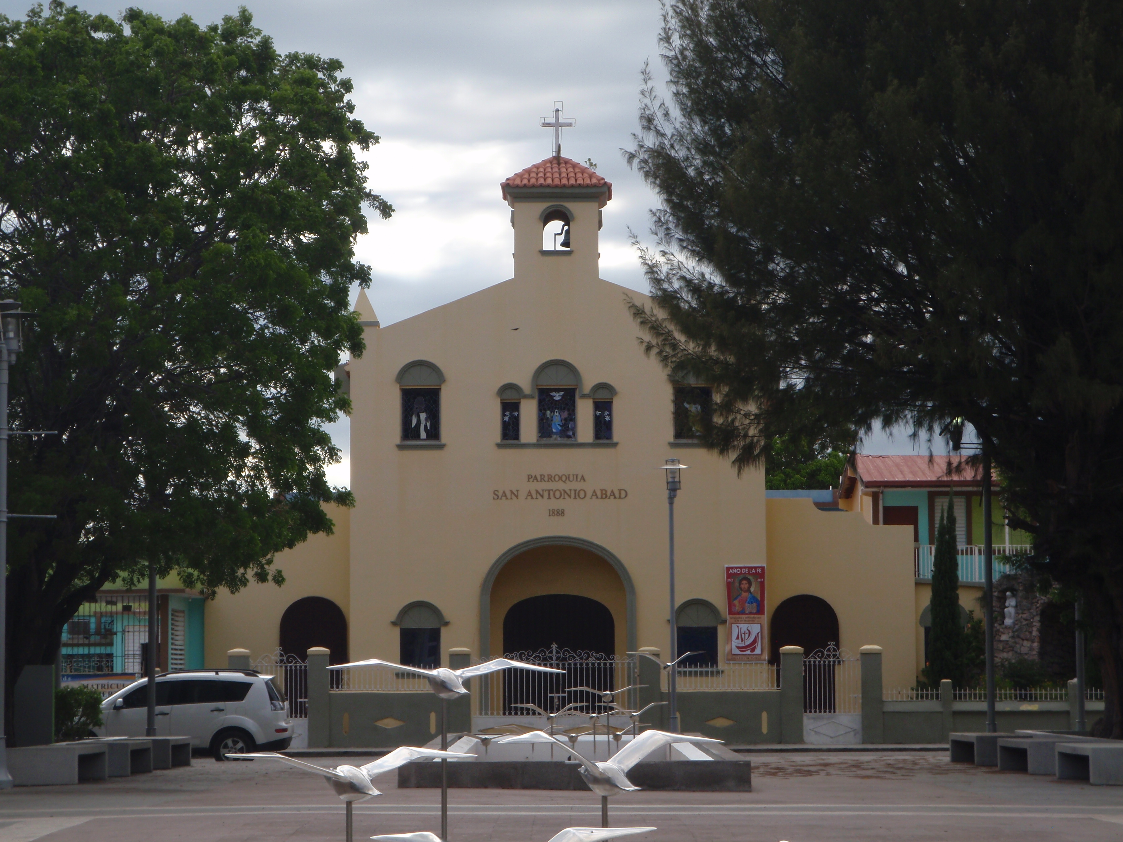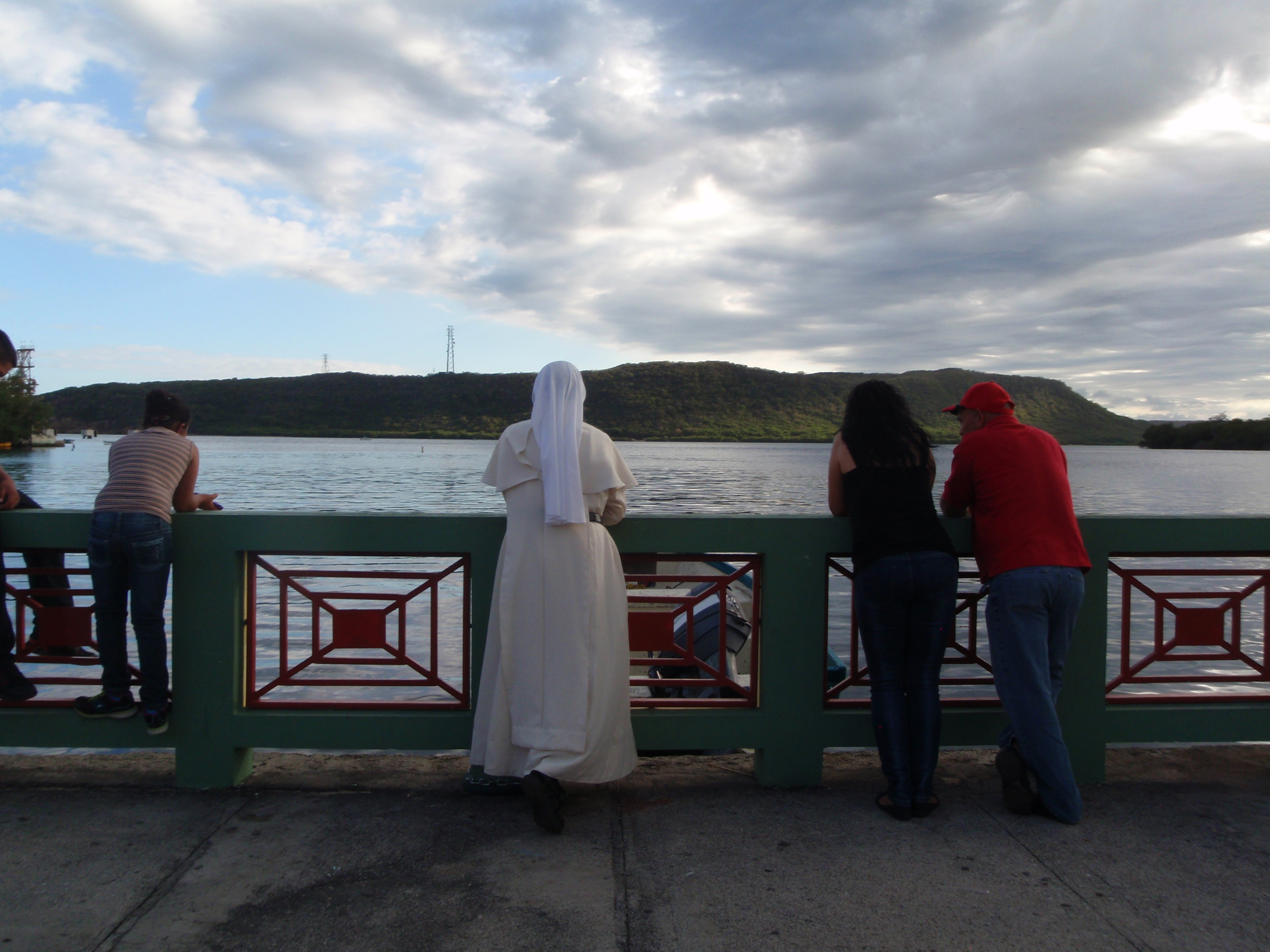 Then I drove into the town of Guanica and walked along the bay and through part of town. The island just offshore is called Gilligan’s Island because it resembles the island from the old TV show. By then it was nearly 5:00, and it looked like people were setting up for some sort of little festival. I asked a couple people if they spoke English, and when I found someone who said she could speak a little, I asked what was going on – if there was a special event or something. She told me that people frequently gather by the bay on Saturdays and Sundays, and there’s often some music, and tonight there seemed to be some religious event going on (I couldn’t understand a word though), and there were big inflatable toys for kids to jump around in, and carts with food and tables of crafts, so when I was done walking (and I did so much today I made up the mile and a half from yesterday, plus 2 extra!), I got some BBQ’d pork on a stick, and corn-on-the-cob, which they cleverly serve with a skewer in one end, and the ear of corn is upright in a plastic cup with melted butter in the bottom, which makes it easy and less-messy to eat while walking around. There was a big banner of Jesus up by the stage, and a priest sitting in the back, and that’s why I thought the talking that was interspersed with the music was religious. There were a couple nuns walking around, and I tried to talk to them to see if this was some sort of fund-raising event for the church, but we could not communicate. Various people in the audience had guitars, and drums and tambourines, and if they felt like joining in the music, they would do so. And there was often a simple circle dance going on that people would randomly join for a while, and then leave. So it was interesting to see all of that even if I didn’t know what it was all about.