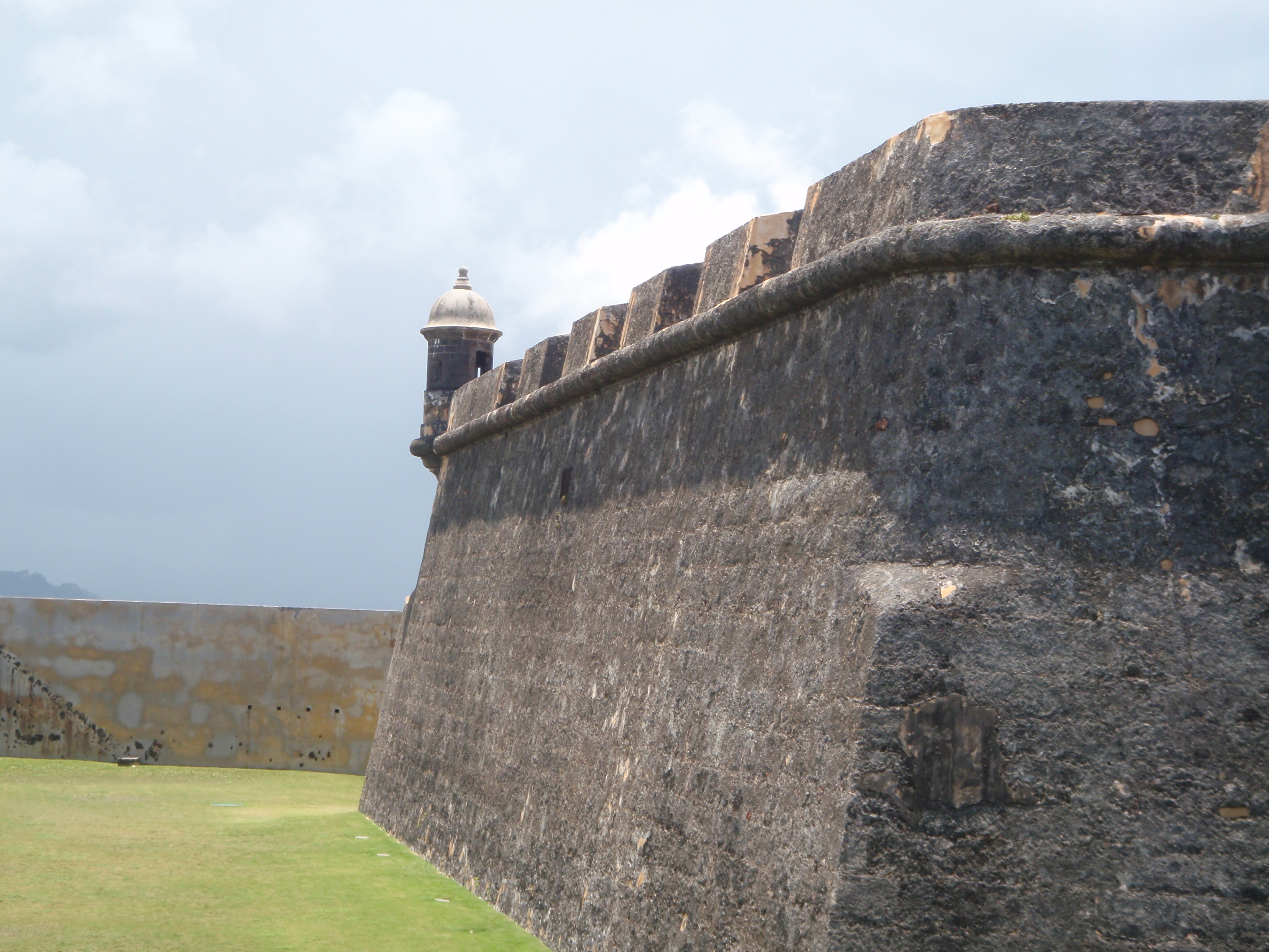 The forts are part of the US National Park system, and I spent quite a bit of time in both of them – I liked El Morro the best. There was a really long sidewalk leading to it and people are usually out flying kites on the grassy park-like area leading to the actual fort. With blue waters and blue sky and green grass all around a monstrous tan/gray fort, it was very colorful and airy and a pretty place to be walking. I walked all around fort – taking ramps or old spiral staircases or other stairs to get up and down on all the levels. The lowest level held the original tower built in the 1500s – to be standing in something that old and historic is really something. The views across the bay and ocean were beautiful, and one can just imagine the hustle-bustle if a very busy harbor. There are lots of picturesque old sentry towers strategically placed around the walls of the fort, and old cannons and cannon balls, and it was all fascinating. I ended up making a donation to El Morro in honor of some of the oldest history of the Americas.