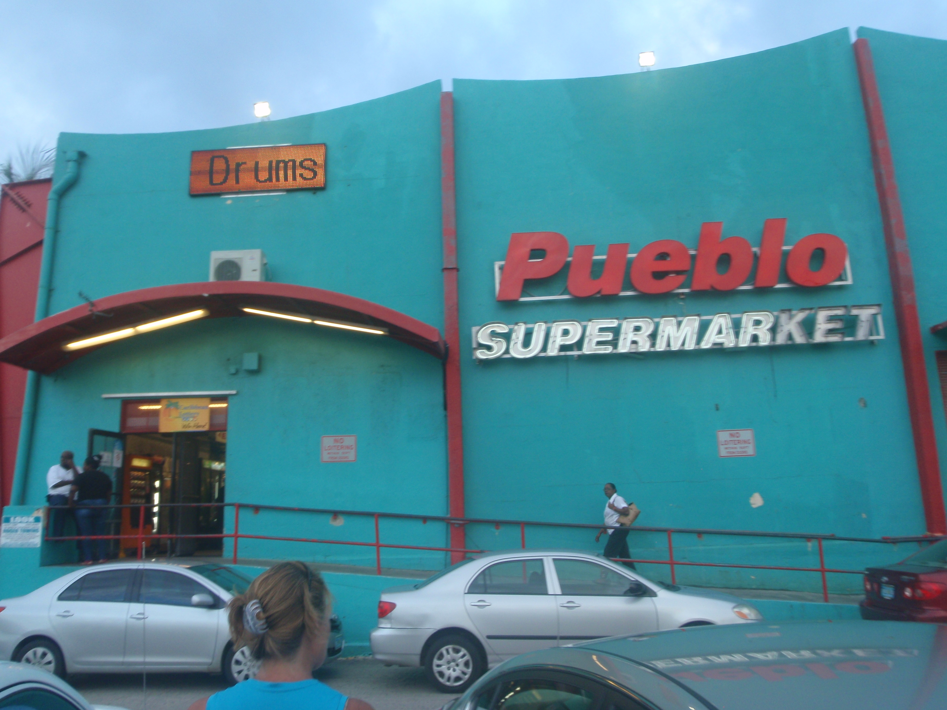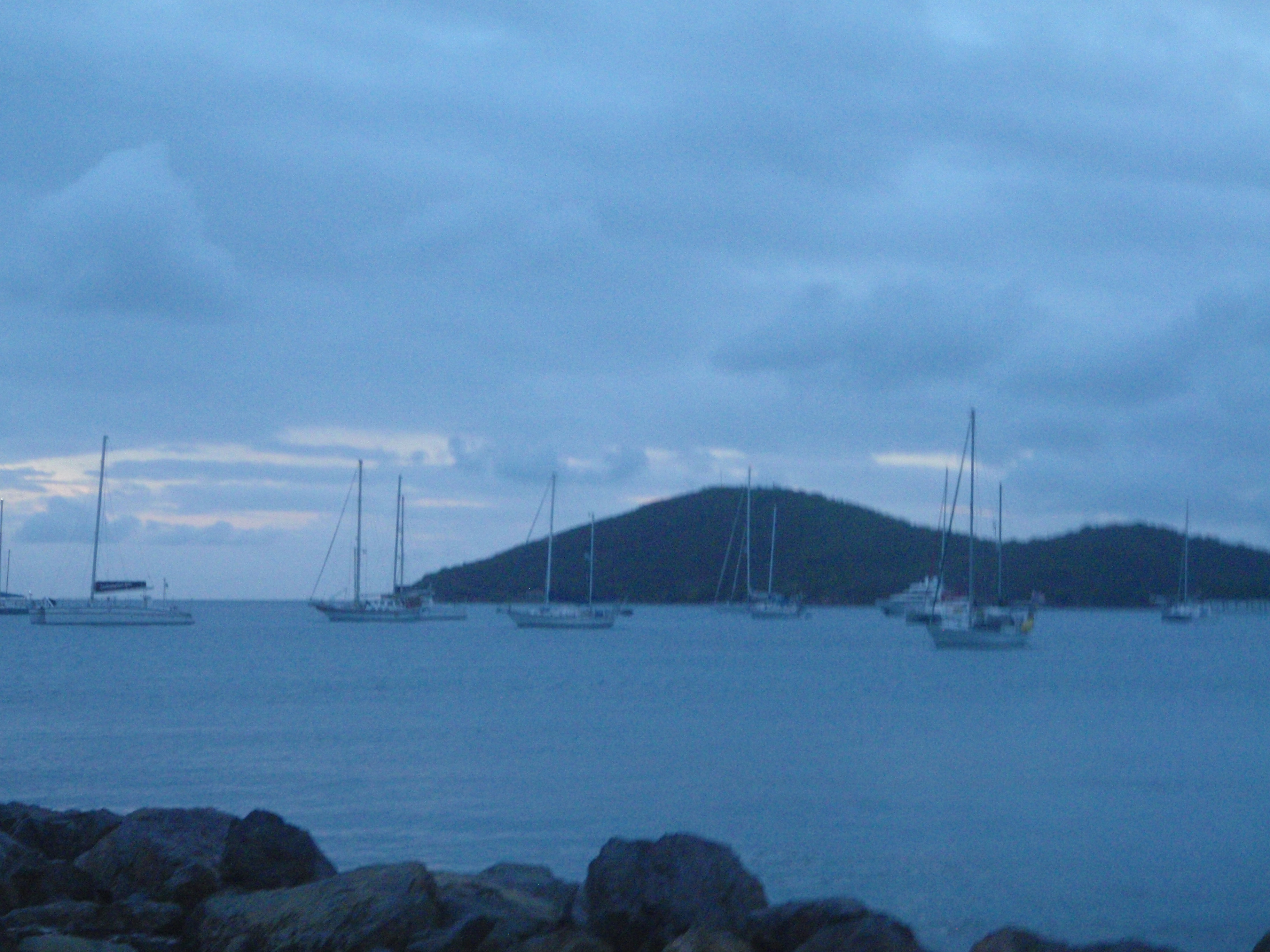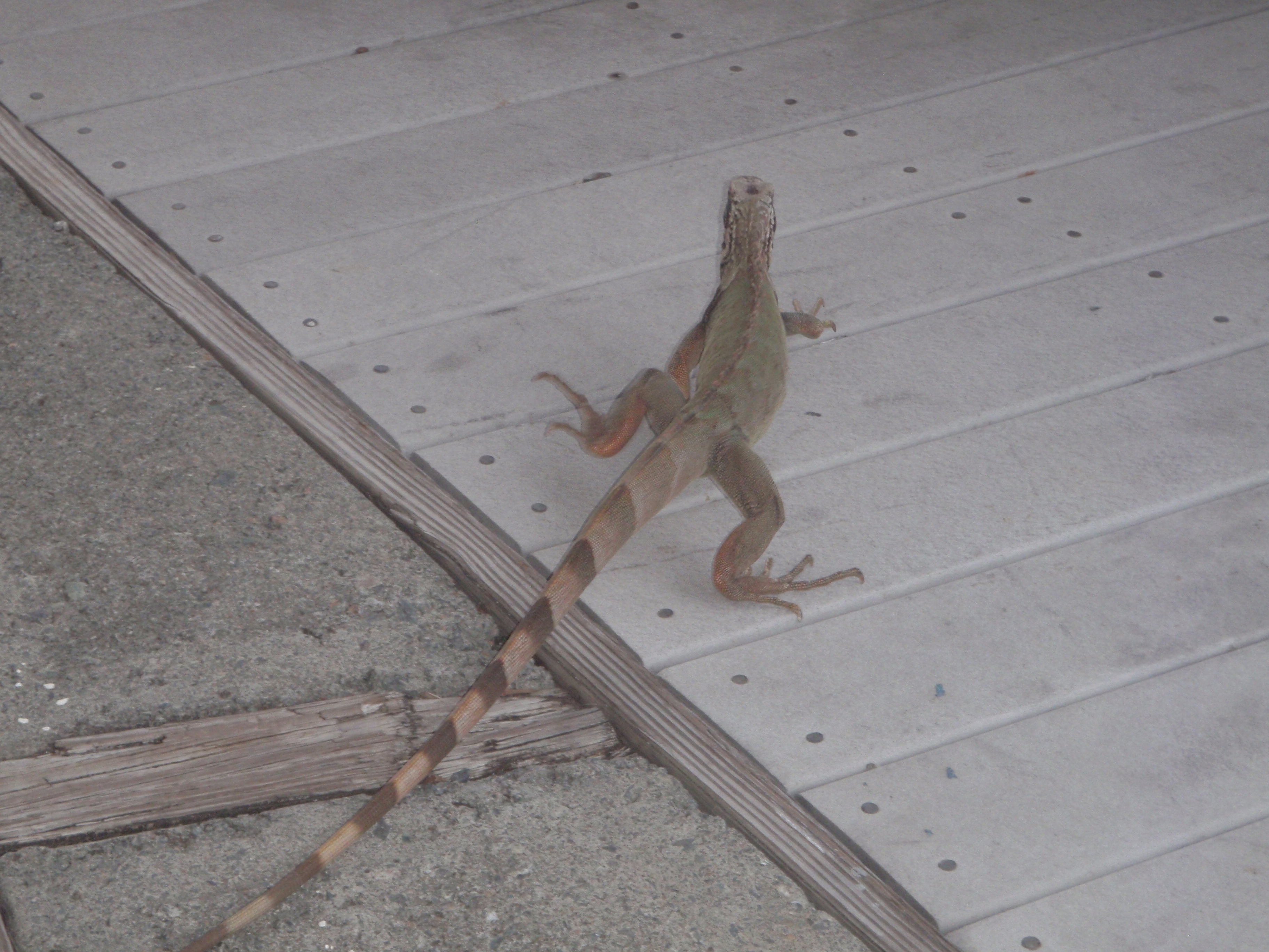 We headed back to Charlotte Amalie, and browsed through the blue-covered tourist tents again, and a couple other stores – Christy was on a quest to find Bob Marley t-shirts for a couple of her boys, and hit the jackpot at the last store. We walked back to the Catholic Charities place to get some pictures since my camera hadn’t been working that day, and ran into Mick the director again. So we chatted a bit more – he had liked my story and had told his wife, who is a free-lance writer, and she wrote about it in the on-line newspaper for St. Thomas and St. Croix. Then we continued our walking some more by the ocean, and went back to the marina to look at all the boats again. There are iguanas all over the place, and only once were we startled by one – the tail sort of looks like a snake. We walked all the way down to the Pueblo supermarket, where Chris bought some cat food for the resort cats. As we walked several miles back to the car, I was once again struck by her walking in flip-flops (wearing the broken ones again!) and we thought how the store employees would think she’s crazy for buying cat food and walking for miles with it, especially since there were lots of taxis waiting for people at the market – everyone assumed we needed a ride since we were on foot!