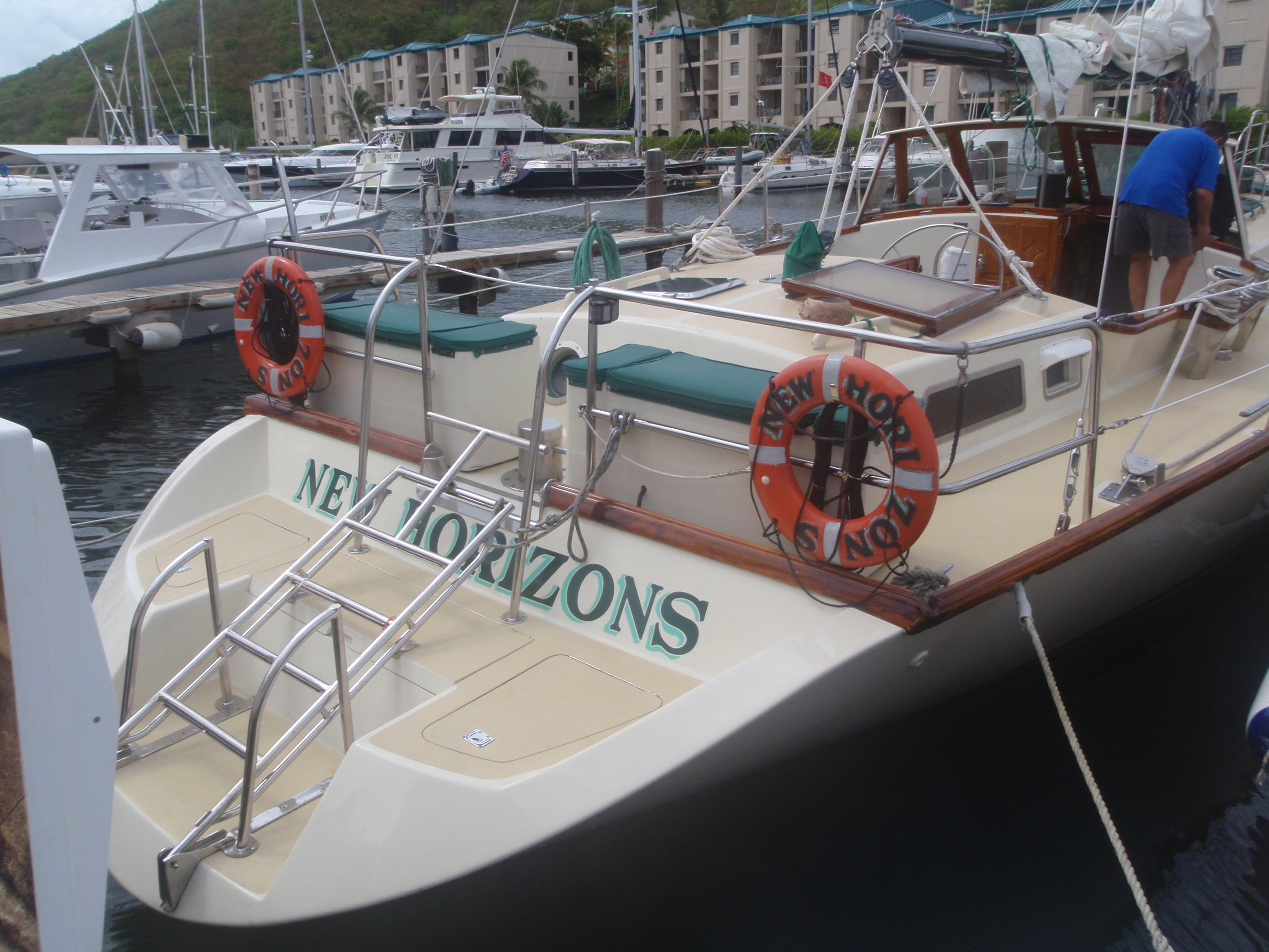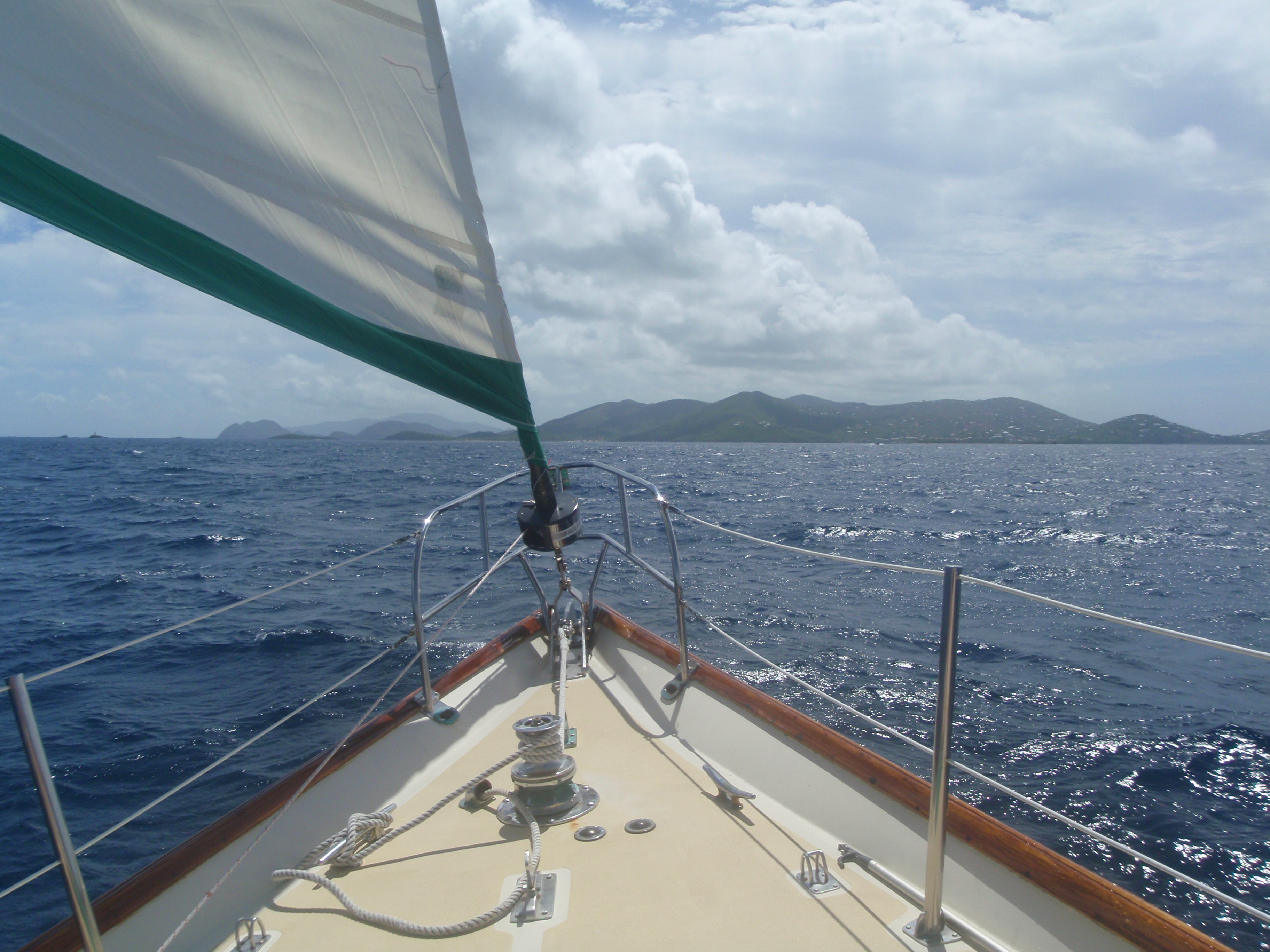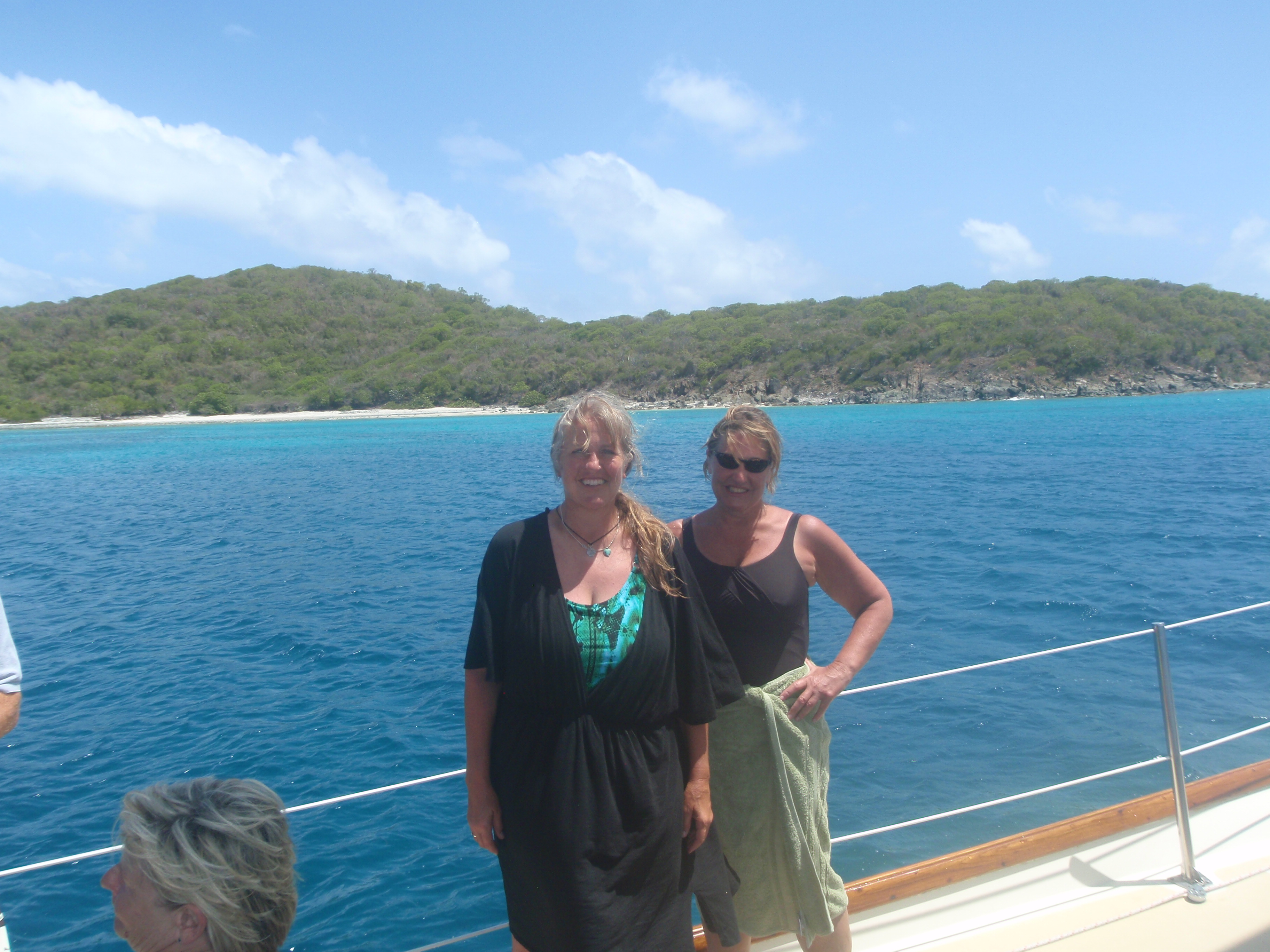 Then we drove over to Red Hook again, and to my surprise, my camera started working again. We ran across a Kitten Kabana in the parking lot, and Chris fed those cats too – yes, she had cans of cat food in the car! Our sailboat was called New Horizons, and Chris guessed it was about a 50 footer. There were 20-25 people on it for today, and although the boat used a motor to get out of the harbor, she hoisted her sails when we were on the open ocean, and we sailed for about an hour over to a cove off St. John Island. The day couldn’t have been prettier – a lovely way to end our stay in the Virgin Islands. Chris and I were up near the bow enjoying the breeze and the sails, and they brought everyone juice and muffins and started passing out snorkeling gear.