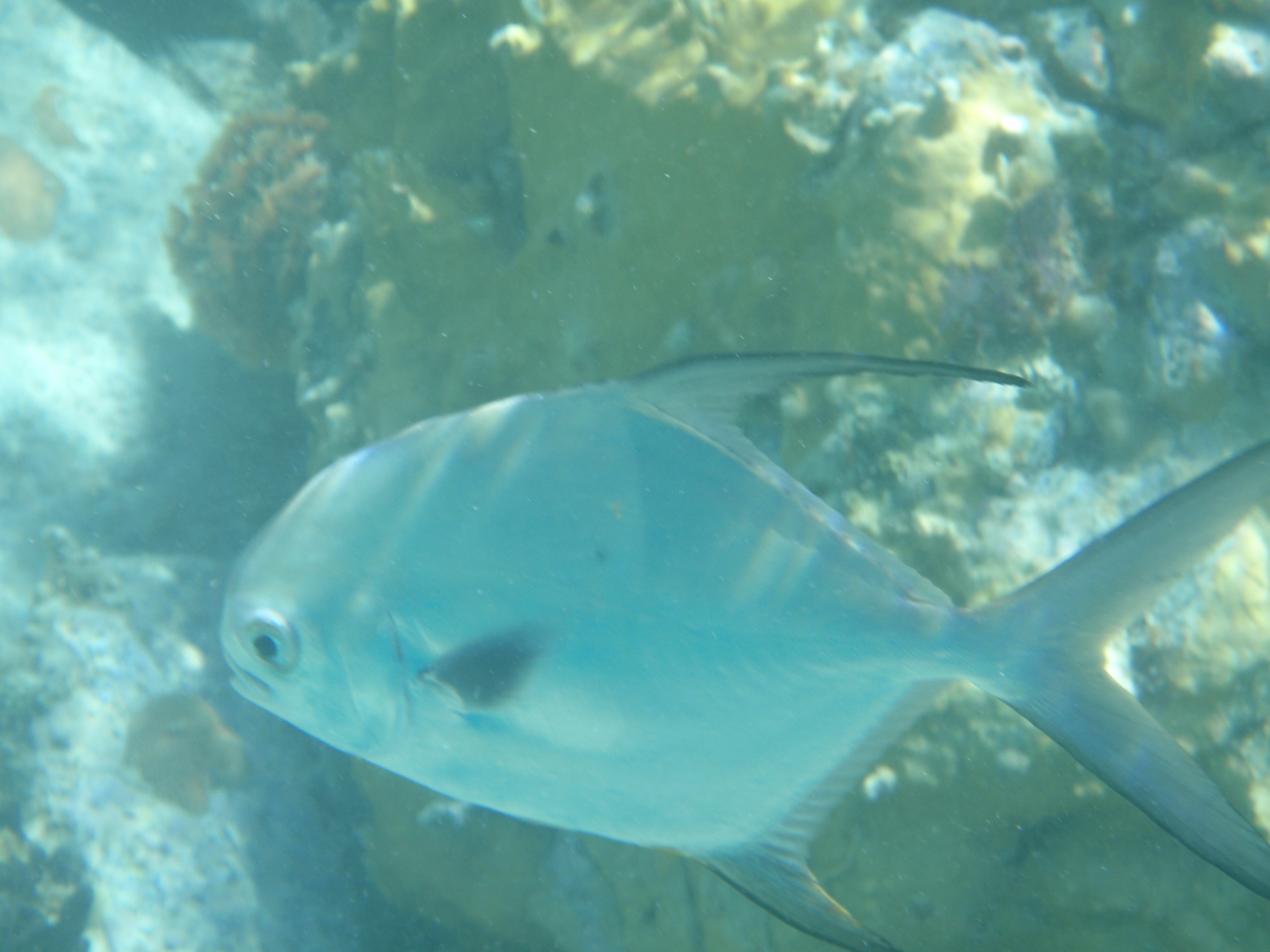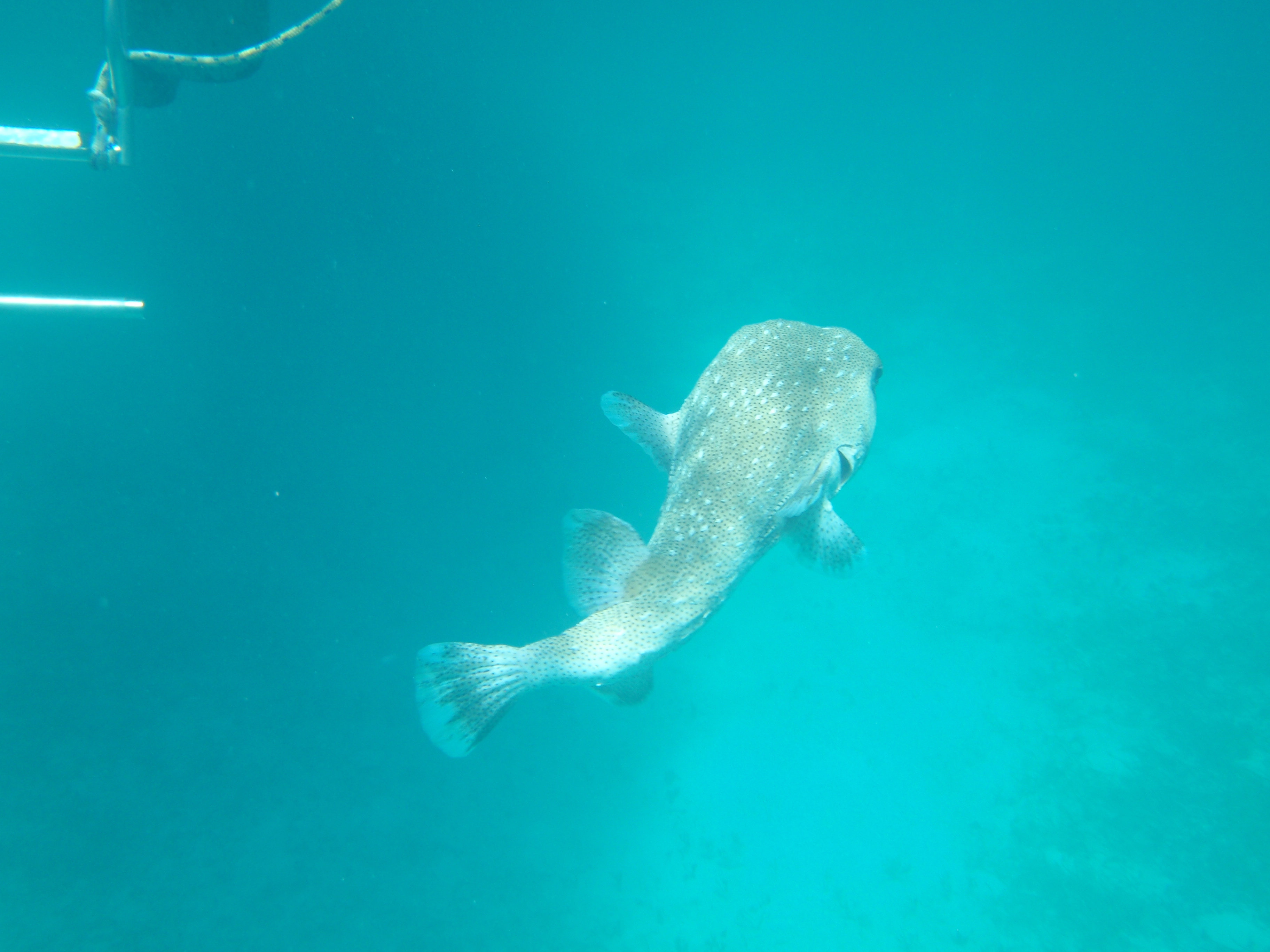 The time went fast and we made our way back to the boat where they had a big lunch set up – big meatballs in tomato sauce covered with tons of cheese, pasta salad, green bean salad, sliced fruit and veggies and brownies. The sun was really really hot on the water, and people either stayed under the awning or kept covered up with towels and all. When lunch was over, one sail was raised (the other couldn’t be because of the awning) and we sailed over to another beach area. As we were getting close to where they were going to anchor, we began to see lots of stingrays flapping their way along the bottom. The water is so clear we could see down a long ways. As we anchored, a big puffer fish appeared, and there was another barracuda hovering around. They actually anchored a little too close to another yacht, so we lost some snorkeling time as they re-anchored. But we got in the water as fast as we could, and I took my camera with me this time, and headed over to the rocks to see the fish. I didn’t see any sting rays once I was actually in the water, but I got good close-up looks at the puffer fish and some other weird looking fish and the barracuda, who had fierce-looking teeth! It seemed like we had no sooner gotten in the water than they were calling us in – the time just goes so fast! There’s a whole new world to see under the water!