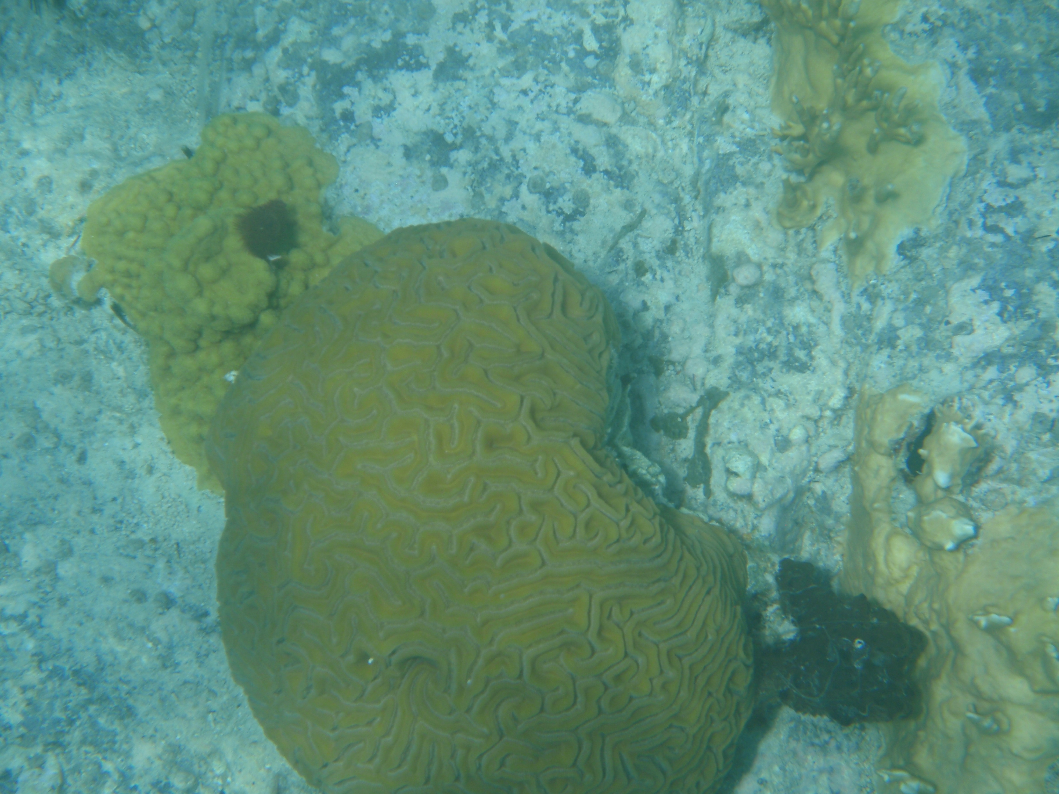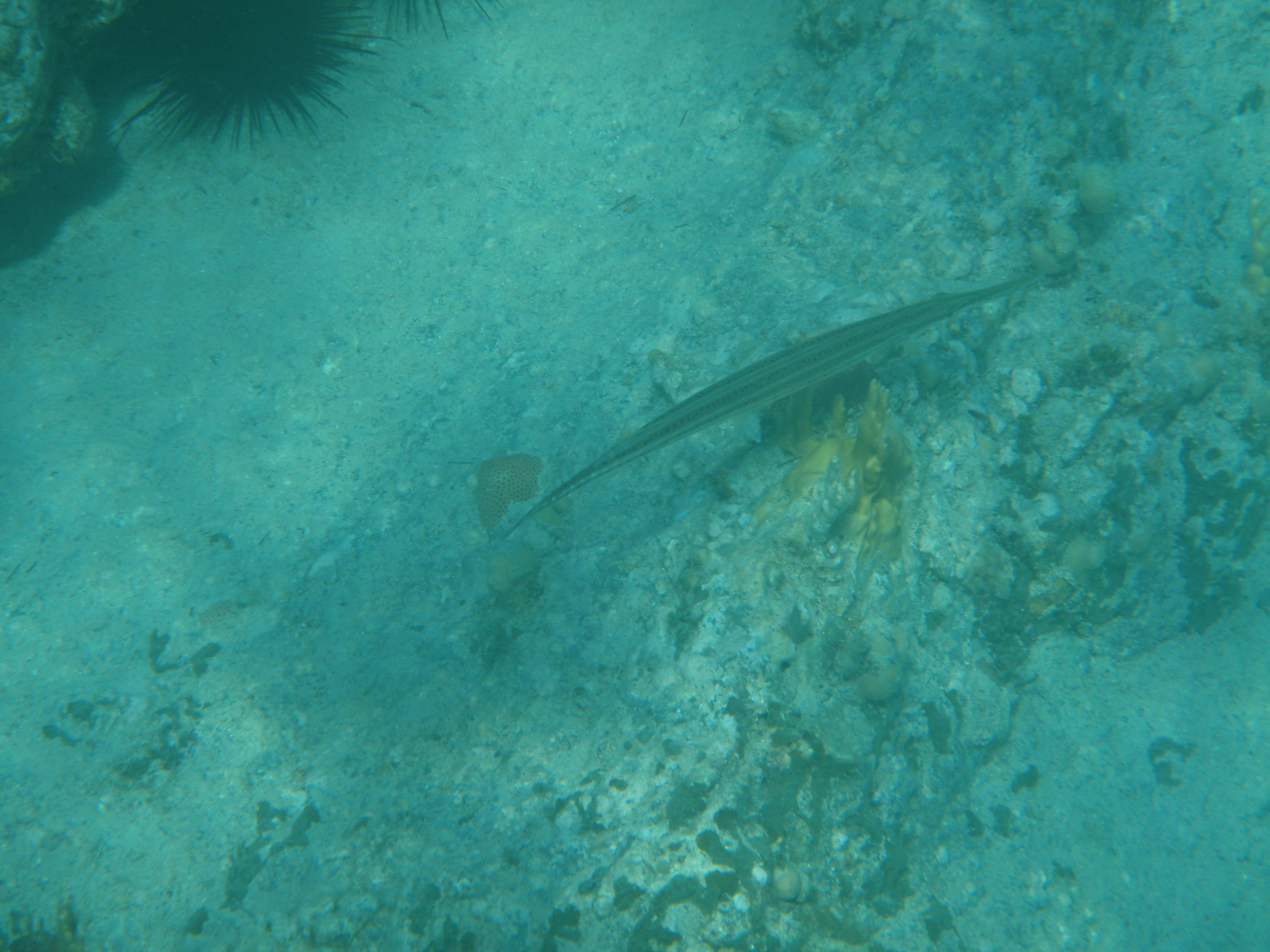 Our first stop was at Honeymoon Beach (and there was a couple on their honeymoon on board), and most of us got in the water quickly – we had an hour to swim around there. We hadn’t been in the water more than 5 minutes when Chris already spotted a nurse shark (the captain said they were around and that they were harmless) and a barracuda. We followed the nurse shark for a bit – it was swimming near the bottom, and then looked at the barracuda who was hanging out near the boat. I didn’t have my underwater camera this time because of the probable little leak problem (but I took it out in the next bay). Then we headed for the rocks by the shore and spent time swimming along all of those – admiring tons of colorful fish and lots of different kinds of coral.