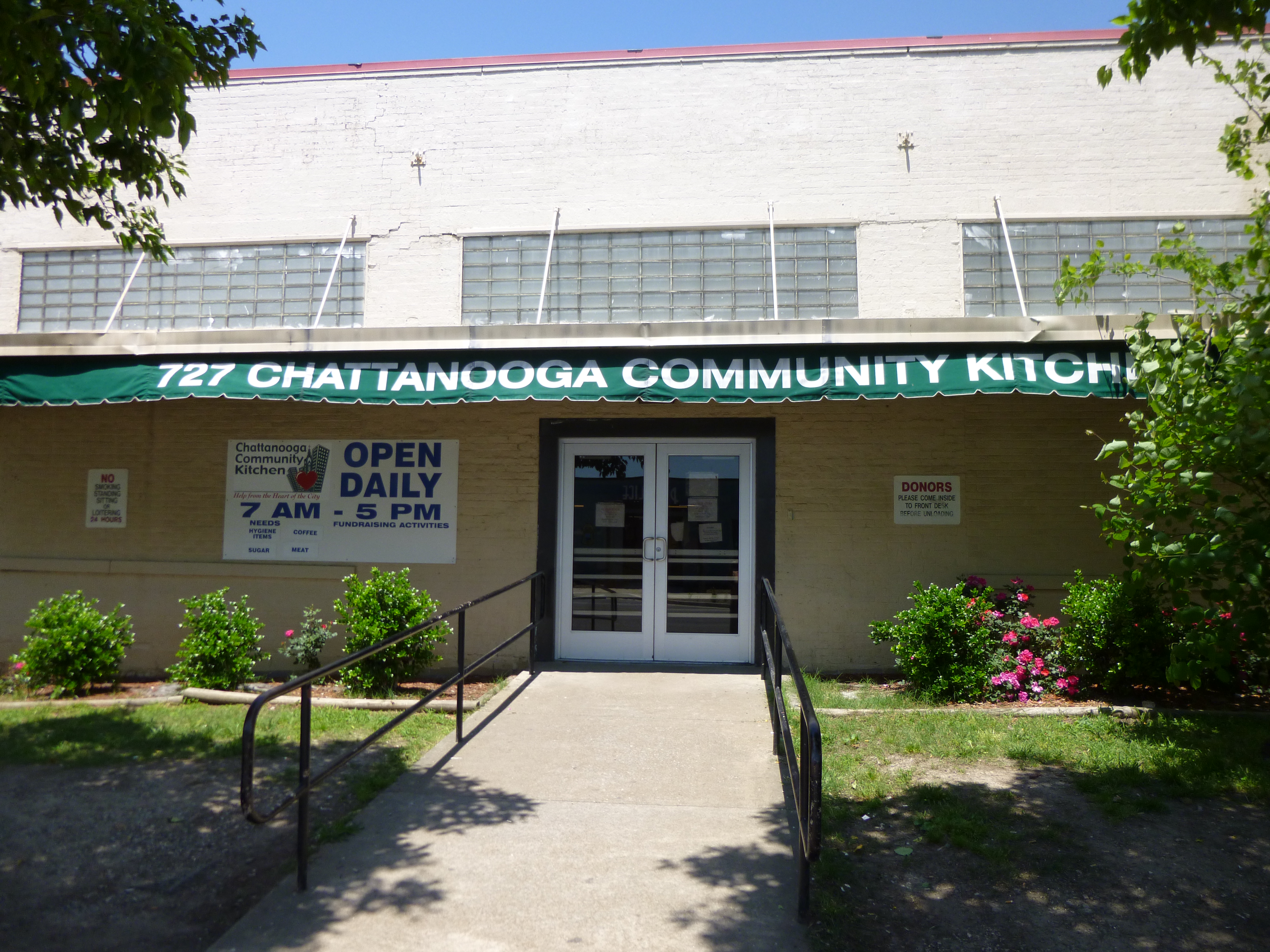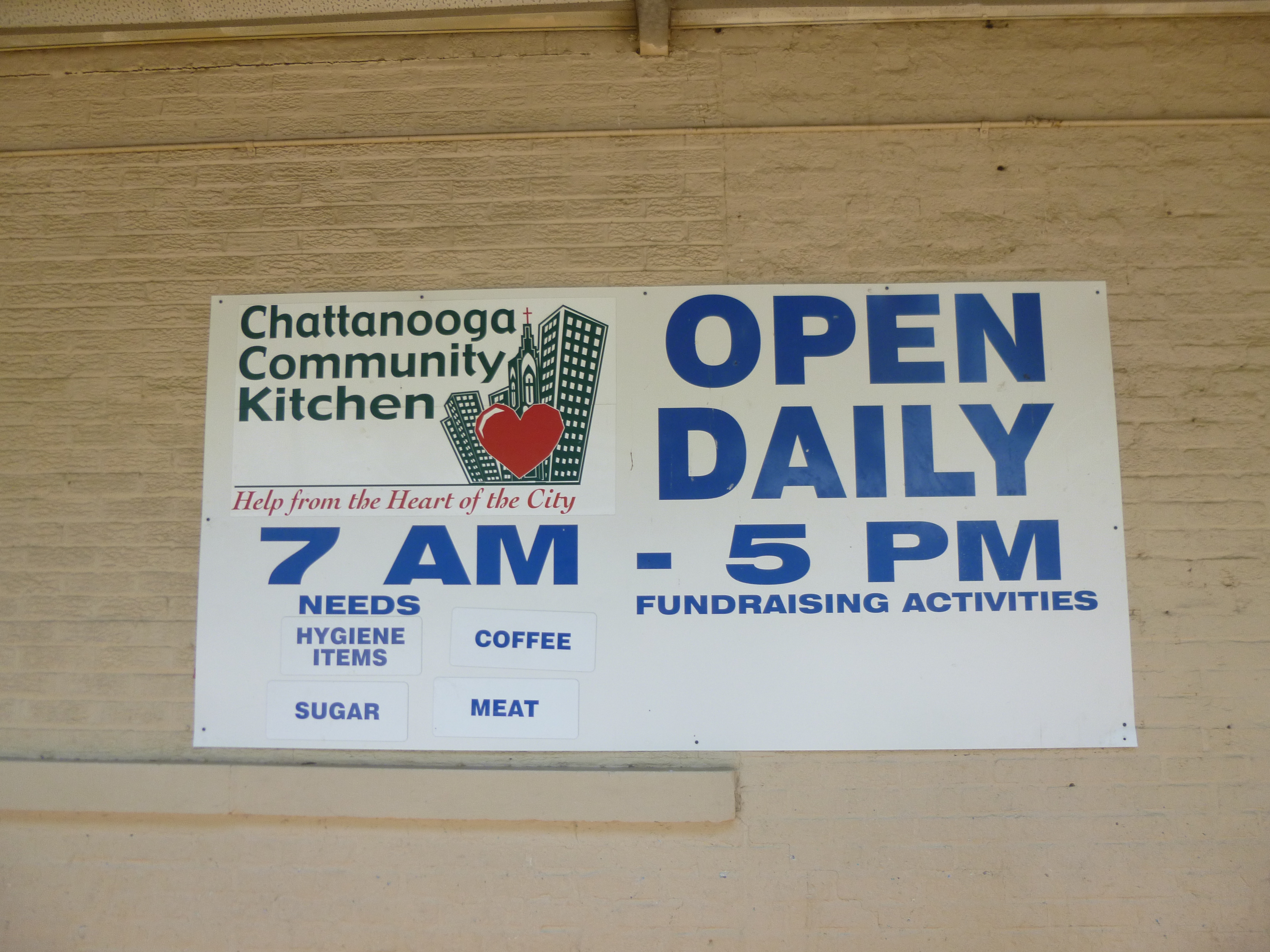 I finished the drive through Georgia, and entered Tennessee by way of Chattanooga, and I hit the ground running! I had already done my homework, and had read about Chattanooga’s big soup kitchen, which was called The Community Kitchen. I had talked to someone there this morning, and had already shopped for items on their wish list. Since they’re a big organization, they asked for the big #10 size cans of baked beans and vegetables, and big sizes of oatmeal and grits since one or the other is served every morning. And that’s what I had shopped for. I found the place pretty easily, and a pleasant young man helped me carry in the bags of food. The Chattanooga Community Kitchen first opened as a feeding program in 1982, and over time has grown to cover a city block offering other services for needy people, such as showers, laundry facilities, clothes, and help in trying to move forward. The volunteers at the community kitchen provide 3 meals a day, every day of the week, 365 days a year, and their mission is “to work to lessen the struggle and despair of the homeless and needy without expectation of recompense, but out of love and compassion for human kind.”