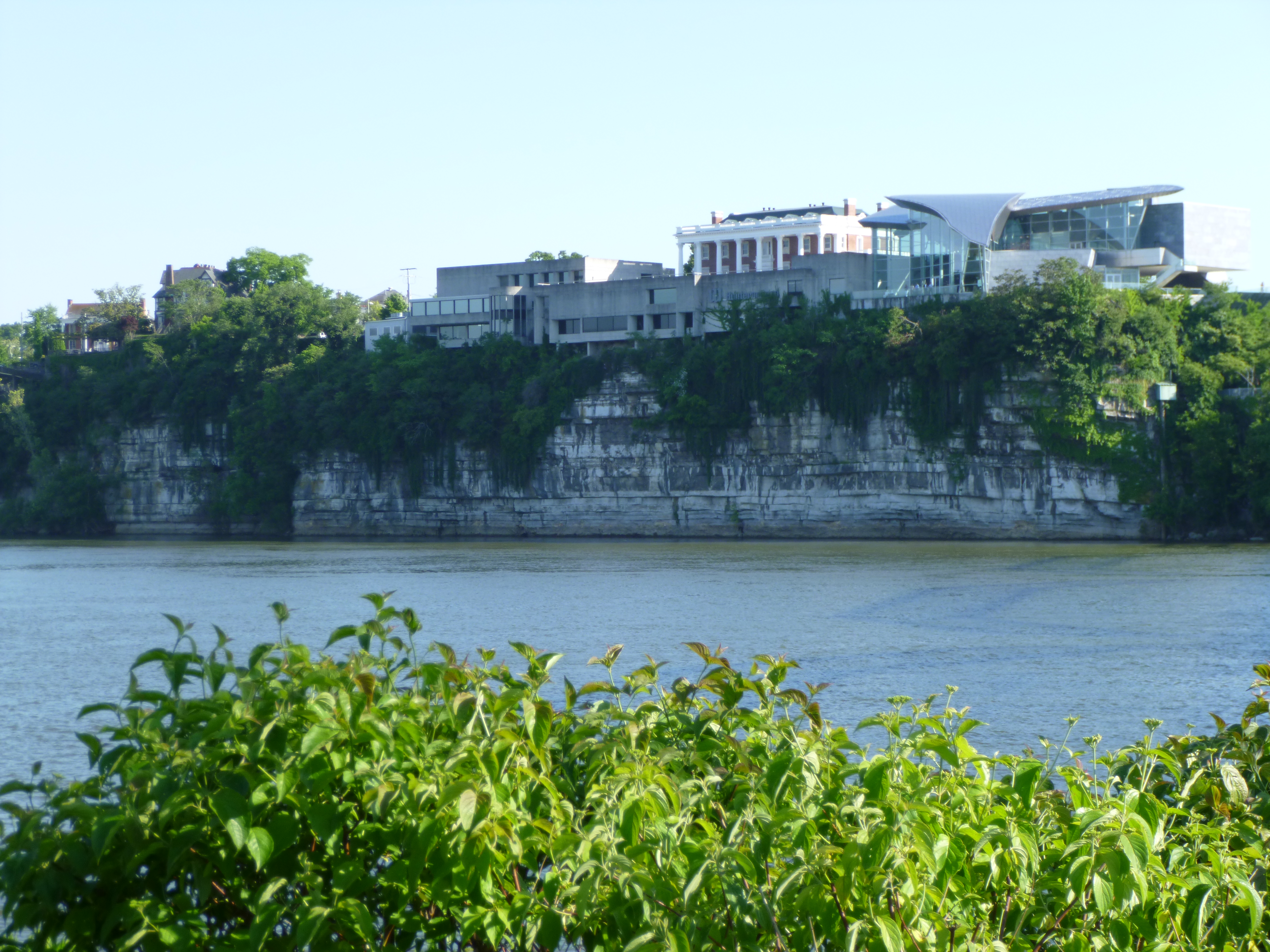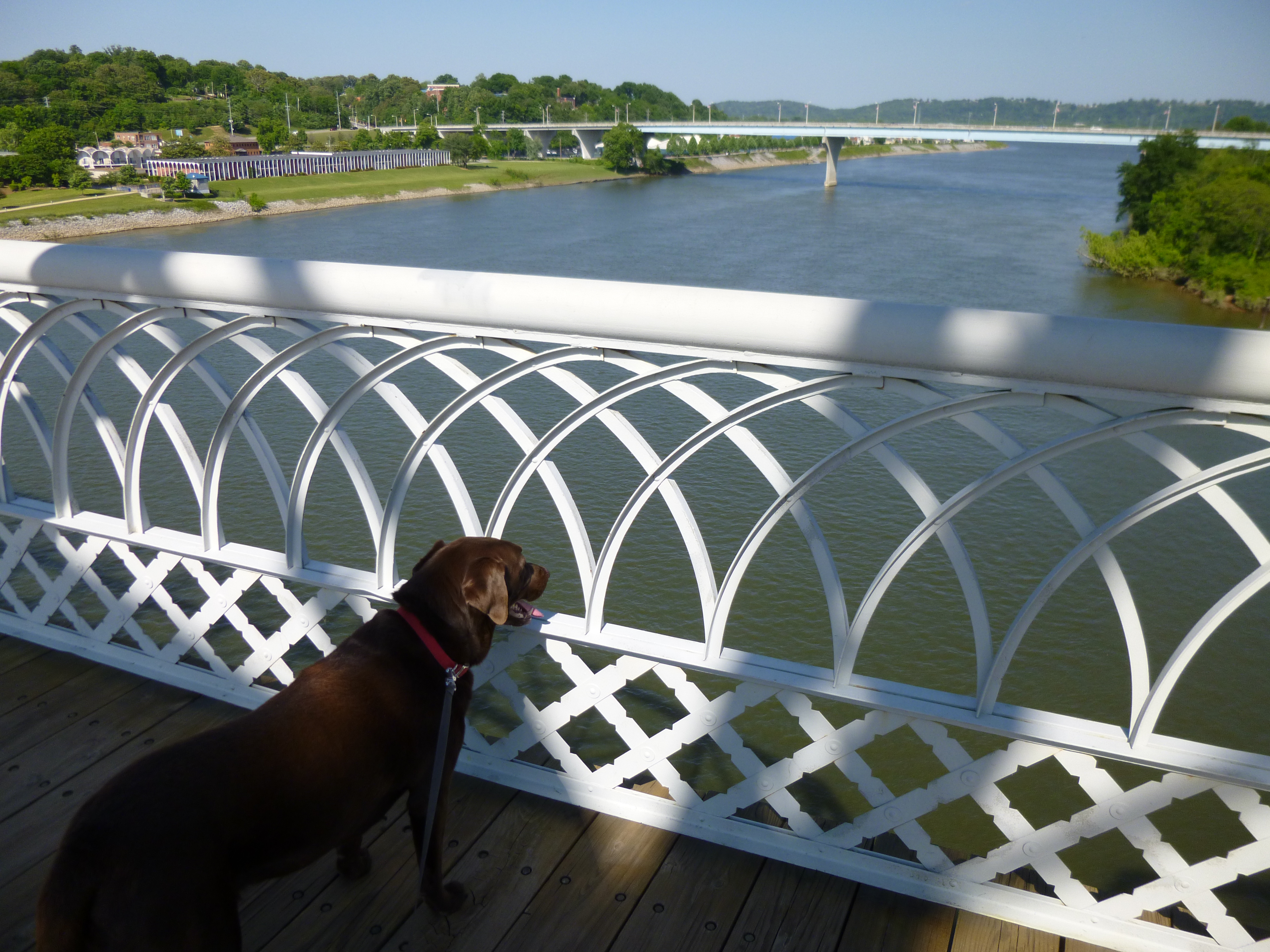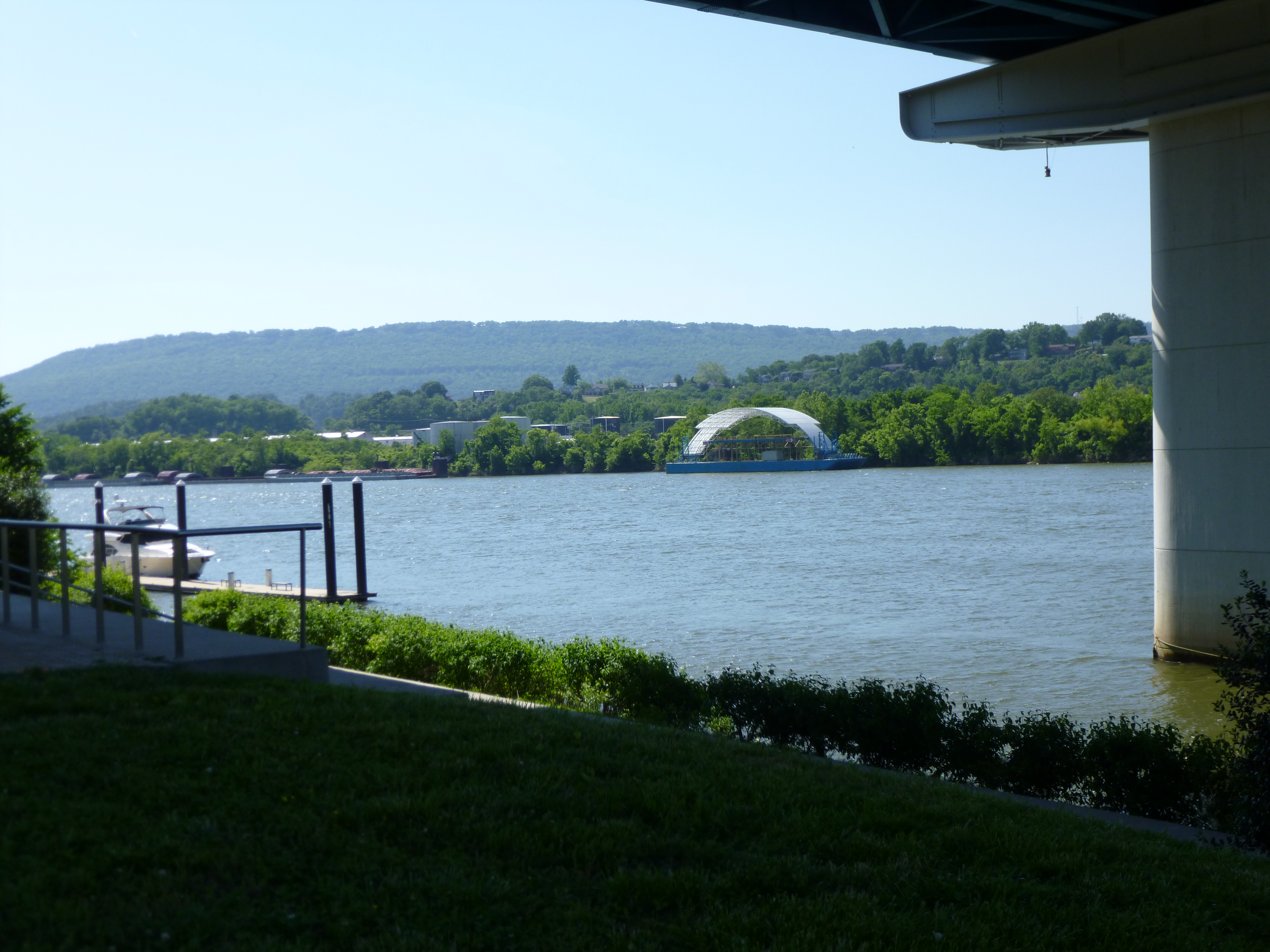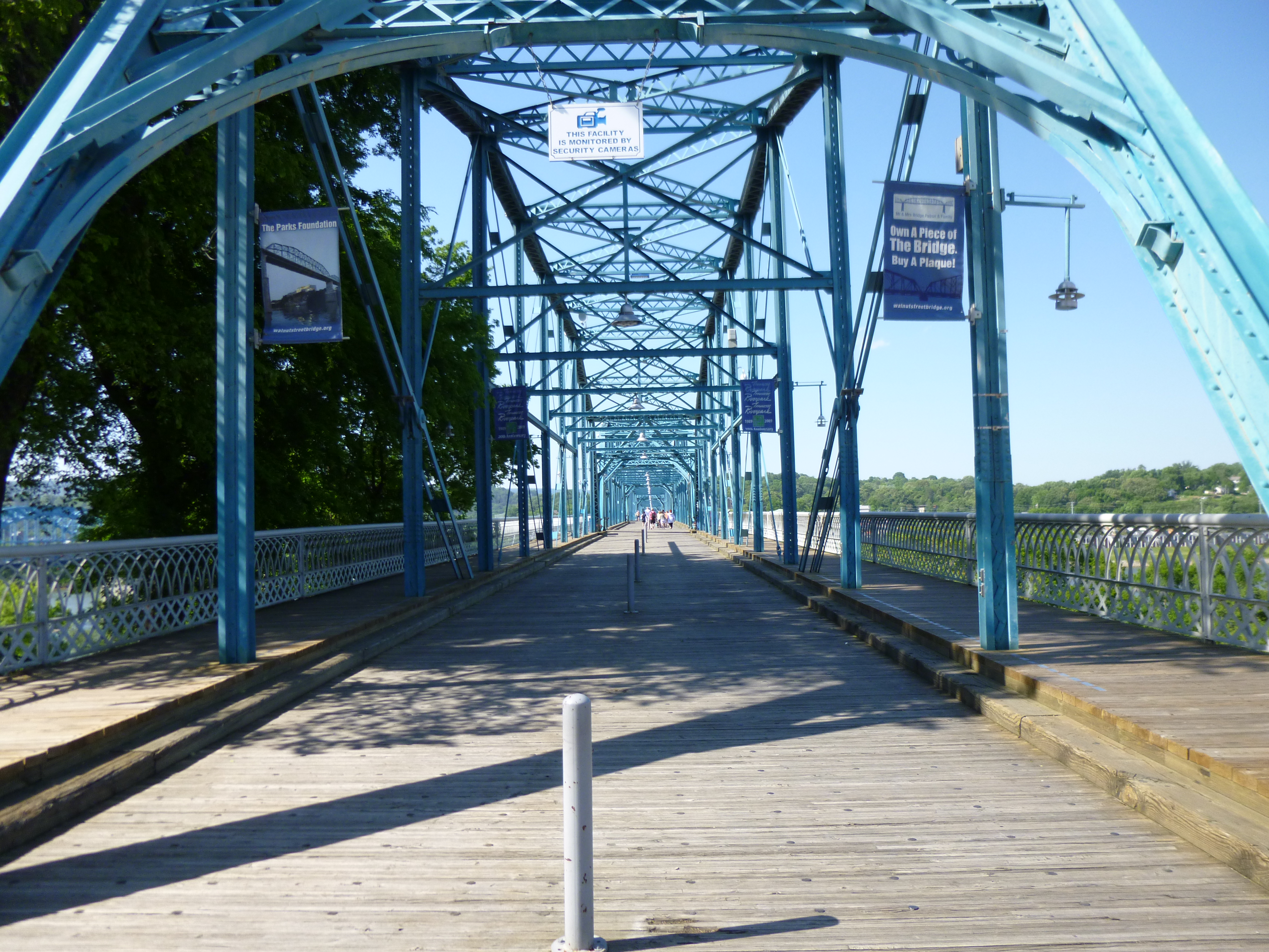 Then I drove to Chattanooga’s riverfront, where we got out for more walking. There was a nice riverfront walkway, but it wasn’t real long, so we continued on the sidewalks, and found a long pedestrian-only bridge across the Tennessee River, into the north shore part of town, where there were more parks to walk in. The Delta Queen riverboat was tied up at one of the docks and is now a hotel, and they let visitors on board in some of the front rooms. Between the riverfront walk, the pedestrian bridge, and the parks on the north side of the river, I was nearly able to finish off my walking for the day. It was a pretty city for walking since both sides of the river had good things to see.